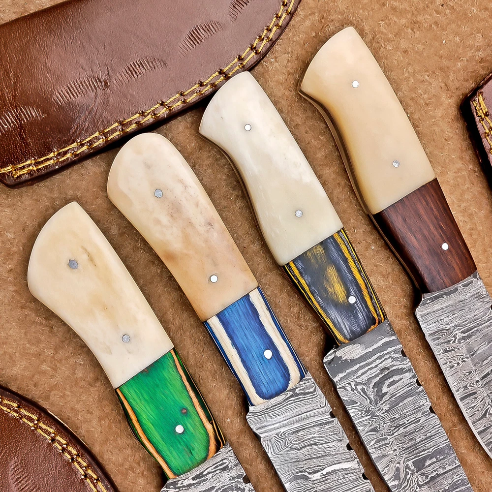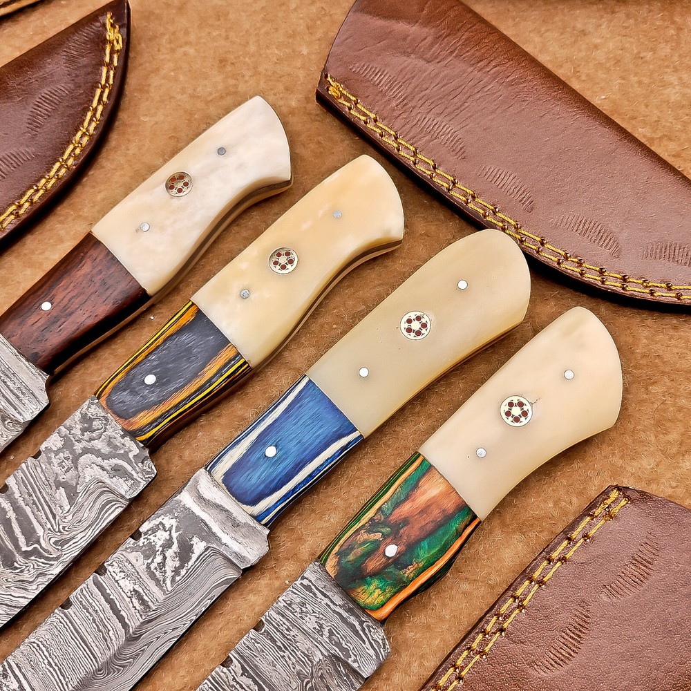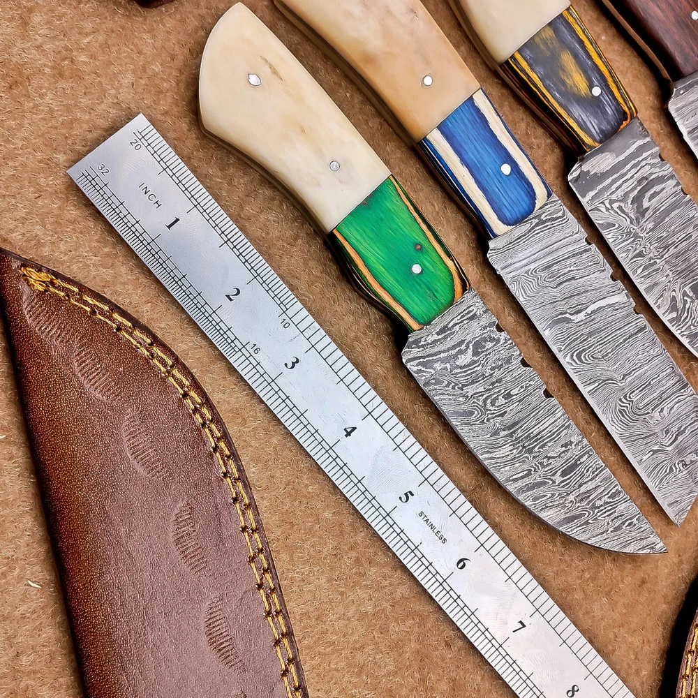 LOT OF 4 PCS! Handmade Damascus Hunting Knives , Skinner Knives Specifications: Overall Length: 8.0" Blade Thickness: ~4 mm Blade Material: Damascus Steel Handle Material: Camel bone and hard wood with brass pins mosaic pin Includes: Leather sheaths Blade Craftsmanship: Blades are made from 1095 & 15N20 High Carbon Tool Steel with over 256 layers and a hardness of 58-60 HRC for durability and sharpness. Spine of the blade tang has excellent fire work. Care Instructions: Sharpen with a Diamond Wet Stone at a 20-degree angle. Clean with soap and water, dry thoroughly, and apply gun oil. Store away from the sheath to prevent rust. Important Notes for Buyers: Verify your country’s import regulations before purchase. Customs duties, if any, are the buyer’s responsibility. Shipping & Returns: Free shipping included. 14-day return policy applies. Contact Us: Message us anytime. We respond within 24 hours. Legal Disclaimer: By purchasing this item, you acknowledge that you are at least 18 years of age and legally permitted to purchase and possess knives in your locality. It is solely the buyer’s responsibility to ensure compliance with all applicable local, state, and federal laws regarding the ownership, use, and transportation of this item. This knife is intended strictly for lawful purposes such as culinary use, collection, or display. The seller accepts no responsibility or liability for any misuse, injury, damage, or legal issues arising from the use or resale of this product. By completing this transaction, the buyer agrees to all stated terms and conditions. Important Note for International Buyers: Please ensure that you are aware of your country’s import laws before placing an order. Any customs duties, taxes, or import restrictions are solely the buyer’s responsibility. We are not liable for any delays, confiscations, or charges imposed by your local customs authority.