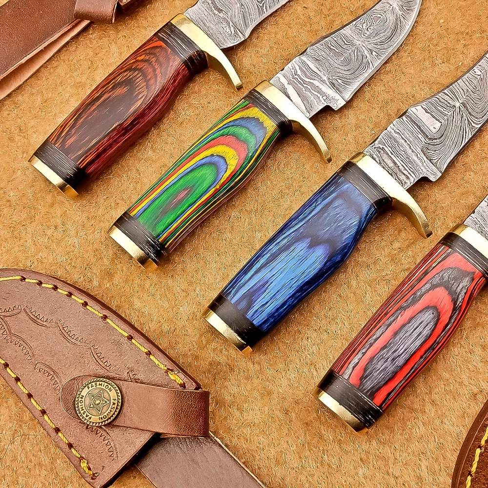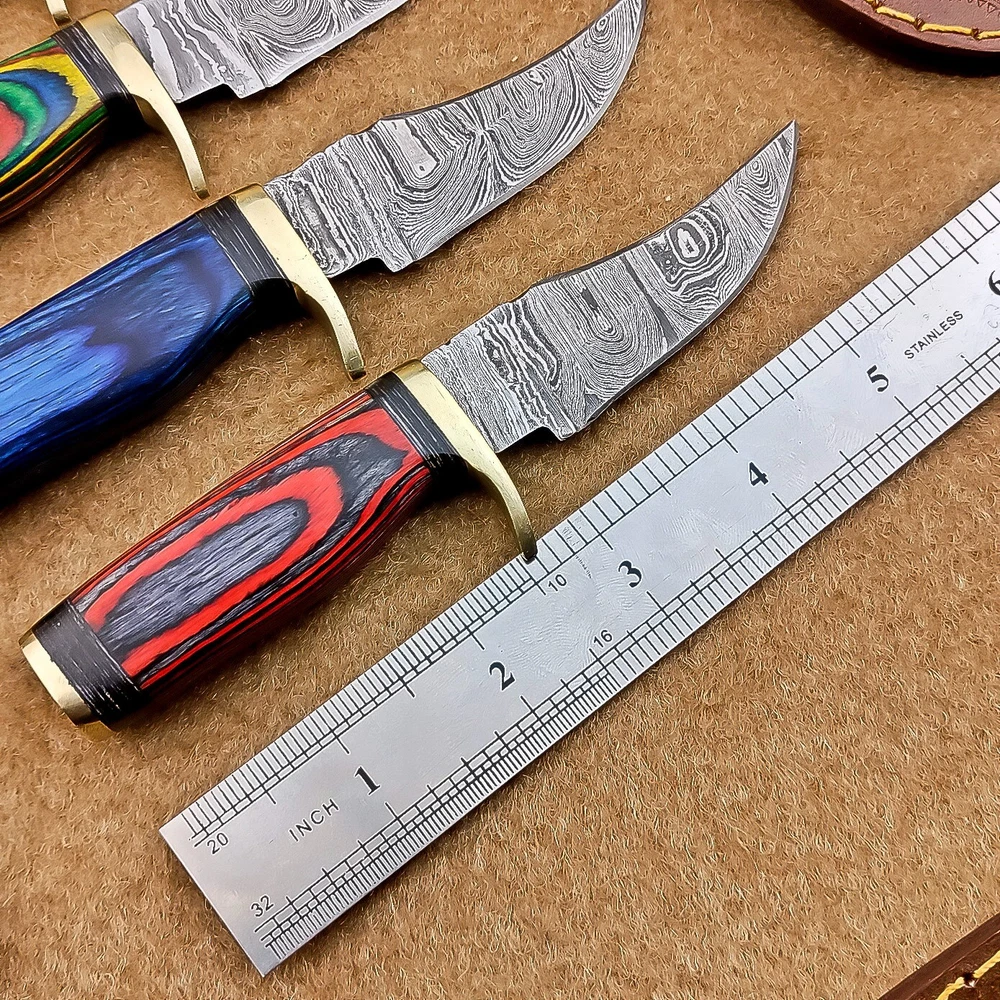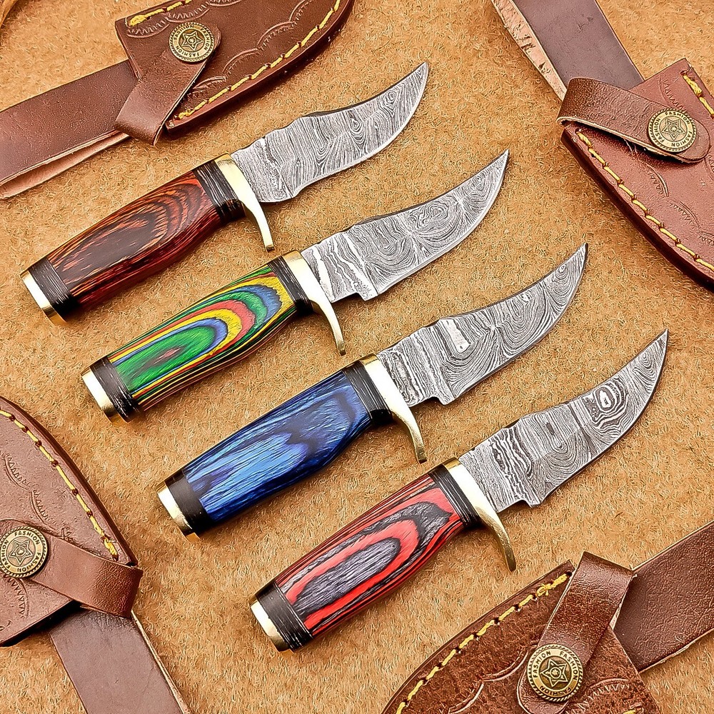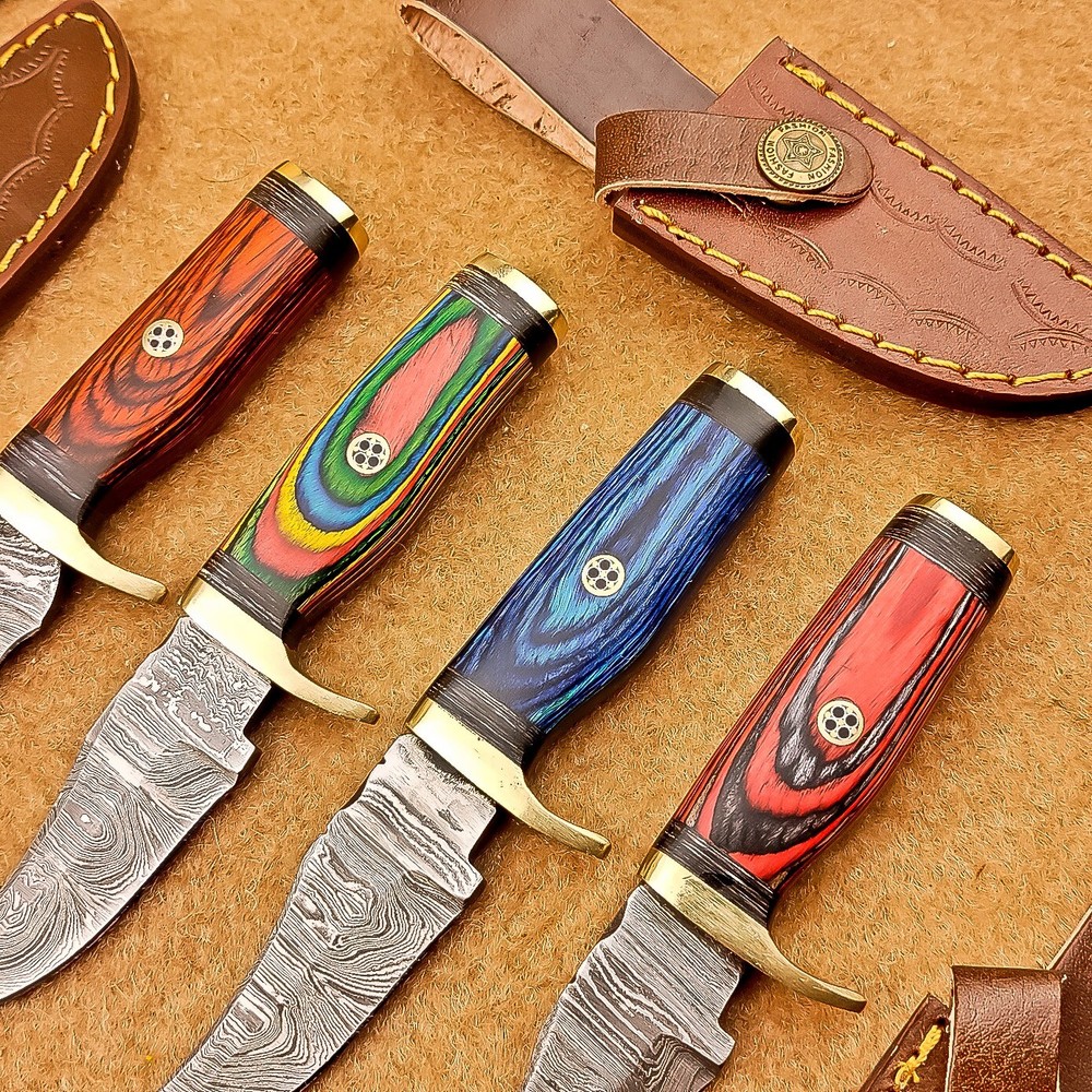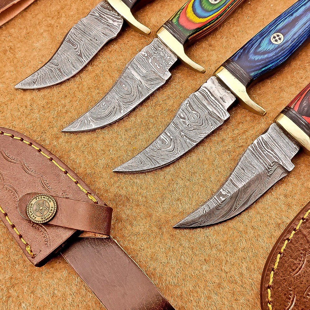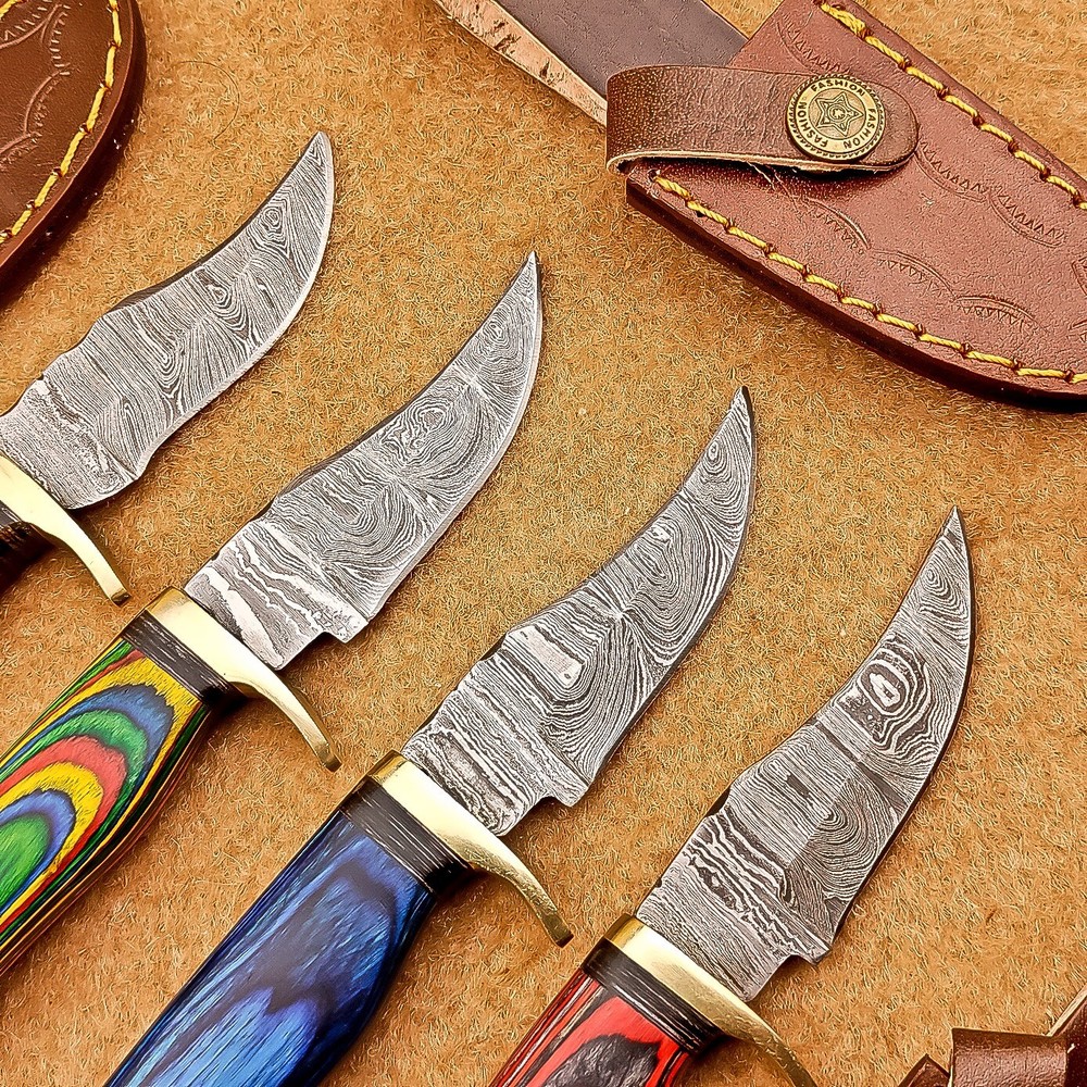 LOT OF 4 PCS! Handmade Damascus Hunting Knives , Skinner Knives Specifications: Overall Length: 6.0" Blade Thickness: ~4 mm Blade Material: Damascus Steel Handle Material: Hard wood with mosaic pin and Brass bolster Includes: Leather sheaths Blade Craftsmanship: Blades are made from 1095 & 15N20 High Carbon Tool Steel with over 256 layers and a hardness of 58-60 HRC for durability and sharpness. Spine of the blade tang has excellent fire work. Care Instructions: Sharpen with a Diamond Wet Stone at a 20-degree angle. Clean with soap and water, dry thoroughly, and apply gun oil. Store away from the sheath to prevent rust. Important Notes for Buyers: Verify your country’s import regulations before purchase. Customs duties, if any, are the buyer’s responsibility. Shipping & Returns: Free shipping included. 14-day return policy applies. Contact Us: Message us anytime. We respond within 24 hours.