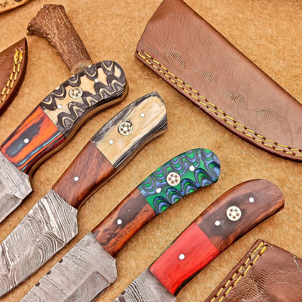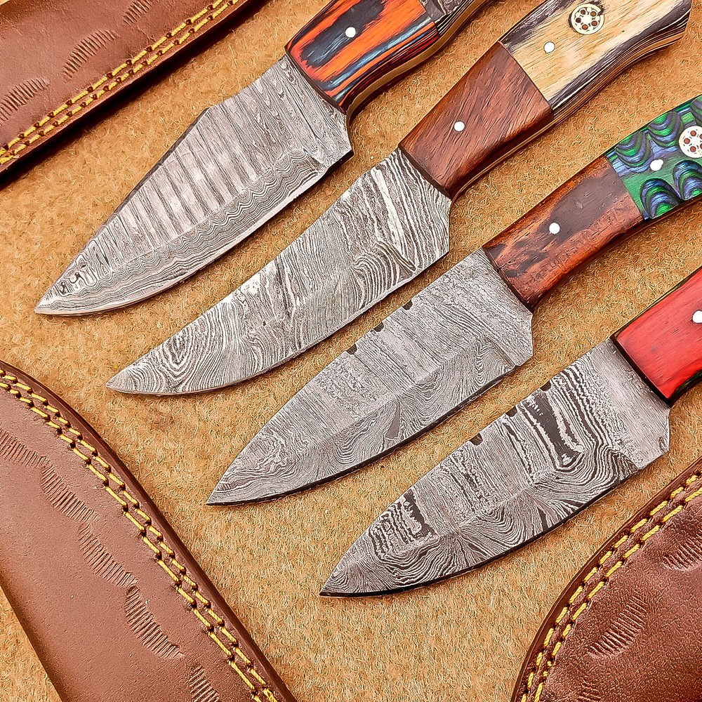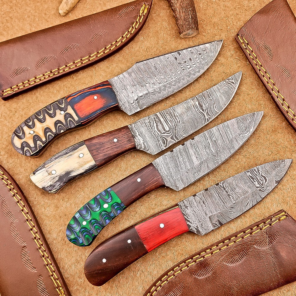 LOT OF 4 PCS! Handmade Damascus Hunting Knives , Skinner Knives Specifications: Overall Length: 7.0" Blade Thickness: ~4 mm Blade Material: Damascus Steel Handle Material: wood with brass pins mosaic pin Includes: Leather sheaths Blade Craftsmanship: Blades are made from 1095 & 15N20 High Carbon Tool Steel with over 256 layers and a hardness of 58-60 HRC for durability and sharpness. Spine of the blade tang has excellent fire work. Care Instructions: Sharpen with a Diamond Wet Stone at a 20-degree angle. Clean with soap and water, dry thoroughly, and apply gun oil. Store away from the sheath to prevent rust. Important Note for International Buyers: Please ensure that you are aware of your country’s import laws before placing an order. Any customs duties, taxes, or import restrictions are solely the buyer’s responsibility. We are not liable for any delays, confiscations, or charges imposed by your local customs authority. Shipping & Returns: Free shipping included. 14-day return policy applies. Contact Us: Message us anytime. We respond within 24 hours. Legal Disclaimer: By purchasing this item, you acknowledge that you are at least 18 years of age and legally permitted to purchase and possess knives in your locality. It is solely the buyer’s responsibility to ensure compliance with all applicable local, state, and federal laws regarding the ownership, use, and transportation of this item. This knife is intended strictly for lawful purposes such as culinary use, collection, or display. The seller accepts no responsibility or liability for any misuse, injury, damage, or legal issues arising from the use or resale of this product. By completing this transaction, the buyer agrees to all stated terms and conditions.