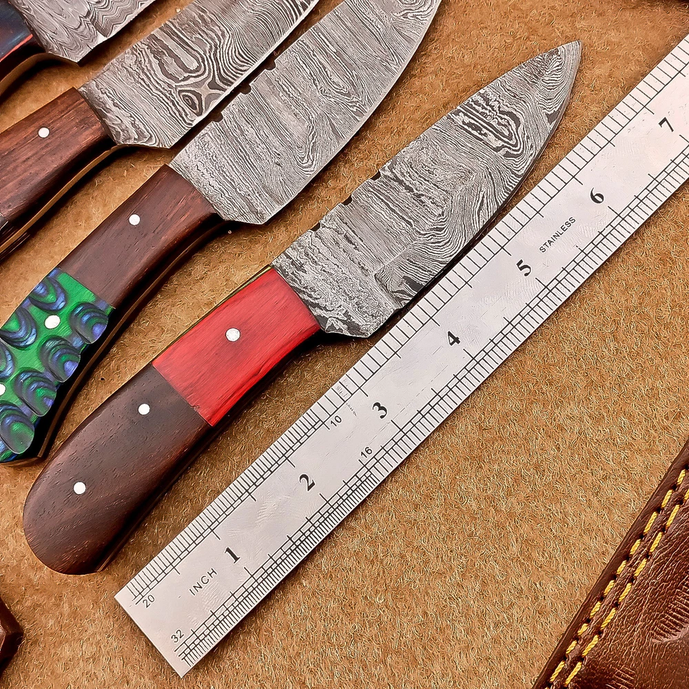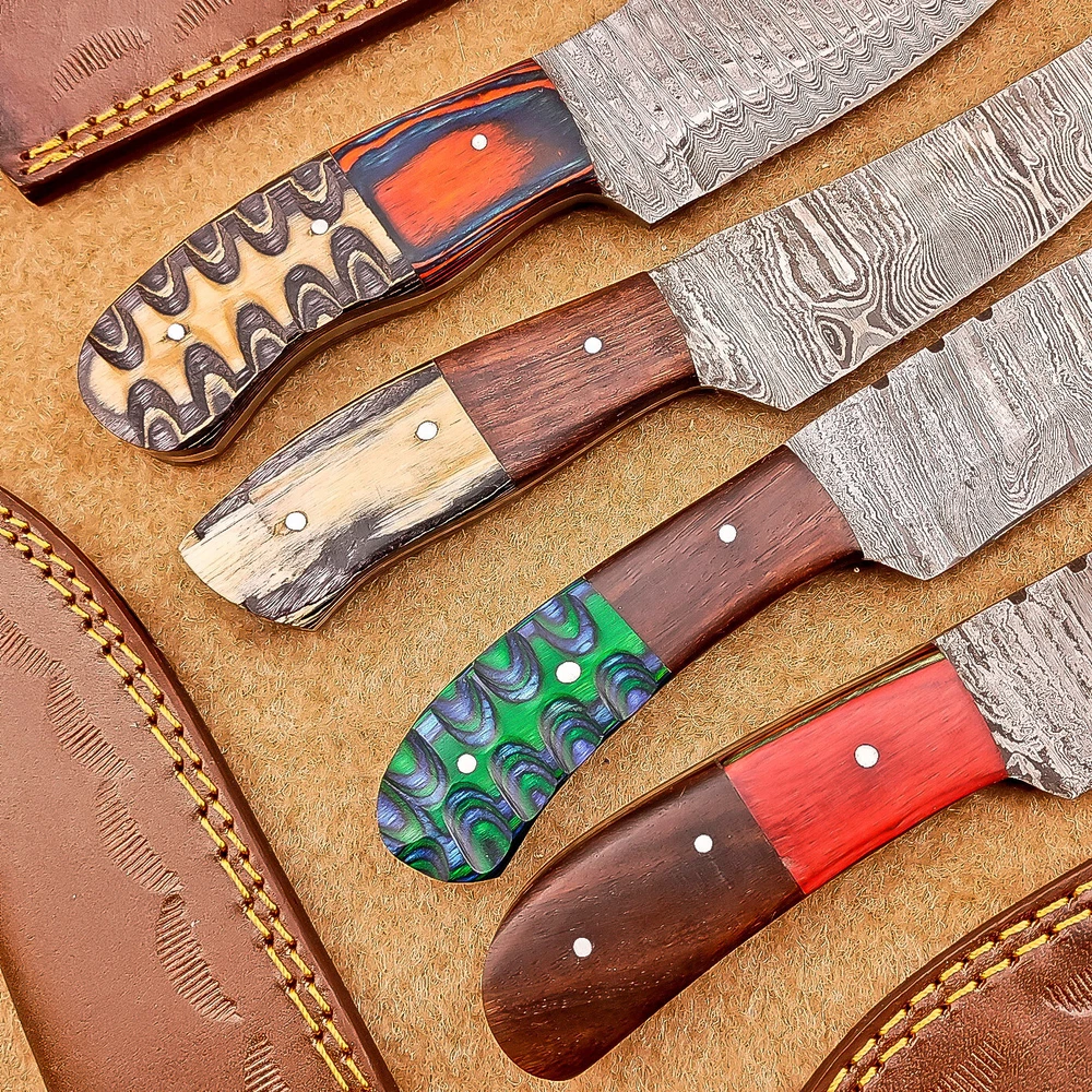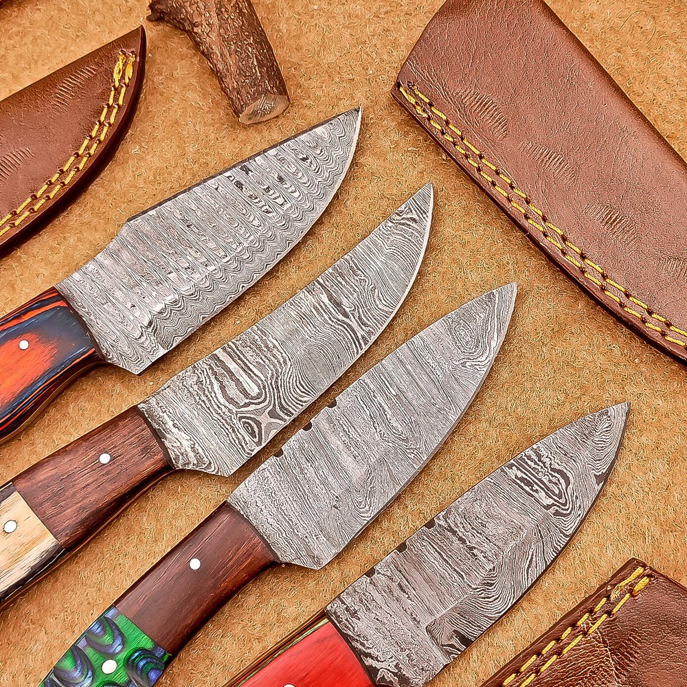 $ 8.584-Piece Damascus Skinner Knife Set with 8-inch Blades, Hardwood Handle & Leather Sheath IT-1241