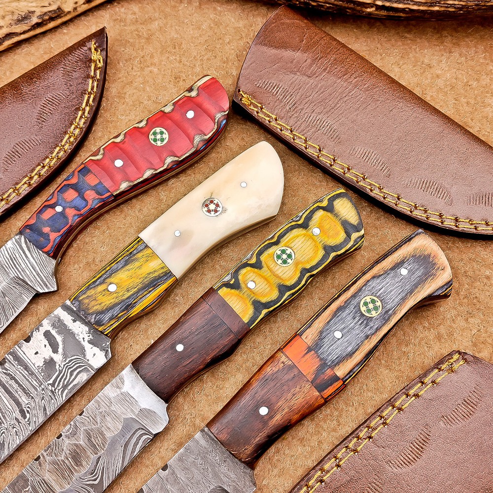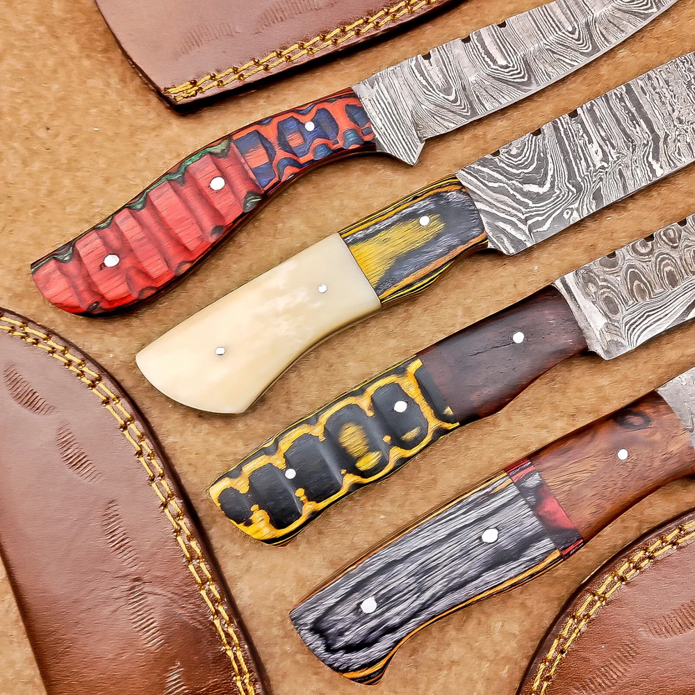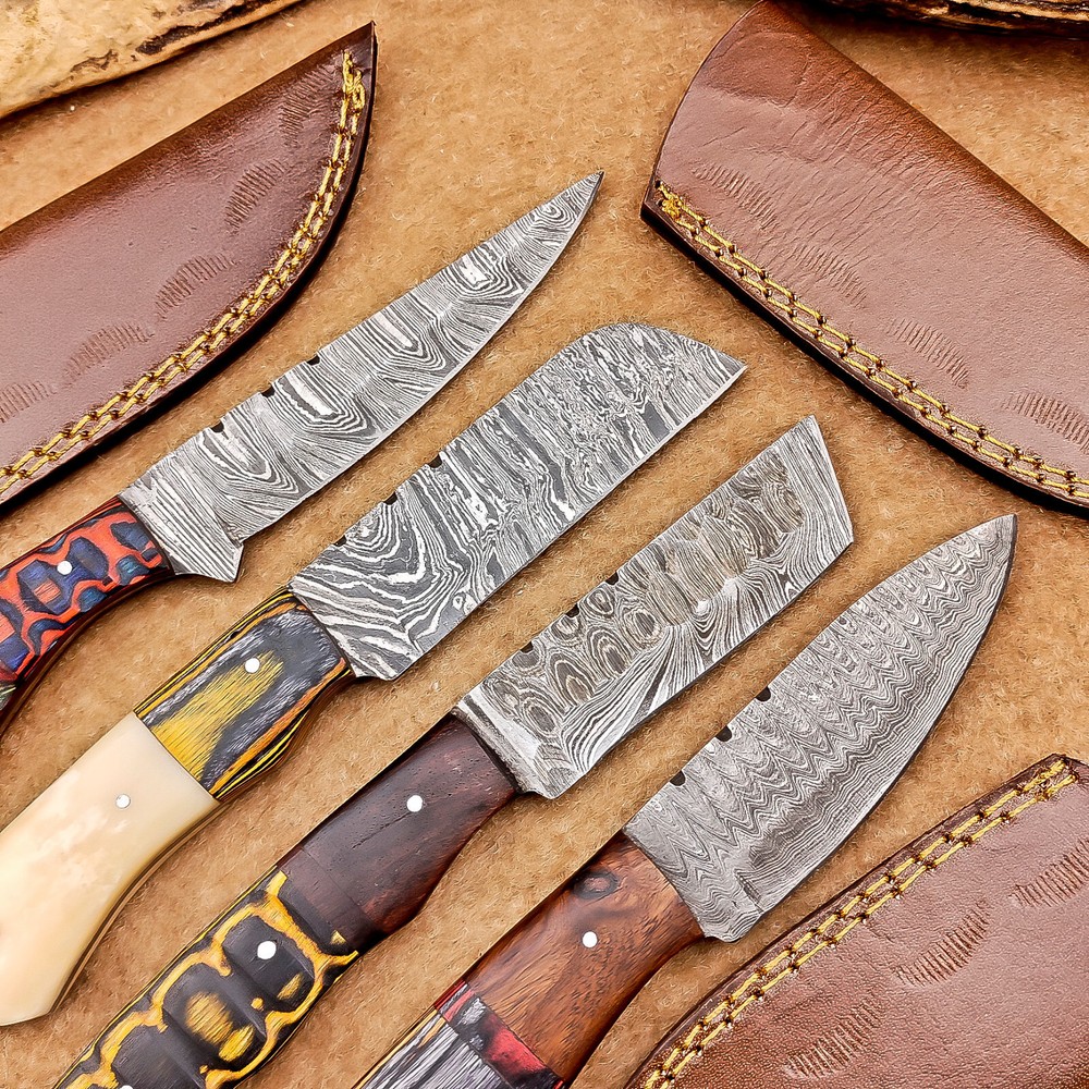 4-Piece Damascus Steel Skinner Knives Set with Wood Handles and Leather Sheath | 8-Inch Blades IT-1528