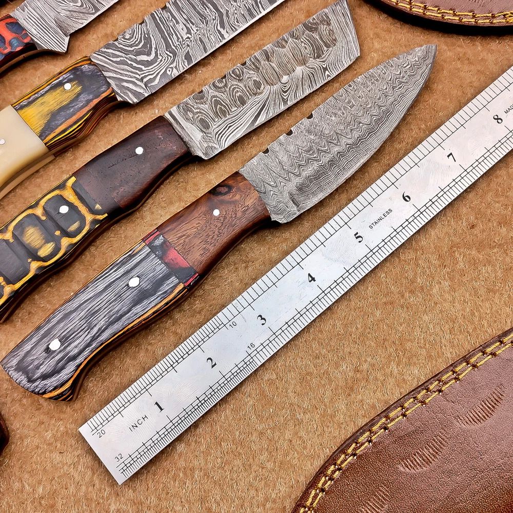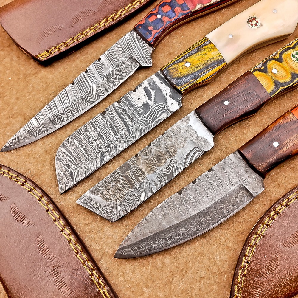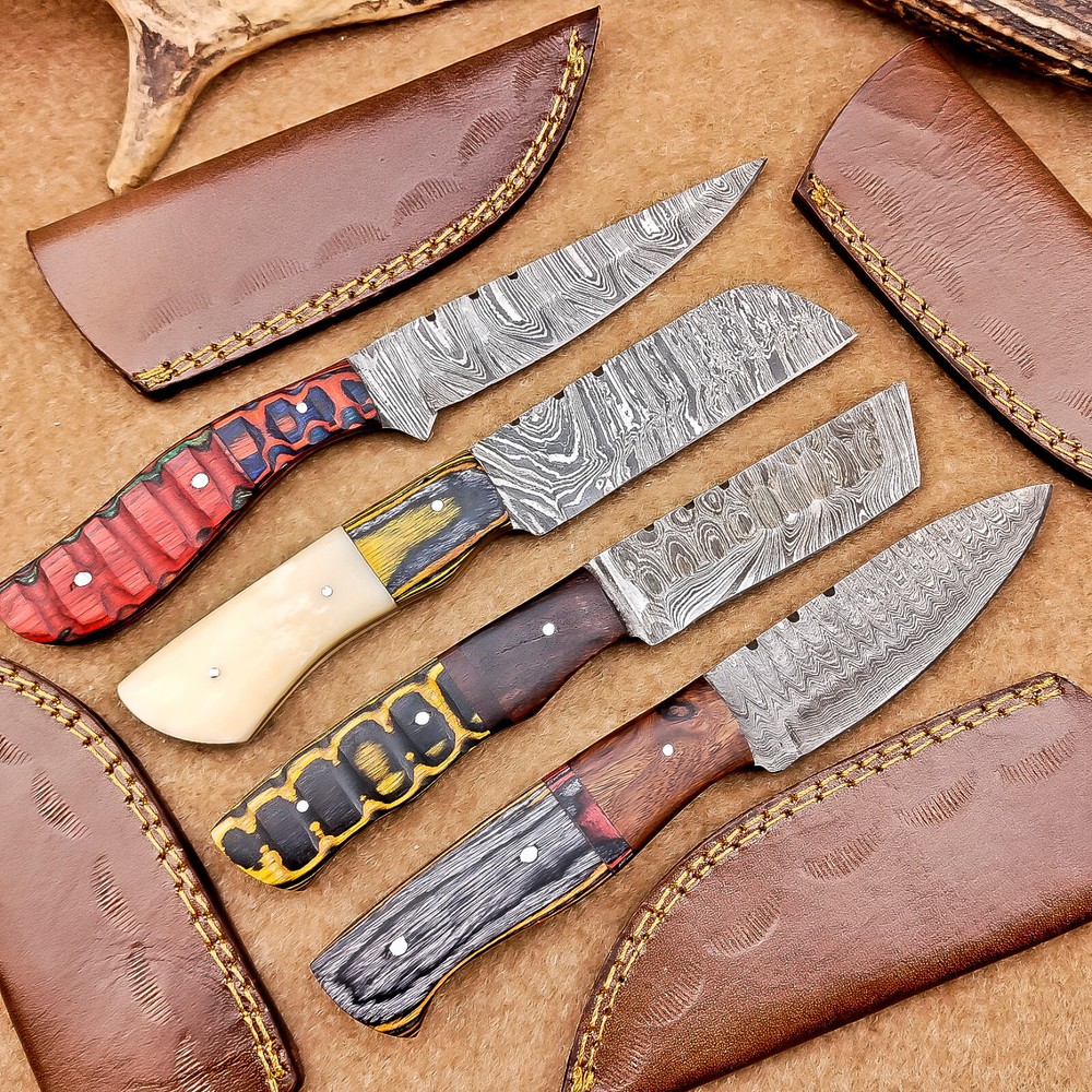 LOT OF 4 PCS! Handmade Damascus Hunting Knives , Skinner Knives Specifications: Overall Length: ~ 8.0" Approx. Blade Thickness: ~4 mm Blade Material: Damascus Steel Handle Material: Hard wood with brass pins mosaic pin Includes: Leather sheaths Blade Craftsmanship: Blades are made from 1095 & 15N20 High Carbon Tool Steel with over 256 layers and a hardness of 58-60 HRC for durability and sharpness. Spine of the blade tang has excellent fire work. Care Instructions: Sharpen with a Diamond Wet Stone at a 20-degree angle. Clean with soap and water, dry thoroughly, and apply gun oil. Store away from the sheath to prevent rust. Important Note for International Buyers: Please ensure that you are aware of your country’s import laws before placing an order. Any customs duties, taxes, or import restrictions are solely the buyer’s responsibility. We are not liable for any delays, confiscations, or charges imposed by your local customs authority. Shipping & Returns: Free shipping included. 14-day return policy applies. Contact Us: Message us anytime. We respond within 24 hours. Legal Disclaimer: By purchasing this item, you acknowledge that you are at least 18 years of age and legally permitted to purchase and possess knives in your locality. It is solely the buyer’s responsibility to ensure compliance with all applicable local, state, and federal laws regarding the ownership, use, and transportation of this item. This knife is intended strictly for lawful purposes such as culinary use, collection, or display. The seller accepts no responsibility or liability for any misuse, injury, damage, or legal issues arising from the use or resale of this product. By completing this transaction, the buyer agrees to all stated terms and conditions.