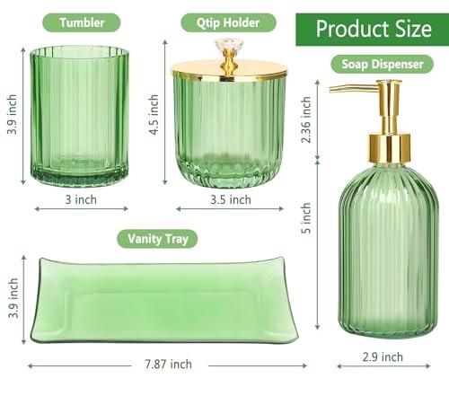 Return Policy Fast Delivery Trusted seller Bathroom Accessories Set, 4 Pcs Green Glass Bathroom Accessory Set Complete w/Lotion Soap Dispenser, Toothbrush Holder, Qtip Holder, Vanity Tray, Gold Bathroom Decor, Gift for Home Apartment Product Description Glass MULTIFUNCTION GREEN GLASS BATHROOM ACCESSORIES SET -- 4 pieces bathroom set includes a Lotion Soap Dispenser, a Vanity Tray, a Qtip Holder, and a Toothbrush Holder, Perfect for storing your toiletries or your cosmetics, the green tray can also hold your jewelry and keeping your bathroom counter fully organized and neatly DECORATIONS FOR HOME APARTMENT / BATHROOM -- The green glass bathroom set is ideal decoration fits various styles: bathroom decor, industrial style, western decor, modern style, contemporary decor, and country decor. Ideal bathroom accessories set for home decor, bathroom decor, and farmhouse decor. Great for the kitchen and bath, for countertop organize, vanity top, makeup table, and craft PREMIUM STURDY MATERIAL-- All pieces of bathroom accessory set are made of high-quality pressed heavy glass, with a nice weight, non-cheap plastic, and Easy to clean. Green cups are as clear as green crystals. High-quality stainless steel lid, gold plating process, beautiful and not rusty GREAT GIFTS IDEA -- A perfect gift for family, friends, and coworkers; perfect as a housewarming present, wedding gift, and perfect for remodelers looking to upgrade the bathroom in their home or apartment; bathroom essentials for a new home; guest bathroom decor 100% CUSTOMER SERVICE-- We are committed to presenting the best quality materials and satisfaction services to our customers. If you have any issue with the contemporary bathroom accessories set, please contact us, we will be happy to help you Shipping Returns Payment Shipping Shipping is FREE to all addresses other than APO/PO boxes in the lower 48 states. All our stock ships from US-based warehouses. Shipped via USPS or UPS (depending on location and package weight) Unless stated otherwise, all orders will ship within 24-72 hours of your payment being processed. Check our feedback to see the great reviews of FAST shipping we offer. Returns Seller does not accept returns Payment We currently accept payment via eBay managed payments only. Once payment is cleared, we will dispatch your shipment within 1-3 business days. Please refer to the "Shipping" tab for more information regarding shipping speed to your destination.
