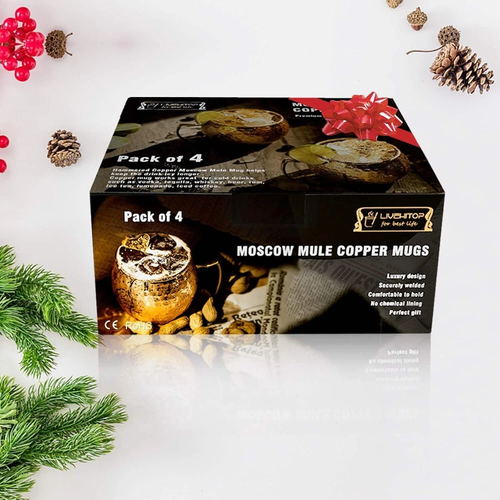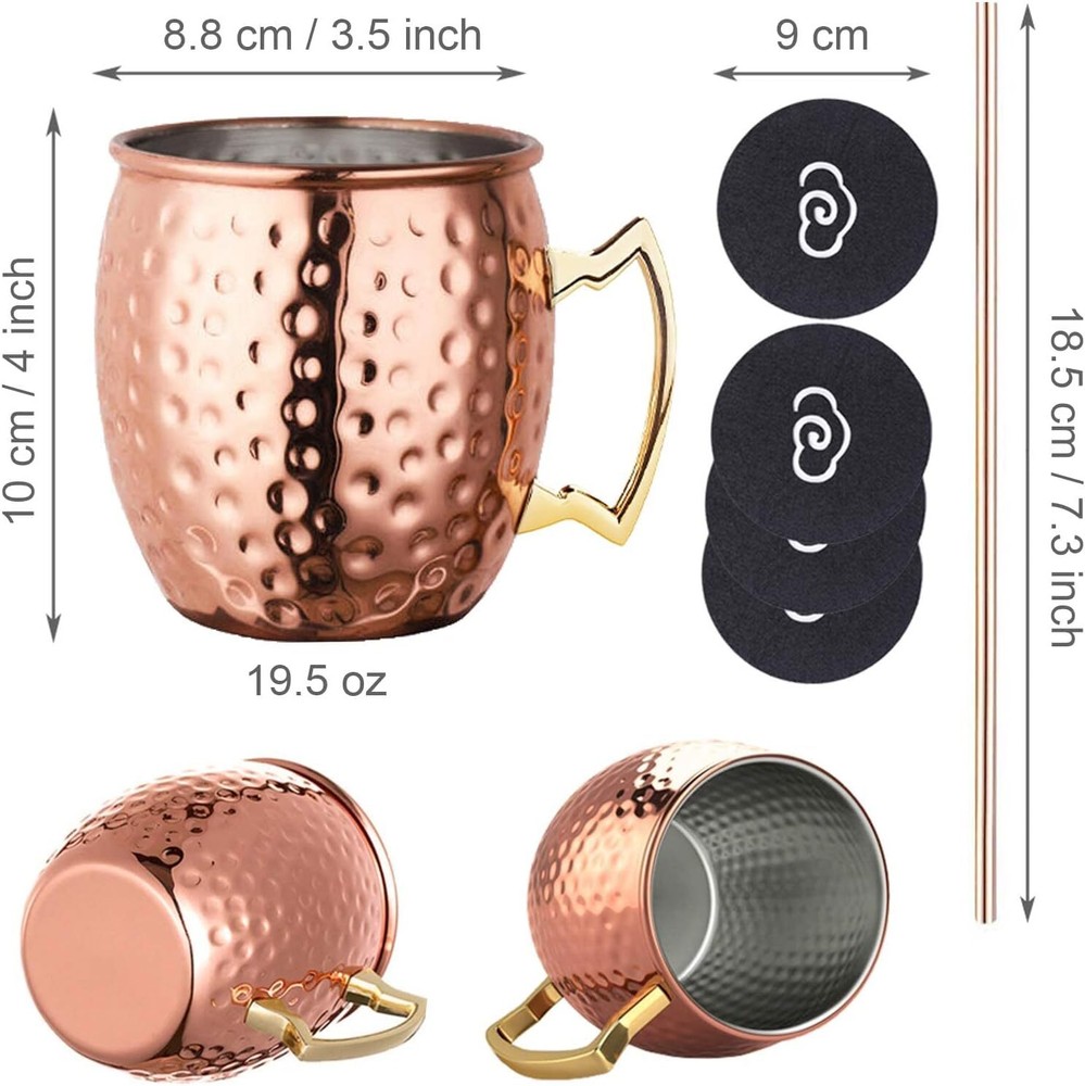 【🍻 Premium Copper Mugs Set】- Moscow Mule Copper Mugs Set of 4 handcrafted and polished hammered finished. Premium quality, smooth and food safe. No harmful chemical coatings. No sharp and rough edges. Securely welded handle is durable and comfortable to hold. 4 coasters are included. 【🍸 Luxury Vintage Design】- Moscow mule mugs with luxury surface look shiny, vintage and elegant. Special for cocktail enthusiasts and icy drinks lovers. Copper cups are also beautiful decoration anywhere it’s placed. 【🍺 Proper Size】- copper mugs has proper capacity of 580ml / 19.5 oz. To make Moscow Mule with proper Lime Juice, Vodka, Ice Cub, Chilled Ginger Beer and Mint in the moscow mule cups, you will enjoy authentic Moscow Mule cocktails! 【🍶 Perfect For Cold Drinks】- Copper moscow mule mug help keep drinks icy longer and create better taste! Perfect for those who love proper Moscow Mules and all icy cold drinks, such as cocktail, odka, tequila, whiskey, beer, rum, ice tea, lemonade, iced coffee, etc. 【🎁 Special Gifts】- A special gift for families and friends for Birthday, Valentines’ Day, Christmas, New Year, Mothers’ Day, Fathers’ Day. Suitable for Home, Bar, Party, Wedding, Celebration, Spring, Summer, Autumn, Winter, and other happy times.