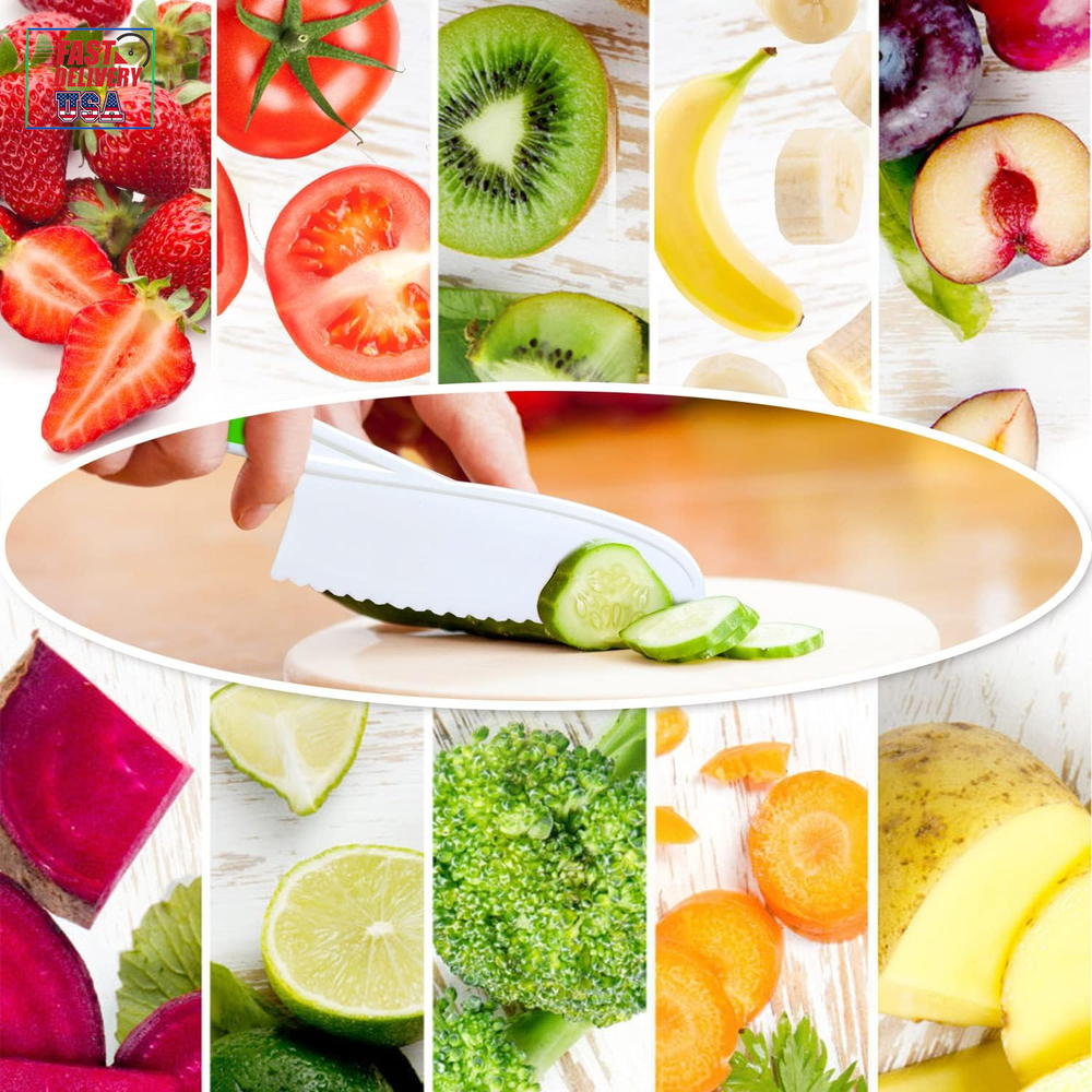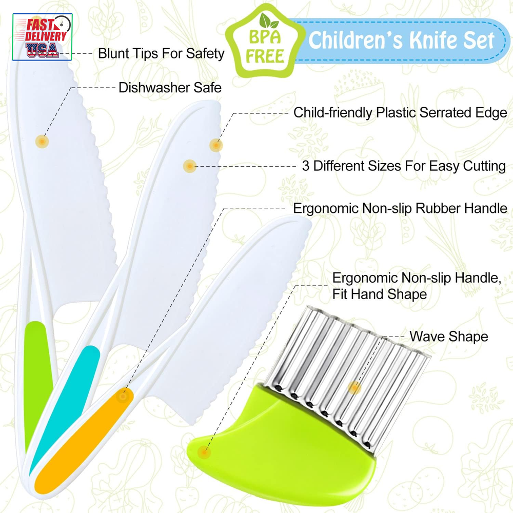 Store New Arrivals Add to Favorite View Feedback Contact 4 Pcs Kids Knife Set, Nylon Kitchen Knife with Crinkle Cutter, Serrated Edges Plastic Toddler Chef Knife for Real Cooking & Cutting Fruit Bread Description Blade Edge Serrated Color Multicolor Is Dishwasher Safe Yes Item Weight 5.6 ounces Handle Material Rubber, Plastic, Nylon Item Length 10.83 Inches Blade Length 0.1 Inches Blade Material Plastic 【Amazing and Fun Kids Chef‘s Knife】: The kids knife set includes 1 small, 1 medium, 1 large nylon toddler knife and 1 crinkle cutter, try this wavy cutter to make a wavy apple, banana or french fries. Let your kids show their creative talent in the kitchen. And enjoy seeing them become more skilled while establishing better knife habits 【Long-lasting Material】: These kid friendly knives are made of high quality nylon material, with serrated edges for precision cutting. The rubber handles ensure a firm grip. Not easy to break or deform, can give you a good using experience. Children ages 4+ can use them under adult supervision 【Versatile Kids Knife】: These plastic chef knives for kids can cut many types of fruit, bread, cake and more. Perfect salad knife or lettuce knife for your little chef. Hand them these kid safe knives and prepare a special family-cooked meal together 【Great Gift For Kids】: If you are searching for an efficient kids knife for real cooking, we’ve got you covered! Allow kids to join your kitchen and become independent chef! Finding a common interest with your kid and make memories together. It is the perfect gift idea for your kids on their birthdays or during holidays 【Satisfaction Guaranteed】: Your satisfaction is our priority. If there are any issues with your nylon knife set, please contact us and we will make it right. Good customer service, all your questions will be replied within 12hrs. Add the kids chef cutting knife and crinkle cutter to cart and build your kids confidence now! Product Description Let your kids show their creative talent in the kitchen. Enjoy seeing them become more skilled while establishing better knife habits! Is your kid eager to be creative in the kitchen? Do they always want to help in the kitchen? ✔Well, have a try with these 4-piece nylon knife set for kids, they can cut many types of foods, including lettuce, spinach, apple, banana, cucumbers, strawberry, cheese, cake and more! ✔Let your kids join you in your kitchen activities, preparing them to be independent and prepare a special family-cooked meal together. Kids' First Step Toward Kitchen Independence Ergonomic safe design: Our children kitchen knife set feature serrated cutting edges that cut effectively without being sharp to the touch. The rubber handle ensures a firm grip, which is carefully crafted for small hands, ensuring your child can safely cut food. Bright and fun toddler chef's knives: The kids cooking knife set includes 1 small, 1 medium, 1 large plastic children knife and 1 crinkle cutter, try this wavy cutter to make a wavy apple, banana or french fries. Also, each knife has a bright color, making the learning experience more interesting. Package Includes: 3 pieces kids safe kitchen knives 1 piece crinkle cutter TAORISH KIDS KNIFE SET Made from high quality plastic material, durable Serrated edges for precision cutting Compact, lightweight and easily carried Easy to use and easy to clean Parental supervision advised Wide Range of Occasions: These kids knives can be used in many occasions, such as birthday party, baby shower, parent-child activities, family gathering, anniversary and so on, adding charms to these occasions. Great Gift Idea: Our toddler knife set can cultivate children's hands-on ability, promote parent-child relationship, and inspire their confidence and creativity. It is the perfect gift idea for your kids on their birthdays or during holidays. ABOUT US We offer the best prices around on high quality products. Our E-store includes media such as books, movies, music and games while offering electronics, toys, sporting apparel, clothing, tools, general home, garden items and more. SHIPPING We are always working hard to ensure your package arrives as soon as possible. Please understand that some factors like weather, high postal traffic, and the performance of shipping companies are outside of our control. We offer free shipping to the lower 48 states and ship within 2 business days of payment, usually sooner. We do not accept P.O. Boxes. Please provide a physical address. For shipping outside of the continental USA, we only use eBay's Global Shipping Program.The item is shipped to KY and then sent to the rest of the world. International customers are responsible for all duties and taxes. Continue to check out in order to calculate costs for shipping the item to your country. Messages regarding eBay's Global Shipping Program MUST be directed at eBay EXCLUSIVELY. RETURNS We offer a 30-Day Return Policy on items which you are not completely satisfied with. You have the option for a full-refund or an exchange of the item. No returns are available on items shipped outside of the USA. PAYMENT We accept PayPal. CONTACT US This page content is yet to come Please ad us to your favorite seller and visit again later Thank You CUSTOMER SATISFACTION We try our very best to make sure every customer is completely satisfied. If there's a problem, message us! We're happy to help. WE ACCEPT Copyright © 2021 AutoDS. | All Rights Reserved