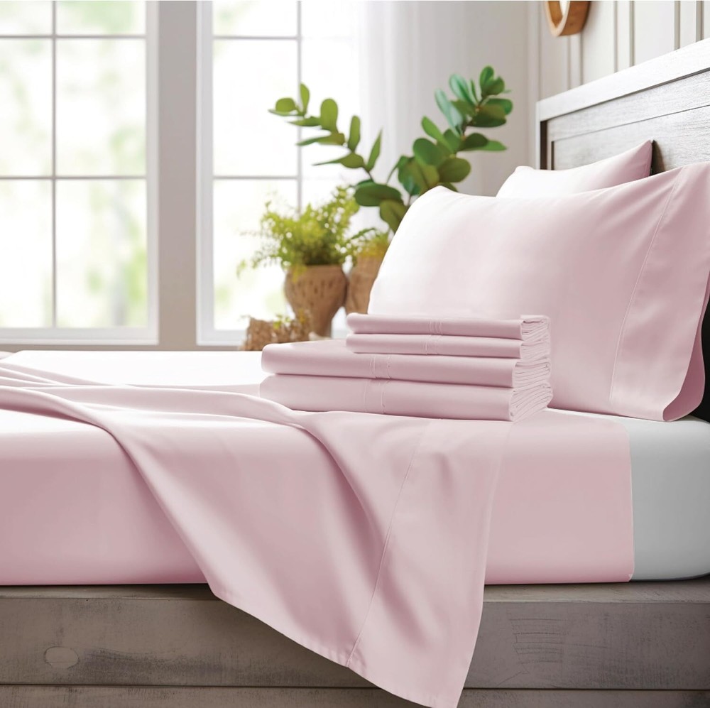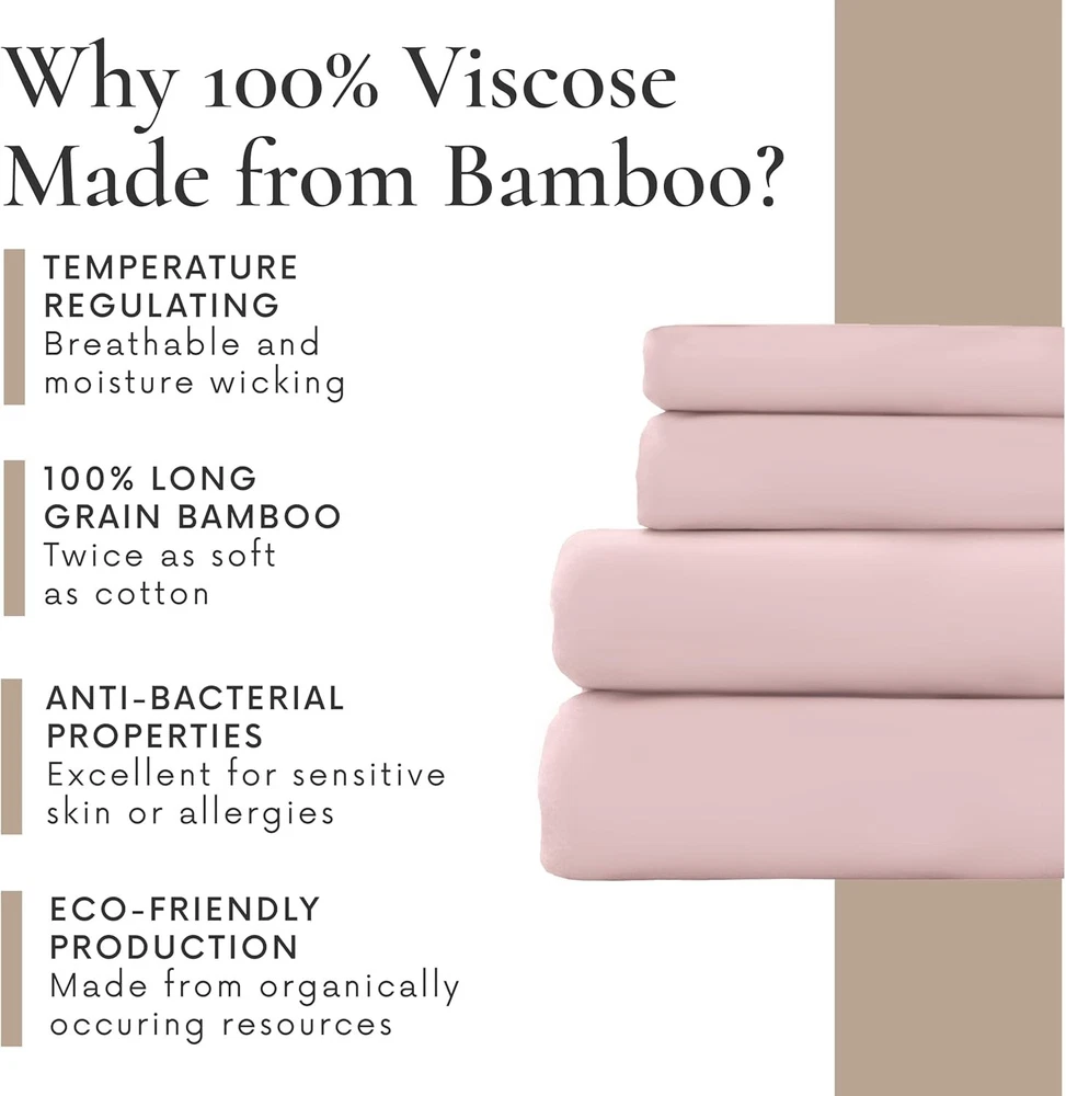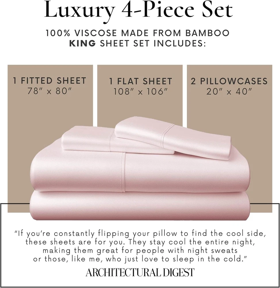 4 Piece King Size Sheet Set, 100% Viscose Made from Bamboo, Breathable, Ultra Soft Cooling Bed Sheets for Hot Sleepers, Beddings with Deep Pockets Fit 16" Mattress, Light Pink Dreamy Soft, Gift-Ready. Indulge in cozy luxury with our king size bamboo sheets set, made from 100% Viscose from Bamboo. Silky-soft and smoother than Egyptian cotton, they’re the perfect holiday gift for restful nights. Stay Cool All Night. Sleep cool with our king size cooling sheets sets, crafted with breathable, moisture-wicking fabric. Perfect for hot sleepers or anyone seeking all-night comfort. Complete California King Size Set. This King Size set includes 1 California King fitted sheet (72” x 84”), 1 flat sheet (108” x 106”), and 2 pillowcases (20” x 40”). Deep pockets and reinforced elastic ensure a snug fit on mattresses up to 16”. Effortless Care, Naturally Safe. Enjoy sheets that are as practical as they are luxurious. Our king size bamboo sheets are machine washable, fade-resistant, and OEKO-TEX certified for safety. Easy to maintain and eco-friendly! Veteran-Founded Promise. As a veteran-founded USA small business, we offer a 180-night satisfaction promise with unmatched customer support. Sleep soundly with your king size bamboo sheets set knowing we’ve got you covered.