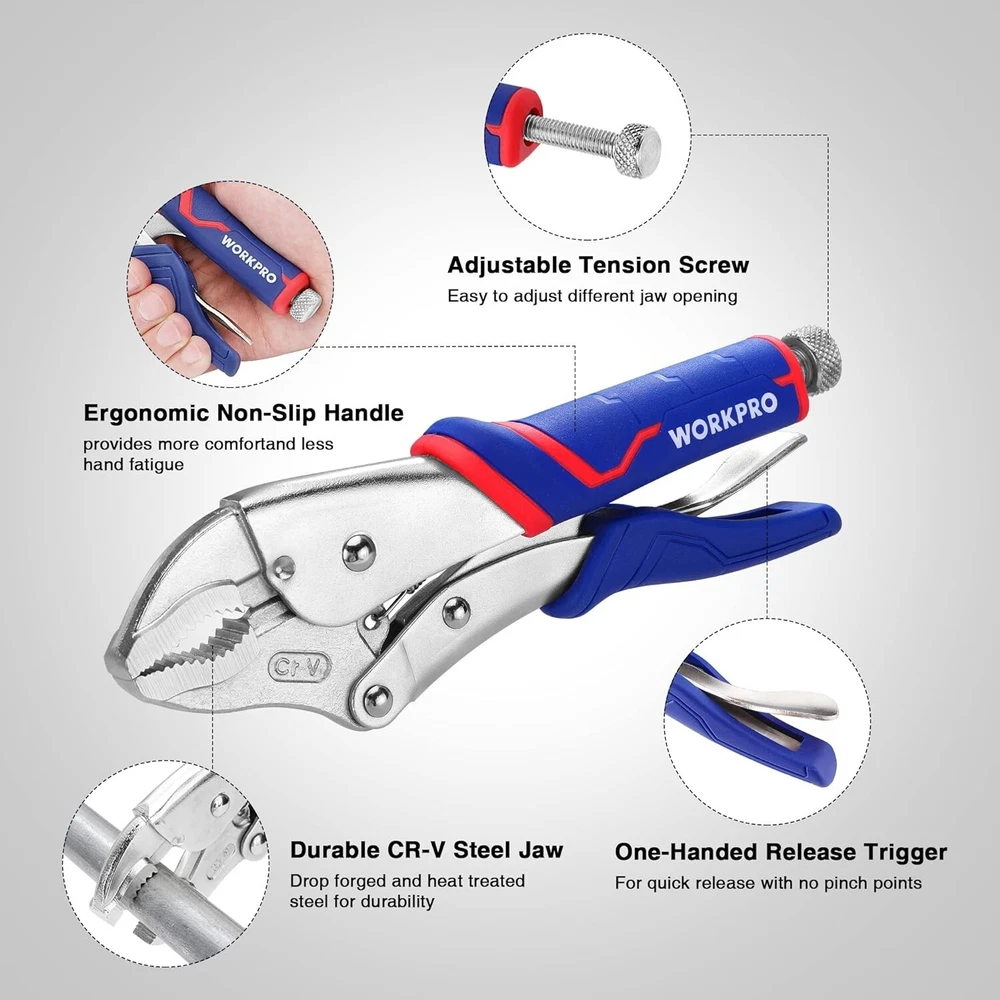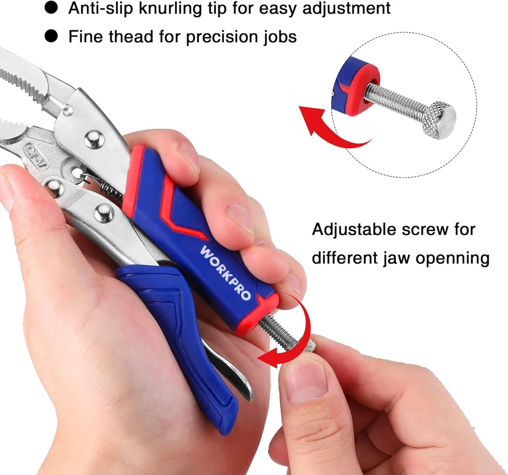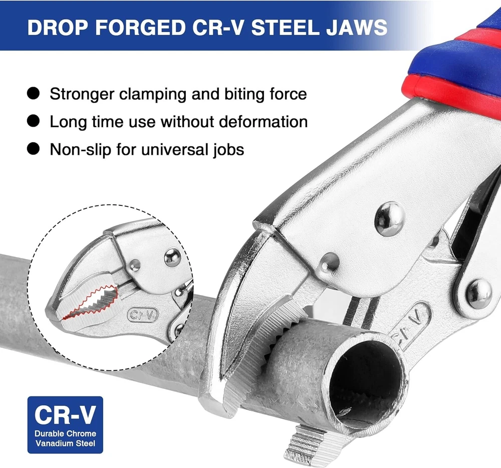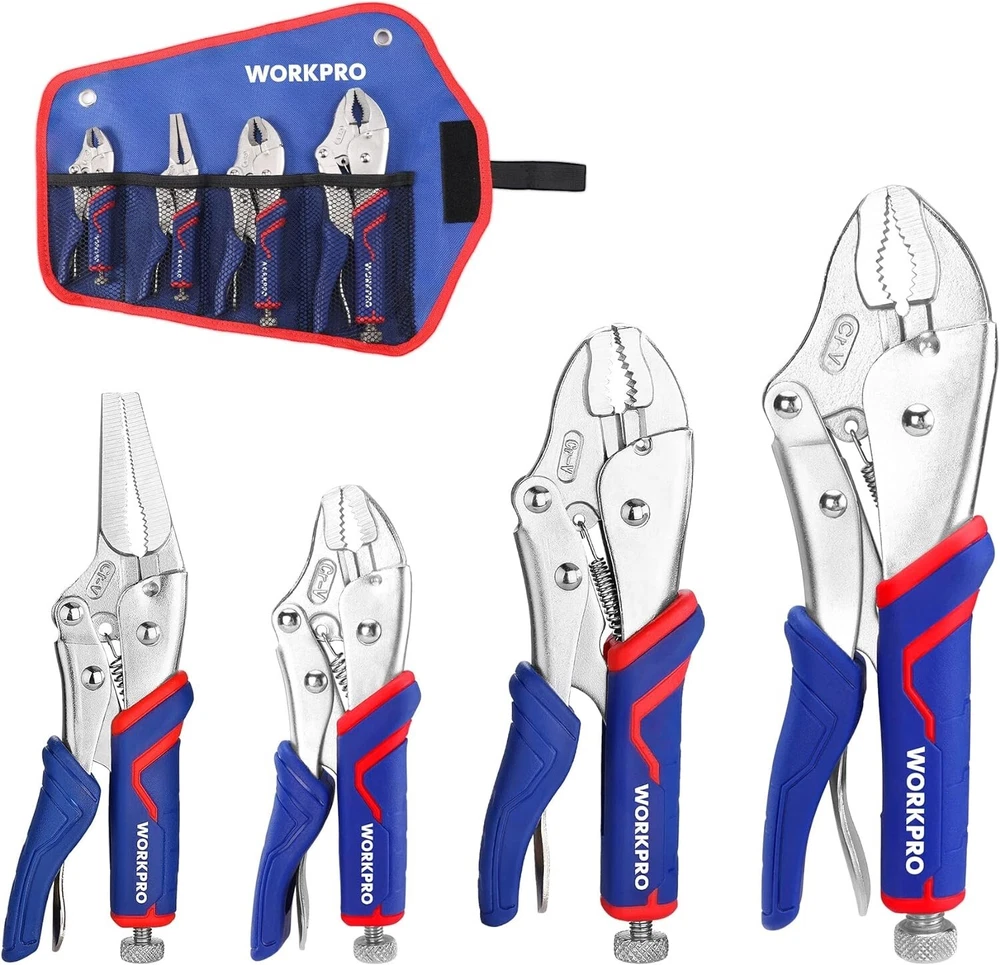 4-Piece Locking Pliers Set with Comfortable Grip, 5-1/2", 7" and 9" Curved Jaw Locking Pliers, 6-1/2" Long Nose Locking with Storage Bag WHAT YOU WILL GET-This Locking Pliers with storage bag include: 1PC 5-1/2" Curved Jaw Locking Pliers, 1PC 7" Curved Jaw Locking Pliers, 1PC 9" Curved Jaw Locking Pliers, and 1PC 6-1/2" Long Nose Locking. DROP FORGED CR-V JAWS-This 4-piece locking pliers set is forged from durable Chrome Vanadium Steel for corrosion and durability. The Cr-V jaws are further strengthened by heat treatment technical to ensure high hardness and long life. ADJUSTABLE TENSION AND ONE HANDED RELEASE-The screw can be adjusted for different jaw openings, which provides the ideal clamping pressure, making your work more easily. The one-handed release trigger makes you freely open the locking pliers with only one hand. ERGONOMIC COMFORTABLE GRIPS-It has TPR material ergonomic handles with anti-slip soft grips to provide extra comfort when using, reducing pressure on your hands while offering great firm control. WIDE APPLICATION-The 4-piece locking pliers set can meet your different demand when you need for tightening, clamping, twisting and turning. Widely used in industrial job sites or home improvement projects, repair jobs, and more. 4-Piece Locking Pliers Set