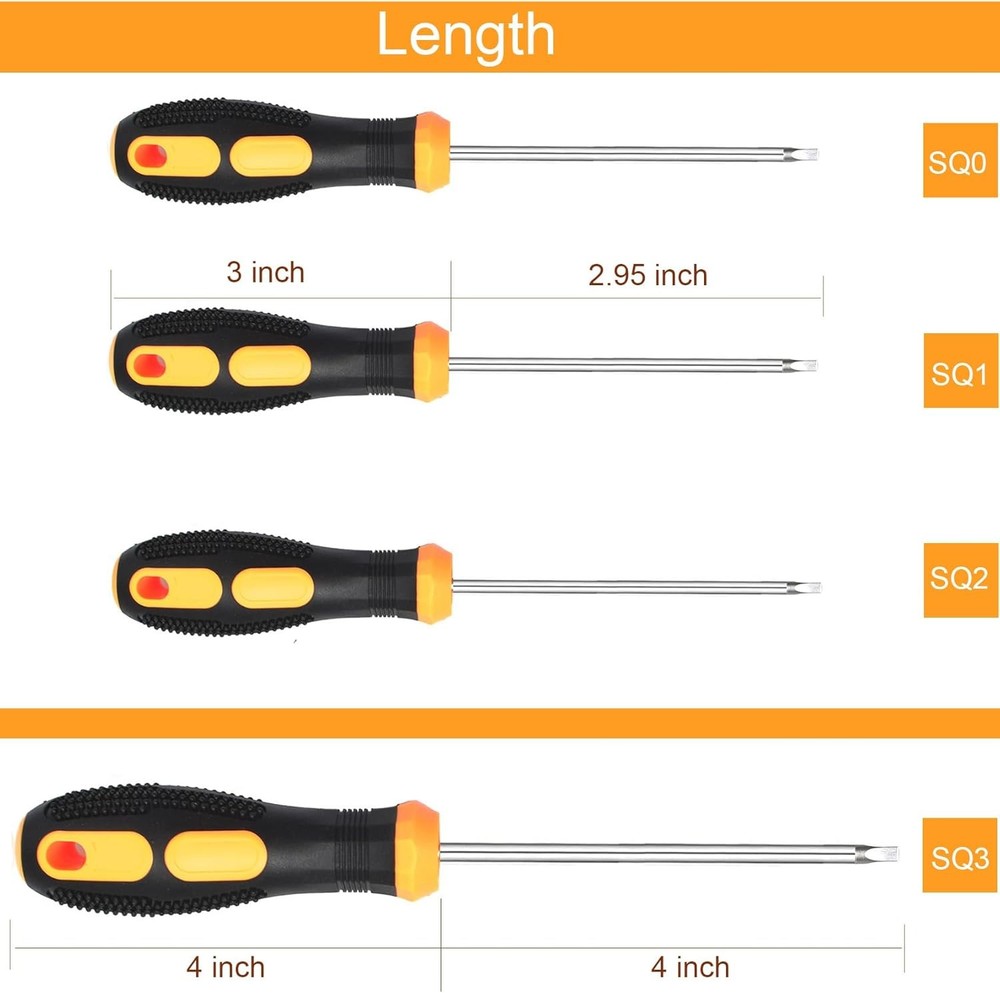 About this item What's in Package: 1 x SQ0 Square Screwdriver, 1 x SQ1 Square Screwdriver, 1 x SQ2 Square Screwdriver, 1 x SQ3 Square Screwdriver. Chrome Vanadium Steel Blade: The blade of the square screwdriver is constructed from shock-resisting S2 steel for maximum durability. Ergonomic Anti-Slip Handle: Each square screwdriver features an ergonomically-designed and non-slip handle to ensure a comfortable grip while working with square screws. Material of Handle: Made of a composite of hard plastic and covered with non-slip, soft TPE rubber to improve grip. Magnetic Tip: The magnetic blade tip can hold metal screws, making it easy to take the screw out after unraveling and preventing them from falling to the ground. Dimensions: 8.23 x 2.68 x 1.38 inches.