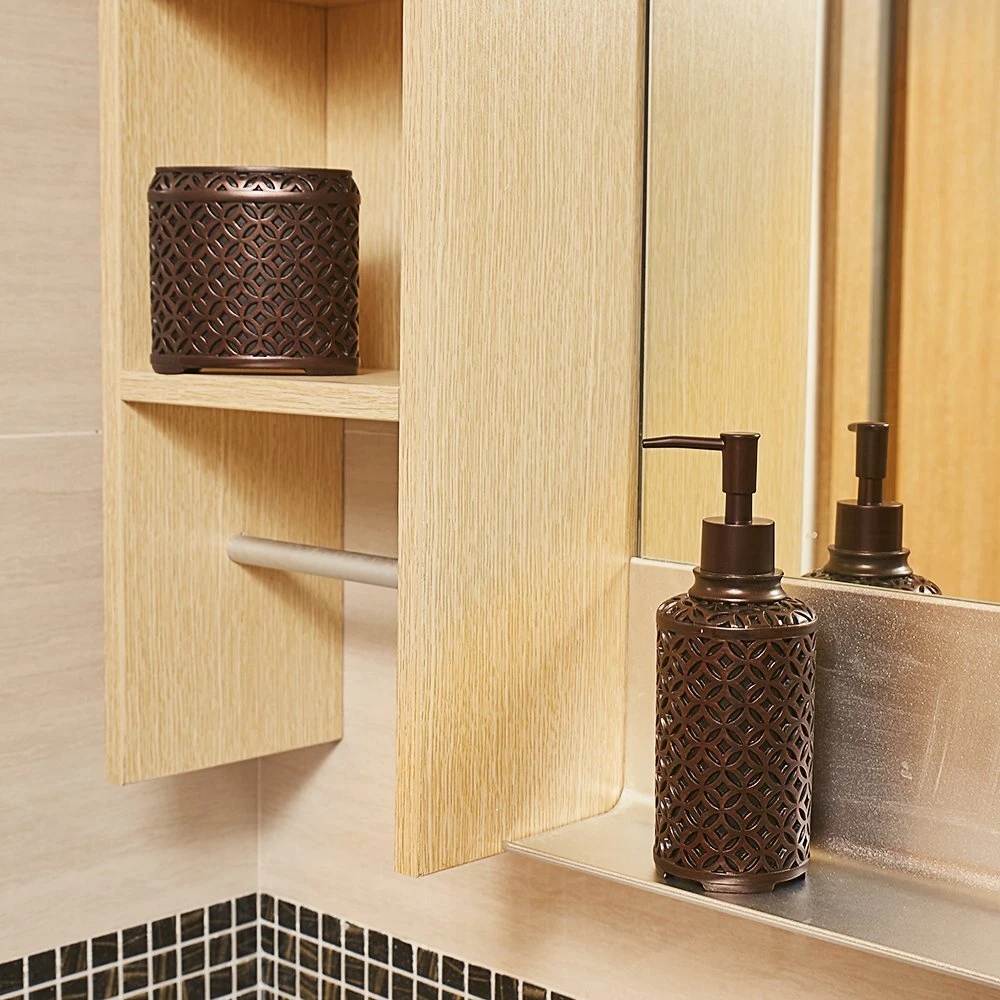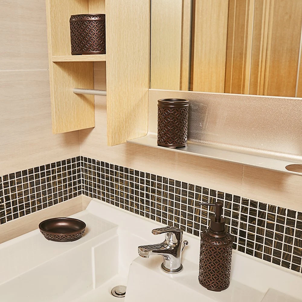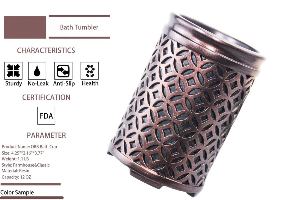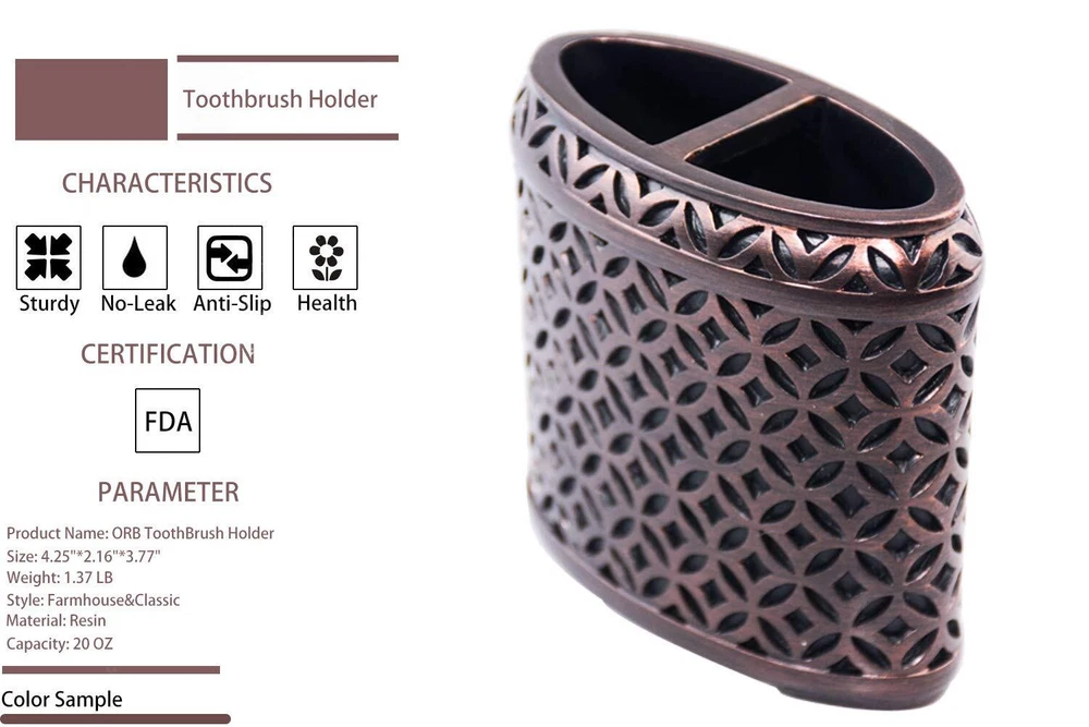 Classical Oil Rubbered Brozen Style Easy to Clean,No color fades Great for kitchen and bathroom bath sink decor New High Resin Made,use with confidence. Accessories: Lotion Dispenser(2.95"*2.95"*8.07");Toothbrush Holder(4.25"*2.16"*3.77");Bath Tumbler(2.95"*2.95"*3.93);Soap Dish(5.43"*4.13"*1.37");All Accessories weight(3.2 pounds)