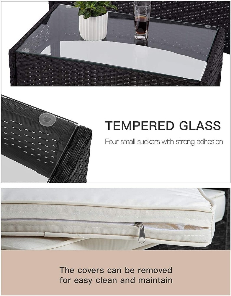 【EXCELLENT QUALITY】:The cushions of the patio furniture set use a high-density rebound sponge to give you a comfortable sitting feel.Patio Wicker Sofa Set Built As High Quality Metal Frame With Resilient PE Rattan, Black Synthetic Resin Wicker Outdoor Garden Conversation Set Designed For The Outdoors. 【EASY ASSEMBLY】: This Outdoor Furniture Set Comes With All Hardware & Necessary Tools. The Instruction, You Can Easily And Quickly Assemble The Patio Sofa Set. Outdoor Furniture Patio Wicker Rattan Sofa Garden Conversation Set. 【COFFEE TABLE】:The table in the patio furniture set is made of high-quality tempered glass for drinks, food and any beautiful decorations.The patio set is simple and stylish,it will be perfect for decorating your yard, poolside, balcony. 【MULTIPURPOSE FURNITURE SET】:The set is ideal to be placed in your balcony, patio, garden,poolside, backyard and other outdoor space in your house to create a private corner.Style and settings, convenient storage, save space. 【HIGH COST PERFORMANCE】:This patio set is designed to be modern and stylish with a low-maintenance feature. 4 sets of black rattan chairs can be used both indoors and outdoors, suitable for various large or small places.Outdoor Furniture Set Patio Wicker Furniture Set Patio Sofa Garden Conversation Set.