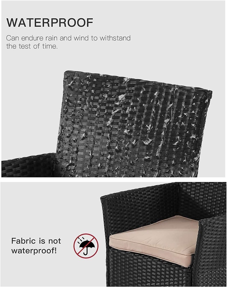 This outdoor rattan chair set is absolutely fantastic! The cushions are super comfortable with high-density foam, and the sturdy metal frame wrapped in durable PE wicker looks stylish yet built to last. Assembly was a breeze—everything you need is included, and it came together quickly. Perfect for relaxing in the garden or on the patio. Love the modern black design—it adds a sleek touch to any outdoor space. Highly recommend!