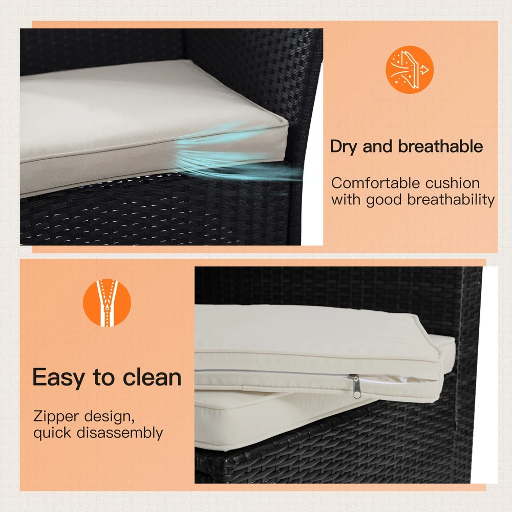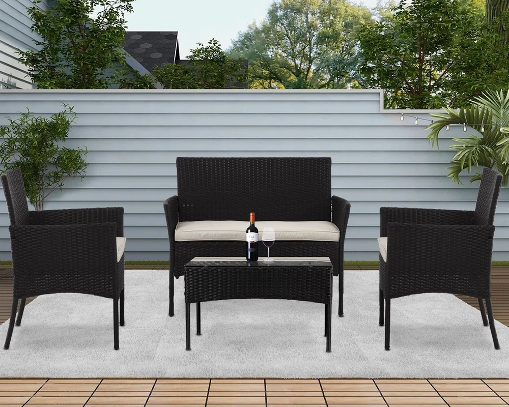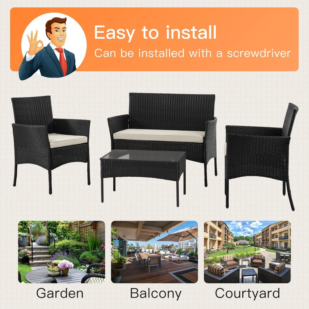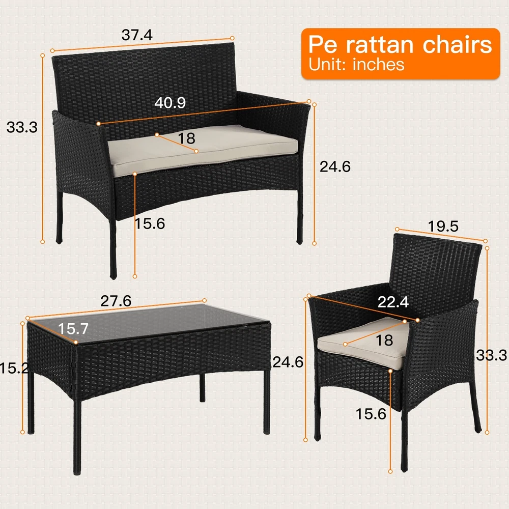 EASY ASSEMBLY: This Outdoor Furniture Set Comes with All Hardware & Necessary Tools. Follow The Instruction, You Can Easily and Quickly Assemble the Patio Sofa Set. NOTE: When you try to install the Patio Furniture Set, try to line the hole together in all side, do not over tight one hole, then try to tight it slowly in each side. SIMPLE AND ELEGANT: The cushions of the patio furniture set use a high-density rebound sponge to give you a comfortable sitting feel. Patio Wicker Sofa Set Built as High-Quality Metal Frame with Resilient PE Rattan, Black Synthetic Resin Wicker Outdoor Garden Conversation Set Designed for the Outdoors, Weather Resistant Design and UV Resistant. HUMANIZED DESIGN: Thickly Cushioned Wicker Patio Sofa Set Chairs for Maximum Comfort, Patio Outdoor Sofa Gives You an Excellent Seating Experience. Our Garden Outdoor Conversation Set have strong feet to protect your floor and increase the stability of your furniture. STRONG AND STURDY: This patio furniture set is made with a powder-coated steel frame and all-weather PE rattan wicker for a comfortable experience. The wicker of the Outdoor furniture set is sturdy but also very light. The seat cushion of this patio Conversation Set can be removed for easy cleaning. CONVENIENT CLEANING: The table in the patio furniture set is made of high-quality transparent tempered glass for drinks, food and any beautiful decorations. Our Outdoor Patio Wicker Sofa Sets all kinds of outdoors. Specifications: Material: PE Rattan & Steel Frame Rattan Color: Black Cushion: Blue polyester fabric and sponge padded Sofa Size:41.5"(W) X 23" (D) X 32.9"(H) Chair Size:23.2"(W)X 23"(D) X 32.9"(H) Table Size:28 "(L)X 16.5" (W) X 15.5 " (H) The comfortable double sofa is enough for two people to sit down. It's perfect for your patio Heavy-duty Foot Table and chairs are come with sturdy feet to protect your floor and add stability to the furniture. Our seat cushion is made of high-quality sponge material, which is breathable and not stuffy, comfortable to sit, and brings you a special enjoyment. The bottom of the seat is reinforced with a cross-shaped design, which makes the furniture more stable and can provide greater load-bearing. If you accidently spill on your cushions or if dirt accumulates over time, you can simply zip off the cushion covers and give them a quick wash to have them looking brand new. Top quality, all-weather resistant synthetic resin is built to last while having a sleek. Our wicker is strong and durable but also lightweight at the same time. High density thickened sponge cushion provides comfortable seating experience. Product Description PRODUCT DETAILS: This Is Our New 4-Piece Patio Furniture Sets with Thick Cushions, Contemporary Looks, Elegant Design for Comfortable And Durability. Please Note: Our digital images are as accurate as possible, however, photo taking condition and different monitors may cause image color to vary slightly, and it is normal. Don't hesitate to buy it !!! FEATURES: - Modern and stylish outdoor sofa set, perfect for any indoor or outdoor decoration. - Composed of lightweight rattan wicker and a sturdy metal frame, This Patio sofa set is weatherproof, UV-resistant and stable. - Our High-Quality Patio Furniture Sofa Set Metal Frame with Removable Covers Cushions (Beige), You Will Feel Very Comfortable & Relaxed When Leaning On. Package Include: 1 x Tempered Glass Top Coffee Table; 2 x Single Chair; 3 x Thick Cushion; 1 double sofa. Listed by Frooition Frooition | No-js Template | eBay design, eBay store design, eBay shop design, eBay template design, eBay listing design, eBay Listing Tool (ver:froo_no_js)