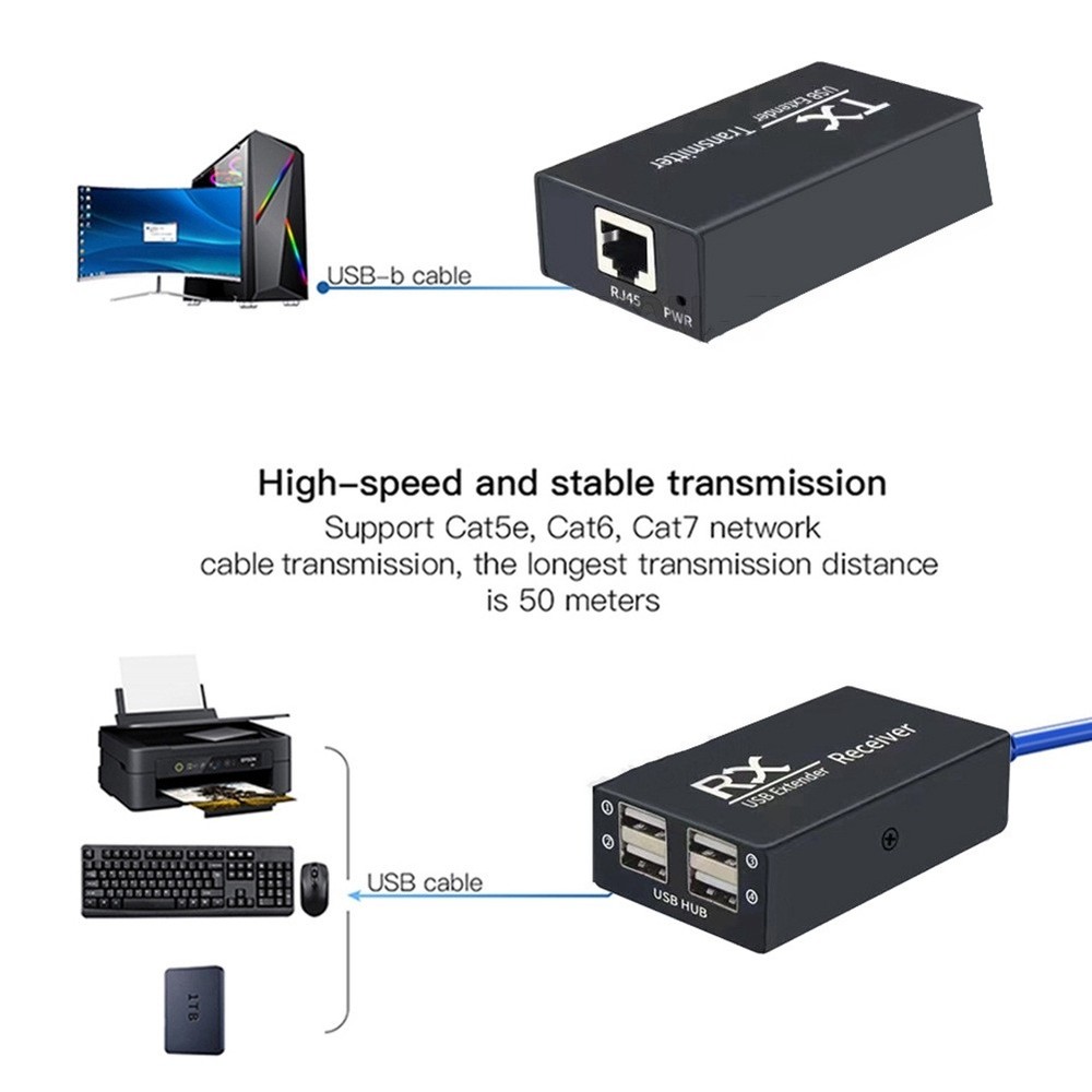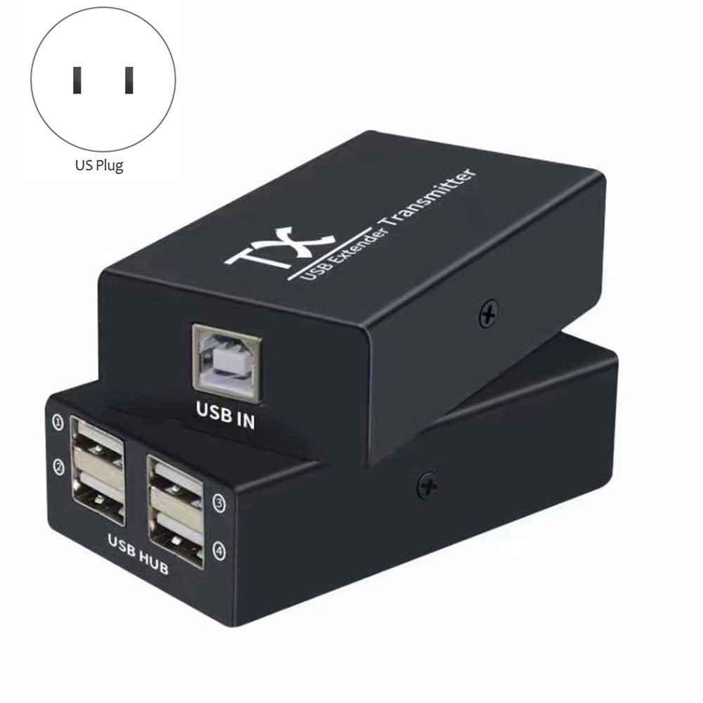 120M USB Extender 4 Port USB1.1 Hub Extender over RJ45 Ethernet USB UTP1259 One CAT5E/6 cable can instead of USB cable to transmit long distance. Using CAT6 cable support USB1.1 device transmit up to 60 meters. Using CAT6 cable can make the the low-speed devices transmit keyboard,mouse etc. device extend up to 120 meters. Compliant with USB 1.1 Supports major operating systems: Windows, Mac OS X, Linux etc. Supports full-speed(12MB/S)and low speed (1.5Mbps) USB device. Plug and Play, no driver installation needed. Support swap function, plug and play. Simple installation. Specifications: USB input interface: 1x USB-B/F USB output interface: 4x USB-A/F Compatible USB version: USB1.1andUSB1.1 Wiring method: IEEE-568B Maximum working current: less than 120m CAT6 standard cable Input cable distance: less than 5m USB standard cable Output cable distance: less than5m USB standard cable Supportsdatatransterrates: 12MB/S Operating temperature range: 0~40 Celsius Operating humidity range: 5~85% RH (non-condensing) Plug Type: US Plug,it applies to Canada, India, Mexico, Thailand, Taiwan, the United States, the Philippines and so on. Colour:black Material:Metal Voltage: AC110V Package Contents: 1 * USB Extender Transmitter 1 * USB Extender Receiver 1 * Power Adapter Only the above package content, other products are not included. Note: Light reflection and different displays may cause the color of the item in the picture a little different from the real thing. The measurement allowed error is +/- 1-3cm.