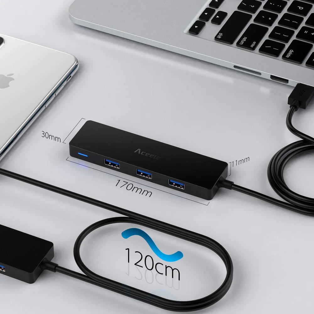 USB 3.0 to 4-Port USB 3.0 Hub is designed to deliver convenient access to devices with USB 3.0 Port. The extended cable makes it easier to connect the devices, avoiding loose plugs and inconvenience.With data transfer rates of up to 5Gbps, files could be synced to your USB devices more efficiently than ever. Attractive, portable and handy designed, it’s convenient to take with you. Feature: - Four USB 3.0 ports, and supports all devices with USB 3.0 Port. - Ultra slim size, and easy for carrying when travelling or mobile working. - USB 3.0 Port supports Low-speed (1.5Mbps)/full-speed(12Mbps) /high-speed (480Mbps)/super-speed (5 Gbps). - Works with high-bandwidth Super Speed USB 3.0 devices, and is also backward compatible with USB 2.0 / 1.1 devices. - USB Bus-Powered, no additional power adapter needed. - No drivers needed. Support hot-swapping and plug-and-play. - Has over-current protection built in each port to protect both connected devices and your hub from power surges. Packing Contents: - 1 x USB 3.0to 4-Port USB 3.0 Hub - 1 x User Manual Warranty: Support 30 days no-hassle return policy and 2-year no-Worry Warranty. About Us: We are a professional factory with more than ten-years’ experience in R&D and production. 100% customer satisfaction and world-wide recognition are our eternal pursuit. Multiple Ports USB Hub 3.0: Turn your USB port 1 into 4. Great USB port expander for keyboard, mouse, webcam, speaker, USB disk, printer, usb headphones and more. High Speed Data Transfer: USB 3.0 hub supports data transfer rates up to 5Gbps (10 times faster than usb 2.0) and can transfer a HD movie in seconds. (NOTE: This hub is not designed to charge devices!) 4ft Extended Cable USB Port: USB extension cable hub is long enough for your usb male port plug in desktop computer and the hub can be placed on the desk, easy access to your usb device. Updated Chip: USB hub for laptop built-in high-performance chip to keep your devices and data safe, and supports hot swapping. Build-in current protection settings to extend hub life. No drivers are needed, plug and play. Wide Compatibility: This USB splitter for laptop reverse compatible with USB 2.0 and USB 1.1 devices. Use with PC, MacBook, iMac, Mac mini, XPS, Flash Drives, & any other USB compatible devices. What you can get: 30 days no-hassle return policy, 2 years quality gurantee and 24-hour friendly customer service from .