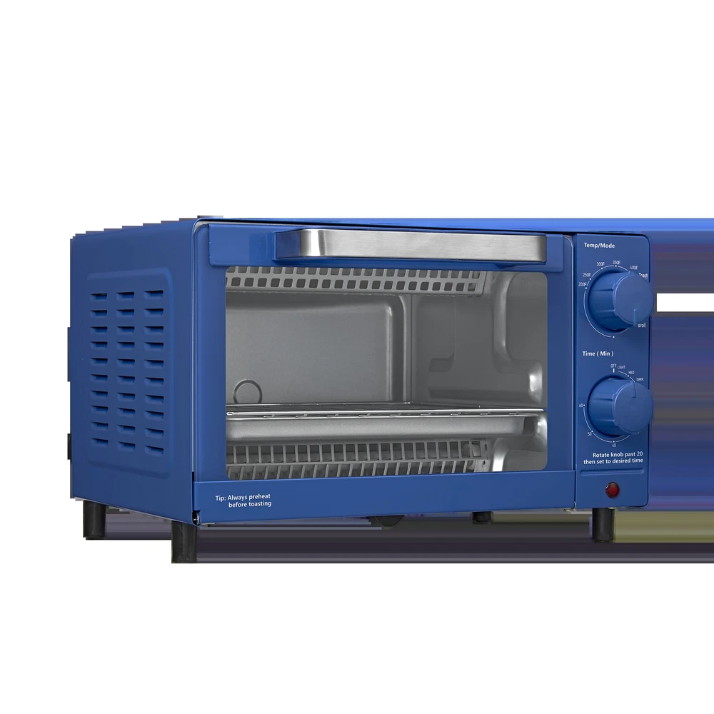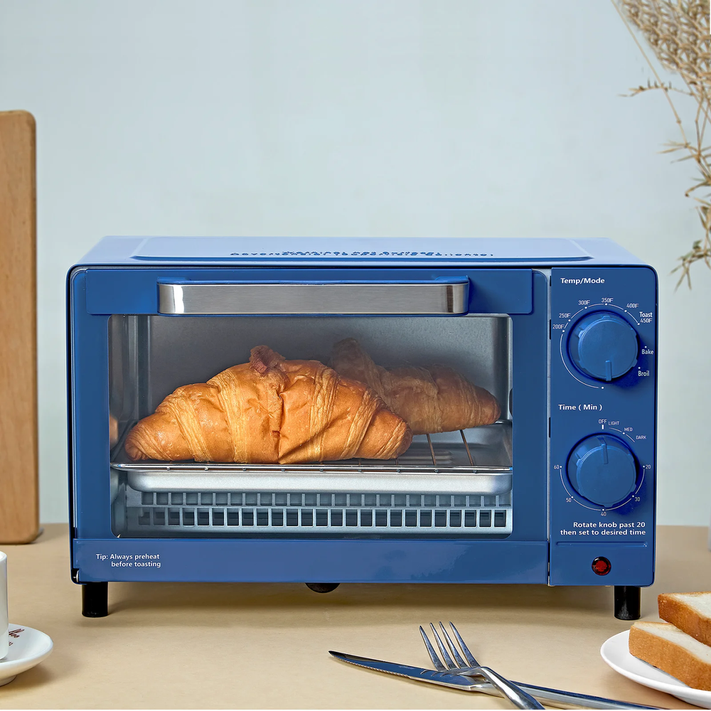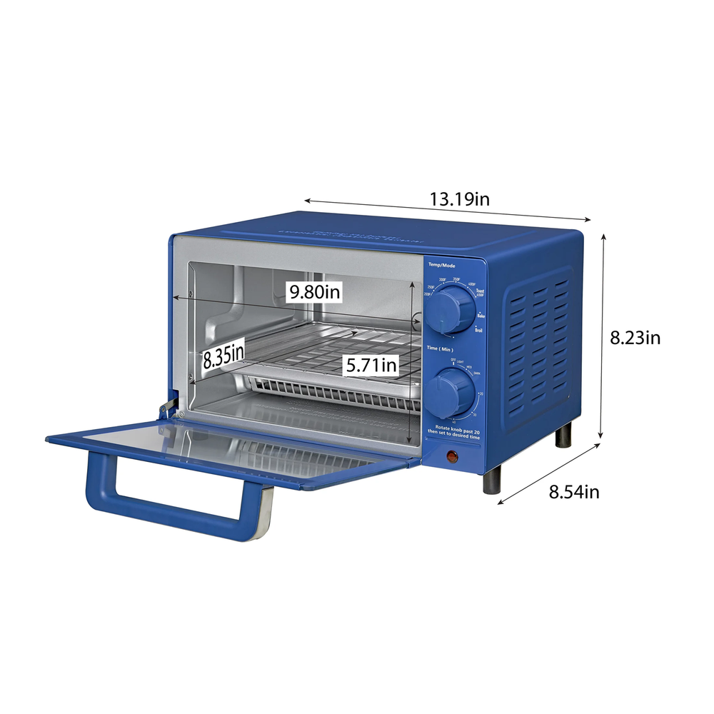 The Mainstays 4 slice Toaster Oven (MS5502550614-03) makes your life more convenient and efficient. It is perfect for preparing toast, sandwiches, pizza, and so much more. This toaster oven can accommodate up to 4 slices of bread or a 9-inch pizza, making it an ideal choice for busy households. The turn dial allows for easy adjustments to temperature mode and time settings, ensuring mealtime is swift and smooth. The compact size of this toaster oven uses less energy and counter space, making it easy to store. The sleek white finish coordinates beautifully with existing kitchen decor and color palettes, ensuring it seamlessly integrates into your home. The baking rack and baking pan are included, and the oven exterior is easy to wipe clean for quick and easy cleaning. The Mainstays Toaster Oven is sure to become a staple in your home cooking and baking ventures, bringing new experiences to your daily life. With its versatility, time-saving features, and stylish design, this toaster oven is a must-have for anyone looking to elevate their mealtime experience. Toast, Bake & Broil settings Fit 9-inch pizza or 4 slices of bread 2 Quartz heating elements Adjustable timer up to 60 minutes Power indicator light 1050 Watts of power Royal Blue, includes baking rack and baking pan