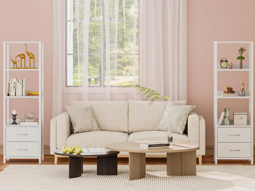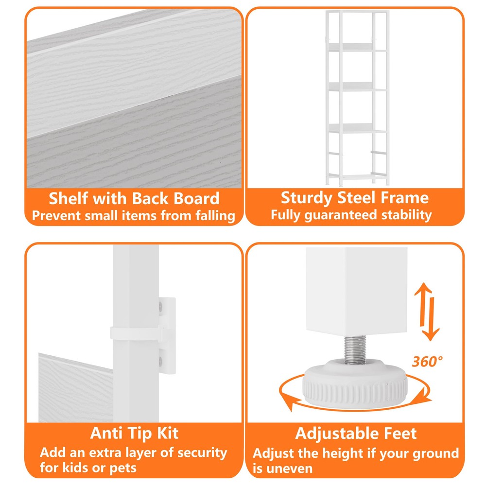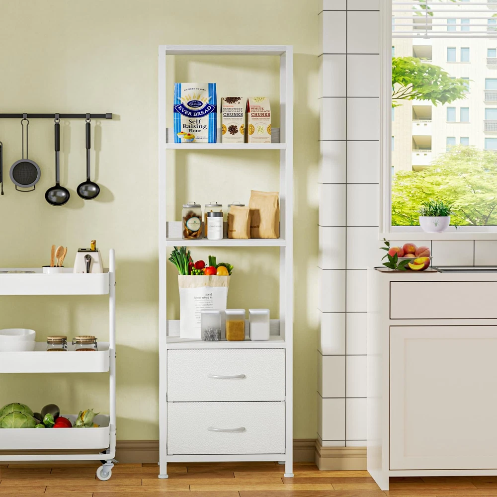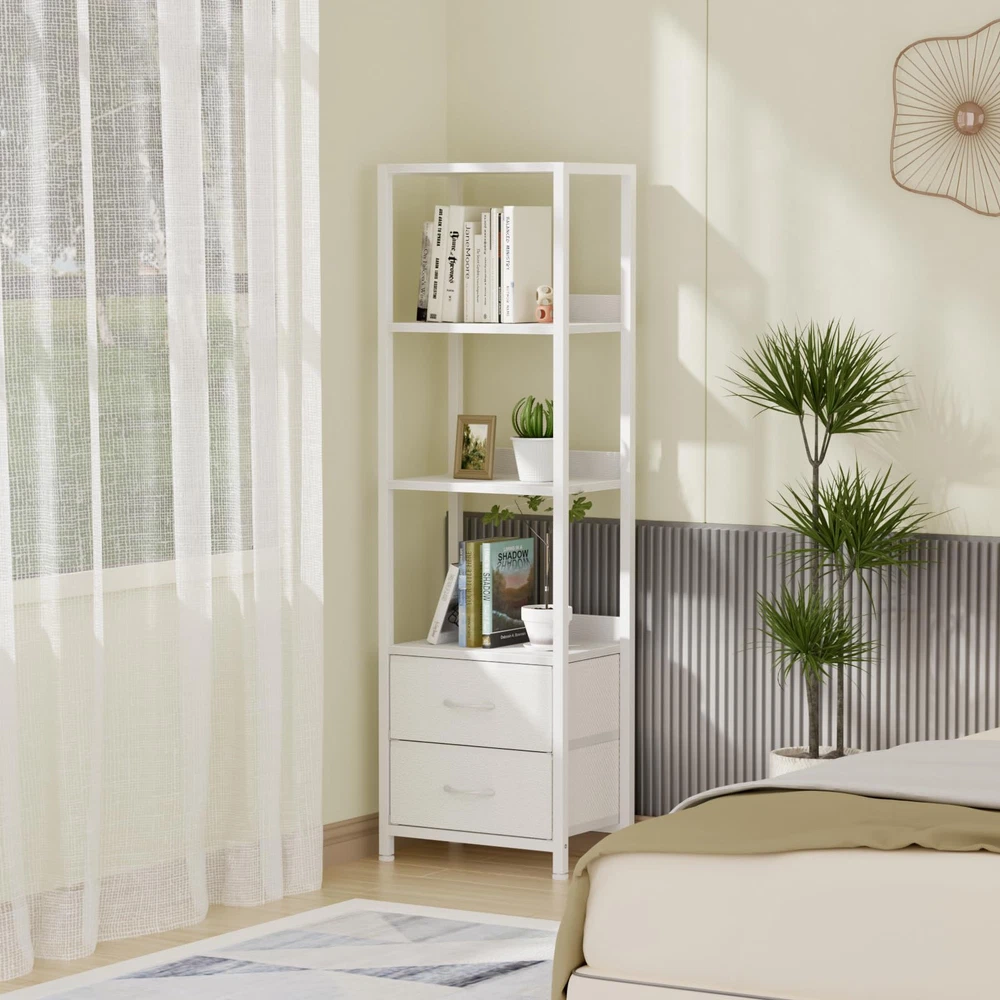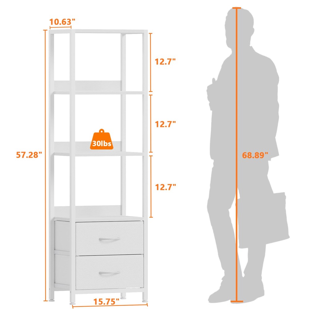 4-Tier Shelf & 2 Drawers: This bookshelf features multiple wood shelves to accommodate books, decor, and other items. The functional fabric drawers provide additional storage space for your personal items or office supplies, keeping your space organized and clutter-free. Space Saving & Utilizing: The tall and narrow design of this wall shelf allows you to make the most of vertical space, making it perfect for rooms with limited floor area. It efficiently utilizes unused wall space without sacrificing storage capacity, bringing you the convenience and functionality. Stable & Durable: This tall shelf is composed of wear-resistant wooden shelves and hard steel frame, which is crafted with high-quality materials for durability and long-lasting use. The solid construction ensures stability, making it a reliable storage solution for years to come. Easy to Assemble: With its user-friendly construction, assembling this bookshelf is a breeze. The package includes all the necessary hardware and clear instructions, guaranteeing a hassle-free setup process. Multiple Functions: This shelf combines display and storage functions, making it suitable for different rooms and scenes. It can be used as a bookcase in the bedroom, office, or a corner shelf in the living room, storing room, or a standing shelf in the kitchen, bathroom.