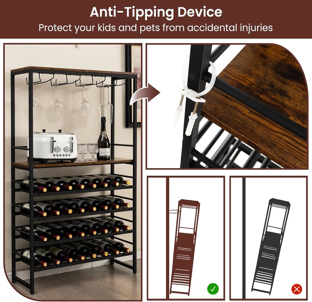 Product Description About this item Industrial & Modern Appearance: Our wine coolers are a perfect blend of industrial charm and sleek design elements. The attractive wood-grain top combines with the sleek black metal frame to blend seamlessly with a variety of room styles. Whether placed in your home bar, kitchen or dining room, this versatile wine rack will be a charming focal point in your living space. Secure & Solid Design: The reinforced metal frame ensures durability, while the adjustable legs provide a stable base. Each rack has a weight capacity of up to 110 pounds. Additionally, an anti-toppling devices securely attaches the wine rack to the wall, eliminating wobble and enhancing security. Ample Wine Storage Capacity: Boasting a generously spacious design, this wine storage shelf offers 4 rows of stemware racks and a 4-tier wine storage system. With the capability to accommodate up to 16 glasses and 32 wine bottles simultaneously, it provides an ideal storage solution for both your prized stemware and cherished wine collection. Versatile Storage Solution: with a spacious top and an open storage shelf, this industrial wine rack provides the perfect space for decorative items, wine coolers, ice buckets, utensils and even a coffee maker. This wine holder stand can also be used as a modern coffee bar, a practical kitchen shelf or a handy microwave rack for your unique and versatile daily needs. Easy to Assemble: Our floor standing wine rack is a breeze to assemble. We provide detailed instructions and all the necessary hardware so you can assemble this product quickly and effortlessly. In addition, its finished dimensions of 31.5" x 12" x 55" (L x W x H) ensure that it won't take up too much floor space in your home. Description: Are you still struggling with how to organize your wine and wine glasses? Let's have a look at this industrial 4-tier wine rack! 4 rows of stemware racks and 4 tiers of wine shelves ensure that this multi-purpose wine holder stand display can hold up to 32 bottles of wine and 16 glasses, and the countertop can also hold small kitchen utensils or a coffee maker. The sturdy metal frame makes this wine rack rust-resistant, stable, and resistant to wobbling. Adjustable feet add sturdiness and floor protection. To keep your items safe, an anti-falling bar and anti-toppling device are included to keep the wine rack stable. This freestanding wine rack is an ideal choice for you! Specification: Color: Rustic Brown + Black Material: Engineered Wood + Metal Overall Dimension: 31.5” x 12” x 55”(L x W x H) Distance Between Each Shelf: 22.5”, 6.5”, 5”, 5.5”, 5.5” Leg Height: 5.5” Bottle Capacity: 32 Glass Capacity: 16 Suitable Bottle Size: 2.2”-3.5” x 7.9”-13.8” (D x L) Weight Capacity of Each Shelf: 100 lbs Net Weight: 39.5 lbs Package includes: 1 x Floor Wine Rack 1 x Instruction