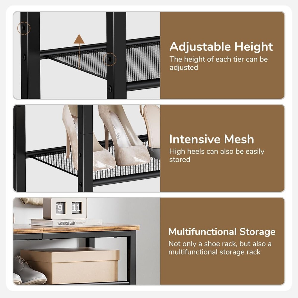 This shoe rack is a game-changer—sturdy, stylish, and super functional! The mix of rustic wood and black metal gives it a chic industrial vibe, and the four tiers hold all my shoes neatly. Super easy to assemble, and the quality feels solid. Perfect for keeping my entryway organized without sacrificing looks. Highly recommend!