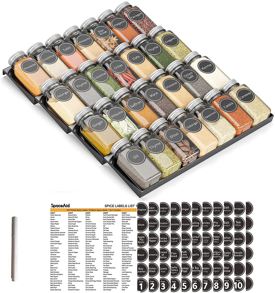 Complete Drawer Spice Organizer Set: 1 x Drawer Spice Rack, 28 x Square Empty Glass Spice Jars, 386 Spice labels; SIZE: 13"W x 17.5"D x 2.5"H Large Capacity 4-Tier Tray: Organize all your spices and more throughout your home; Tray will not crack and it is easy to wipe clean 4 Tier Spice Rack: Inclined board design make it easy to locate and quickly grab what you need, comes in strong steel and good finished 28 Spice Jars: Spice jars are made from high-quality durable glass, feature pour or sift tops for light seasoning; Metal airtight caps keep your spices stay fresher longer 386 Spice Labels: 340 labels have been preprinted, 46 labels are blank and you can diy with it; Label the jars to avoid the hassle of searching when cooking Product Description Measure your drawers before purchasing for a proper fit! Measure your cabinets before purchasing for a proper fit! Measure your drawers before purchasing for a proper fit!