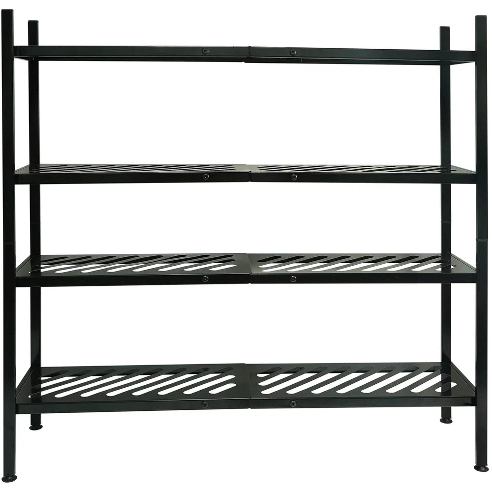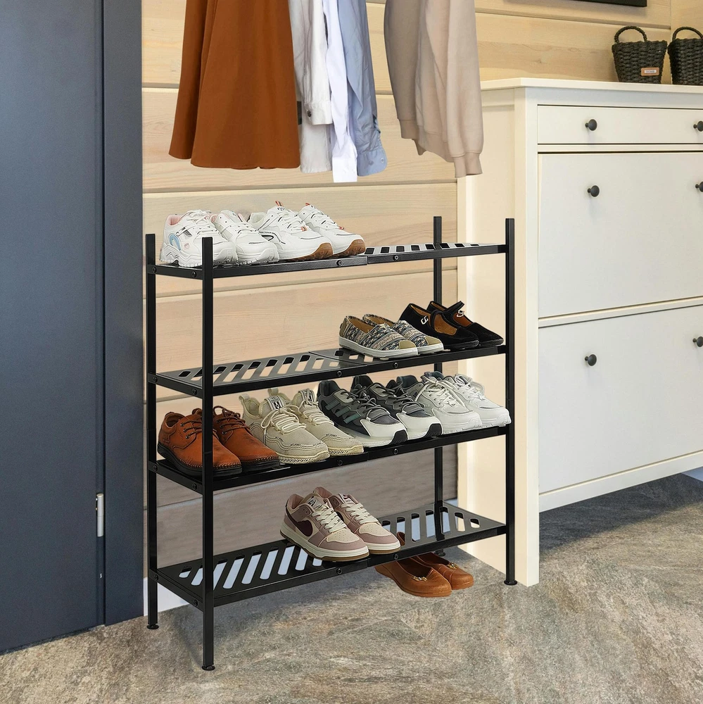 Shoe Rack, 4-tier FreeStanding Shoe Shelf Stand, Stackable Shoe Storage Organizer for Closet, Holds up to 20 - 24 Pairs of Shoes for Entryway, Garage, Front Door Entrance, Metal, Black LARGE CAPACITY: 4 tiers of heavy-duty shoe organizer can store up to 20-25 pairs of women's and children's shoes, each unit can be easily organised to store 4 pairs of adult trainers and tennis shoes, extra bottom storage for 6 pairs of slippers, flip-flops and flats,each shelf can hold up to 35lbs STACKABLE SHOE RACKS: 2 sets of shoe organizer racks can be stacked vertically to form a complete 8-tier shoe stand, stacked high shoe racks can remove one unit of shelves to provide more space for tall boots, space-saving and tidy, with adjustable feet on the bottom to adjust the balance on unbalanced floors SIZE: L 34.2 inches x W 8.8 inches x H 34.6 inches, the distance between each unit of the shoe holder is 8.6 inches EASY TO INSTALL: It only takes a few minutes to install the sturdy shoe storage rack! Comes with installation instructions and necessary screws, no tools required MULTIFUNCTIONAL: Multi-tier shoe shelves is suitable for wardrobes, front door entrances, garages, entryways and indoor-outdoor corners