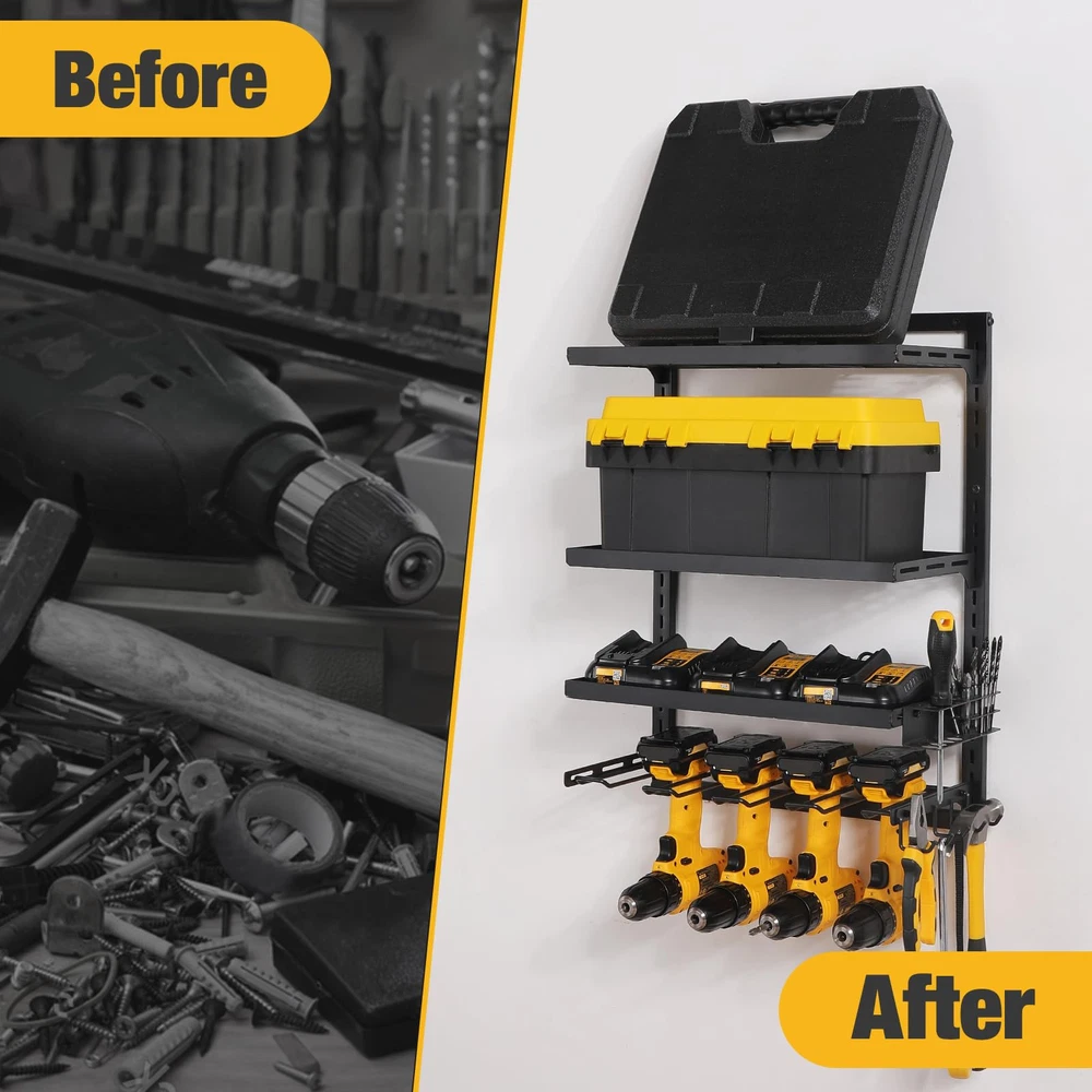 Durable Design: power tool organizer is crafted from high-quality iron with excellent welding craftsmanship, ensuring a robust connection between its components. This design allows it to withstand the weight of power tools without deformation or loosening, and the paint won't peel, guaranteeing reliable storage and support for your tools. Ingenious Adjustable Design: cordless tool rack features a 4-tier shelving system that offers flexible height adjustments. 3 tiers can accommodate toolboxes, other commonly used tools, or accessories, while the bottom tier can hold up to four electric tools. User-Friendly Features: tool organizer includes thoughtful features such as a dedicated slot for drill bits and screwdrivers for quick access. The included curved hooks can be used to hang pliers, hammers, wrenches, and other tools and accessories, enhancing the efficiency and tidiness of your workspace. Easy Installation: We provide a straightforward and easy-to-follow installation guide, allowing you to complete the setup in just a few simple steps. No complex tools or professional skills are required, making it effortless for you to enjoy a more organized workspace. Versatile User Base: electric tool organizer caters to a diverse user base, including craftsmen, DIY enthusiasts, garage and workshop organizers, professionals in repair and construction industries, and homeowners with electric tools. It's a versatile solution for anyone seeking efficient and organized tool storage.