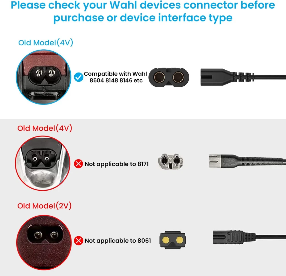 Store New Arrivals Add to Favorite View Feedback Contact 4V for Wahl Magic Clip Cordless Charger, 4V Wahl Clipper Charger for Wahl Shaver 8148/8591/8164/8504, Wahl 1919 100 Year Hair Clipper, Wahl 5-Star Magic Clip Cordless Shavers. Description Item model number 4v 2 A Power Adaptor Manufacturer SHENZHEN WOYUAN ELECTRONICS CO.,LTD Mounting Type Wall Mount Color black Is Discontinued By Manufacturer No Product Dimensions 2.17 x 1.38 x 0.98 inches Connector Type Barrel Connector Compatible Devices function(f) {var _np=(window.P._namespace("DetailPageProductOverviewTemplatesJava"));if(_np.guardFatal){_np.guardFatal(f)(_np);}else{f(_np);}}(function(P) { P.when('A').execute(function(A){ A.on('a:truncate:po-attribute-truncate-3:updated', function(data) { var isTruncated = !data.truncateInstance.getIfTextFits(); var seeMoreElement = document.getElementById('po-attribute-see-more-id-3'); if(seeMoreElement) { seeMoreElement.style.display = isTruncated ? '' : 'none'; } }) }); })); Wahl 5-star Magic Clip Cordless Hair Clipper 8148/ 8148L 8148-308 8504 8164 Shaver ,Wahl 1919 100 Year Clipper, Wahl Cordless Senior 08504-400 Shaver, Wahl 8591 Electric Cordless Clipper Trimmer, such as 8591L,8591-001 / 8591-1235 / 8591-016 / 8591-018 See more Item Weight 3.52 ounces Connectivity Technology USB Input Voltage 4 Volts (DC) Compatible Phone Models function(f) {var _np=(window.P._namespace("DetailPageProductOverviewTemplatesJava"));if(_np.guardFatal){_np.guardFatal(f)(_np);}else{f(_np);}}(function(P) { P.when('A').execute(function(A){ A.on('a:truncate:po-attribute-truncate-4:updated', function(data) { var isTruncated = !data.truncateInstance.getIfTextFits(); var seeMoreElement = document.getElementById('po-attribute-see-more-id-4'); if(seeMoreElement) { seeMoreElement.style.display = isTruncated ? '' : 'none'; } }) }); })); Wahl 5-star Magic Clip Cordless Hair Clipper 8148/ 8148L 8148-308 8504 8164 Shaver, Wahl 1919 100 Year Clipper, Wahl Cordless Senior 08504-400 Shaver, Wahl 8591 Electric Cordless Clipper Trimmer, such as 8591L,8591-001 / 8591-1235 / 8591-016 / 8591-018 See more Special Feature Travel, Short Circuit Protection Brand NFGEKT Included Components Charger Safety Design: Charger Fit for Wahl Cordless Magic Clipper Tested, approved and certified by FCC and CE and ROHS. built in smart chip,Over current protection, Over temperature protection ,Short circuit protection,Over voltage protection. Compatible With: Wahl 5-star Magic Clip Cordless Hair Clipper 8148/ 8148L 8148-308 8504 8164 Shaver ,Wahl 1919 100 Year Clipper, Wahl Cordless Senior 08504-400 Shaver, Wahl 8591 Electric Cordless Clipper Trimmer, such as 8591L,8591-001 / 8591-1235 / 8591-016 / 8591-018( please check the compatible models before your purchasing) Notice: ❌❌NOT COMPATIBLE with Wahl New Model 8171 8148L1 8504L1 8591L1 97624-002 97624-800 90302-100 97618-2200 shaver,❌❌Wahl 8163 9818 8061 9649 shaver,❌❌Wahl SS2L trimmer and other brands clipper/shaver. Input: 100-240V AC, 50-60Hz. Output: DC 4V 2A. Cable length: 1.8M/6FT. The extremely long Wahl power cord allows you to use indoor convenient. AFTER-SALE SERVICE: This product can be replaced or refunded within 30 days, if you have any questions about our products, Please contact NFGEKT promptly by email. Thank you for your support. Product Description Compatibility: 4V Clipper Compatible with Wahl Magic Clip Cordless Charger Cord with Wahl 5 Star Cordless Premium Hair Clipper 8148. Professional 5 star cordless magic clip hair clipper charger for Wahl 5-Star 8164 Shaver. Charger Fit for Wahl Cordless Magic Clipper 97225-002 Clip Shaver AC Adapter Power Cord Supply forS010AZM0400200. NFGEKT Charger Compatible with Wahl 8591 Electric Cordless Hair Clipper Trimmer. NFGEKT 4V 2A clippers magic clips charger for Wahl 1919 100 Year Hair Clipper. This Wahl clipper charger replacement is only for our listed models, please check our listed compatible models and make sure your clipper model matches it. 4V charger replace with Wahl 5-star Cordless Senior Hair Clipper 8504. Please check your Wahl Trimmer model number or original Wahl Trimer charger connector before purchasing to make sure the charger is compatible with your Trimmer. Note: Clippers shaver charger for wahl not applicable to Wahl 8163 / 9818 / 8061 / 9649 / Whal Model 8171 (Not Work Andis Clipper or Foil shaver). If there is any problem with the product received andyou can ask us through Amazon at any time. We care about only putting out high quality products that satisfy your needs. Please check whether the charger you need matches the compatible model listed in the picture and title before purchase; Because some models of this product have different versions of the interface, if you are not sure whether it matches, please provide the product model and take a picture of the device interface to ask us, we will give you suggestions. Safety & Reliable: The 4V charger for wahl groomer clipper supports over current protection, Over voltage protection, Short circuit protection, Over temperature protection which will keep dangers away from charging your wahl clipper, CE/FCC/RoHS listed.It is normal for the temperature of the wahl charger to increase during charging of wahl trimmer clipper. ABOUT US We offer the best prices around on high quality products. Our E-store includes media such as books, movies, music and games while offering electronics, toys, sporting apparel, clothing, tools, general home, garden items and more. SHIPPING We are always working hard to ensure your package arrives as soon as possible. Please understand that some factors like weather, high postal traffic, and the performance of shipping companies are outside of our control. We offer free shipping to the lower 48 states and ship within 2 business days of payment, usually sooner. We do not accept P.O. Boxes. Please provide a physical address. RETURNS We offer a 30-Day Return Policy on items which you are not completely satisfied with. You have the optio