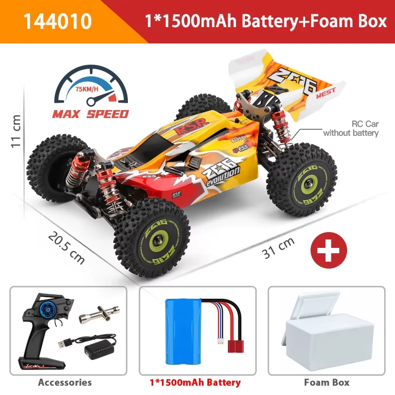 Tips for sellers: We recommend: that you watch the video and read our description carefully before you buy Note: This is not an ordinary toy remote control car, because the remote control car is too fast, it is recommended to use remote control car in open areas to avoid bumping into obstacles. Note: The retail package is made of foam boxes, which can reduce the damage to the product during transportation. Original boxes are not included Note: *If you purchase a 3600mah upgraded battery package, *(one of the batteries is the original), *Because the manufacturer comes with a standard battery, *So we can't upgrade all to a 3600mah battery WLtoys 144001 RC Racing 60KM/H High Speed Cars 2.4G Electric Remote control Shock Absorption Off-Road Drift Car Children toys Note: Please note to distinguish the model before purchasing the order. The model parameters are as follows: 1. Ltem Name:144010 Size:31*20.5*11CM Maximum speed:75KM/H Battery:7.4V 1500mAh Driving motor:Brushless Motor Weight:888g Working time:8Mins 2. Ltem Name:144001 Size:31*20.5*11CM Maximum speed:60KM/H Battery:7.4V 1500mAh Driving motor:550 Carbon Brush strong magnet motor Weight:880g Working time:7Mins Wltoys RC Car Q&A: Q: Why are the tires of the remote control car exposed? A: [Special Design] The toe-in has strong grip and is not easy to drift, which helps to improve the stability of the car body and the grip of the tires when cornering. Q: How to adjust the tire inclination of the remote control car? A: It can be adjusted by the fine-tuning and throttle fine-tuning buttons of the remote control Q: Why does the remote control car have slight scratches? A: 1. The chassis of the remote control car has a brushed metal texture, and there will be slight scratches during transportation, which will not affect the use of the product. 2. There is a protective film on the protective cover of the remote control car, just tear off the protective film. WLTOYS 144001: The Wltoys XKS 144001 takes RC fun to a whole new level with faster speeds, innovative technology, and hobby-grade durability ! On-road or off-road, the 144001's sleek chassis keeps weight down low for razor-sharp handling and blazing speed. The powerful 20000RPM 550 motor and high-current 60A Electronic Speed Control deliver light-fast acceleration and incredible 35+mph performance. Pull the trigger and Bandit rips massive rooster tails, soars over jumps, and lays down the power for serious excitement at every turn. Step up to genuine XKS quality and performance and discover a whole new level of fun with the XKS! Features: 60KM/H Top Speed: Use super strong power 20000RPM 550 motor, 60A Electronic Speed Control, electric energy converted into power maximizely, 4 wheels drive for racing car can provide strong power torque significantly make the car easy to complete difficult moves. Born to be champion. Powerful Battery Capacity: 7.4V Lithium battery discharge current 30A. Long working time to perfectly complete a racing game. 2.4GHz Radio System with anti-jamming capability allows to race at the same time in the same track. 100 meter control distance, racing freely. High quality strong stability material: Metal parts, high-strength Aluminum alloy frame, Zinc alloy gears strong stability and long service life, DIY upgraded. Specially use hardware oil pressure shock absorber, much accurate and precise to perfectly absorb shock. Fast, affordable fun, excitement in water, mud and snow! Any problem, please contact us without hesitation. Honor to serve you! specification: Material: Alloy+Plastic Optional color: Red; Green Speed: 60 km/h Charge time: 3hours Work time: About 7-10mins Remote control frequency: 2.4GHz Control distance: 100m Motor: 20000RPM 550 motor Battery for car: 7.4V 1500mAh(built in) Product Size: 31*20.5*11cm Product weight: 880g Controller battery: 4* 1.5V AA(not included) Age: 14+ WLTOYS 144010 Features: 75KM/H Top Speed: Use super Brushless Motor magnet motor, electric energy converted into power maximizely, 4 wheels drive for racing car can provide strong power torque significantly make the car easy to complete difficult moves. Born to be champion. Powerful Battery Capacity: 7.4V Lithium battery discharge current 30A. Long working time to perfectly complete a racing game. 2.4GHz Radio System with anti-jamming capability allows to race at the same time in the same track. 100 meter control distance, racing freely. High quality strong stability material: Metal parts, high-strength Aluminum alloy frame, Zinc alloy gears strong stability and long service life, DIY upgraded. Specially use hardware oil pressure shock absorber, much accurate and precise to perfectly absorb shock. Fast, affordable fun, excitement in water, mud and snow! Any problem, please contact us without hesitation. Honor to serve you! Wltoys RC Car Q&A: 1:14 ELECTRIC 4WD CLIMBING CAR 1:14 ELECTRIC 4WD CL IMBING CAR No matter the chassis or the tires, they are carefully selected through a series of high-quality materials with higher toughness and wear resistance. ALL -METAL CHASSIS With a cool appearance and an all-metal chassis, this exquisite workmanship gives you a different experience. HARDWARE OIL SHOCK ABSORBERS Four-wheel independent shock absorber system, using hardware oil shock absorber,can effectively reduce the vibration when driving at high speed, make the ride smooth,meet obstacles can effectively reduce the impact force, and adaptable to multiple terrains. ZINC ALLOY GEAR Using zinc alloy gear, than ordinary plastic gear wear resistance,durability has been signifhcantly improved. ALUMINUM ALLOYBODYWORK The body is made of high strength aluminum alloy with strong stability. 2.4 Ghz TELECONTROL SYSTEM 2.4GHz has great advantages, even there are other people in the operation of car in the same space, the frequency will not be interfered with the same frequency. OUTPUT DRIVING FORCE STRONG BRUSH MOTOR Adopt 550 high power drive motor, With a speed of 60 kilometers per hour, it has a 