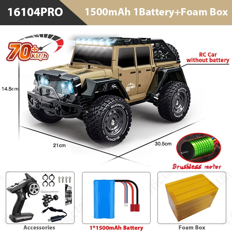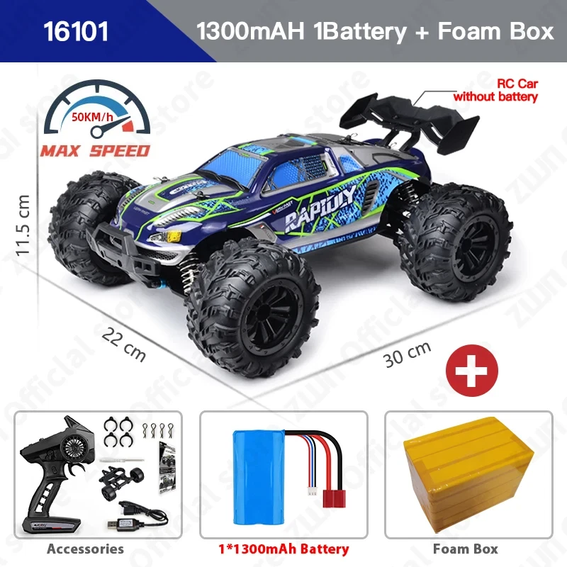eBay Note1: Batteries come in styles 1 and 2, and are shipped randomly Note2: 1. Brushless model:16101PRO, 16102PRO, 16103PRO, 16104PRO. Brushed model:16101, 16102, 16103. 2. The ideal speed of 16101PRO, 16102PRO, 16103PRO, 16104PRO is 70KM/H, but the actual speed will be affected by other factors such as the venue. The actual speed of 16101PRO, 16102PRO, 16103PRO, 16104PRO is about 60KM/H. The ideal speed of 16101, 16102, 16103 is 50KM/H, but the actual speed will be affected by other factors such as the site. The actual speed of 16101, 16102, 16103 is about 35KM/H. 3. This is not an ordinary toy remote control car, because the remote control car is too fast, it is recommended to use remote control car in open areas to avoid bumping into obstacles. 4. The retail package is made of foam boxes, which can reduce the damage to the product during transportation. Original boxes are not included. Please note when using the battery: 1. When the battery is dead, it must be charged in time to ensure that the battery has surplus power. If the battery is completely empty, the battery will not be able to charge 2. When charging the battery, disconnect the connection from the remote control car. Be sure to take the battery out to charge it separately 3. If you do not use the remote control car, please disconnect the battery from the wire of the remote control car, absolutely do not connect, and fully charge the battery, otherwise it will damage the battery Suggest that everyone buy multi-battery package, so play more fun!! We recommend: that you watch the video and read our description carefully before you buy ZWN 1:16 70KM/H 4WD RC Car With LED Headlight Remote Control Cars High Speed Drift Monster Truck for Kids vs Wltoys 144001 Toys Note: Please note to distinguish the model before purchasing the order. The model parameters are as follows: 1. Ltem Name:16101PRO/16102PRO Size:30*23*11.5CM Maximum speed:70KM/H Battery:7.4V 1300mAh/1500mAh Driving motor:2840 brushless motor (4000 KV value) Weight:1000g Working time:16Mins 2. Ltem Name:16101/16102 Size:30*23*11.5CM Maximum speed:50KM/H Battery:7.4V 1300mAh Driving motor:RC390 high-speed carbon brush strong magnetic Weight:930g Working time:15Mins 3. Ltem Name:16103 Size:30*23*13.8CM Maximum speed:50KM/H Battery:7.4V 1300mAh Driving motor:RC390 high-speed carbon brush strong magnetic Weight:900g Working time:15Mins Features 1. The simulation structure design is adopted, which has the control feeling of a real car, and realizes full-scale continuously variable speed change, high-speed driving, rapid acceleration, deceleration, braking, reversing, left turn, right turn; 2. Applicable site: flat, sand, mud, grass. 3. Four-wheel drive: front and rear upright spring shock absorption, double wishbone independent suspension system; 4. 2.4G full-scale synchronous remote control system. Full-scale throttle/steering; 5. Metal differential, metal differential cup, powder planetary gear, powder driving gear, powder main gear; 6. Metal CVD front drive shaft, metal rear dog bone, metal wheel cup; 7. Three-wire 17G digital servo; 8. 7.4V, 18650-1300mAh/1500mAh Li-ion battery (T plug), discharge rate 15C; 9. New remote control panel function: rudder size adjustment; 10. The whole vehicle adopts 16 ball bearings; 11. Metal second floor, metal front and rear arm yards, metal middle drive shaft; 12. The car shell adopts high toughness explosion-proof PVC car shell; 13. Equipped with LED headlights; (three modes: always on, slow flash, fast flash); 14. Equipped with head-up wheel; 15. Simulation of big feet tires, strong grip; 16101PRO ● 1:16 OFF-ROAD HIGH SPEED CAR ● 50KM/H+ All-terrain adaptation ● 3 eye-catching configurations ● 3 major el ectronic configurations ● 8 body structures ● Multiple exclusive Configuration introduction ● Big ofi-road tires ● Professional deployment and craftsmanship ● Multiple exclusive Configuration introduction ● High-brightness LED lights ● Planetary gear differential ● Equipped with head-up wheel ● 6 majors Design configuration function ● High strength and toughness ● 2.4GHz remote control --About Guarantee: 1. 12 months Manufacturer`s limited Warranty for defective items (excluding items damaged and/or misused after receipt). Accessories come with a 3-month warranty. 2. Defective items MUST BE reported and returned within the warranty period (and in the original packaging, if possible). You must tell us what the defect is and give us your order number. WE DO NOT REPAIR OR REPLACE ITEMS WITH AN EXPIRED WARRANTY. You agree to all of the above-listed policies upon ordering on aliexpress! --About Feedback: We maintain high standards of excellence and strive for 100% customer satisfaction! Feedback is very important We request that you contact us immediately BEFORE you give us neutral or negative feedback, so that we can satisfactorily address your concerns. It is impossible to address issues if we do not know about them!