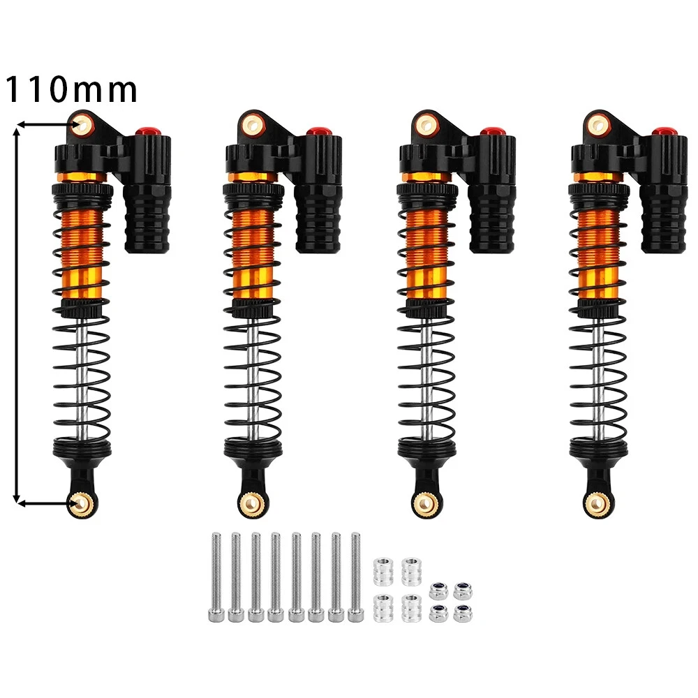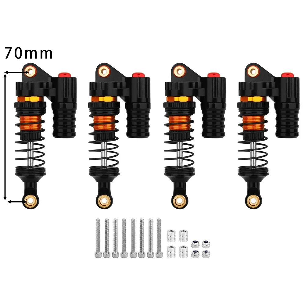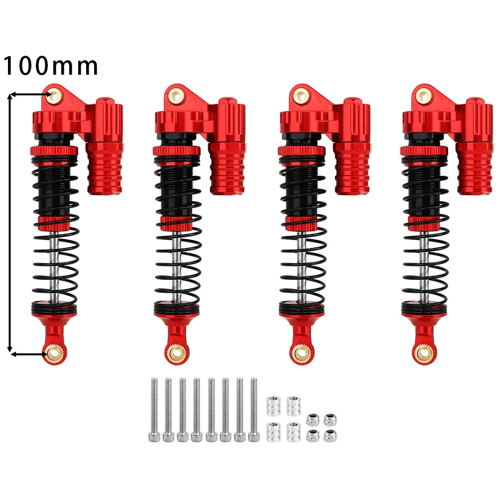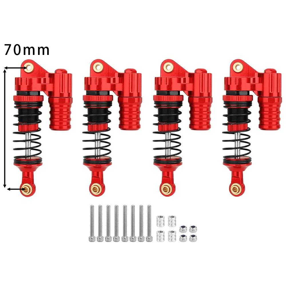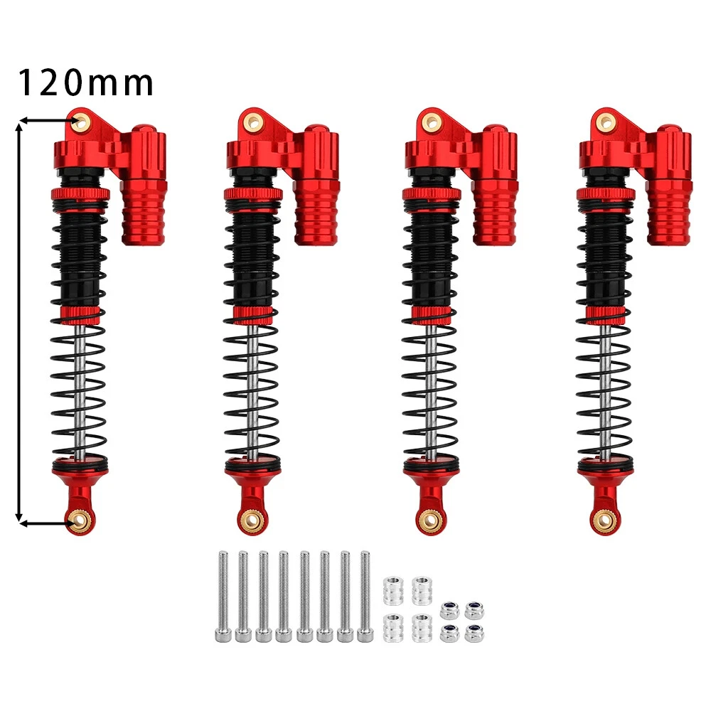 Note: Need to choose the length (hole to hole of rod end) and quantity when place a order Features: CNC machined aluminum shock body Easy load shock seal assembly Come with spare springs, screws and washers Smooth and excellent damping effect Suit for 1/10 RC Car Crawler, such as SCX10 90046 TRX4 Specifications: Material: Aluminum and Plastic Quantity: 4PCS/lot Color: Black/ Titanium /Titanium Red/ Red Shock Body Diameter: 12mm Head Ball Length:7.5mm Ball Hole: 3mm Hole to Hole Length : 70 mm/ 80 mm/ 90 mm/ 100 mm/ 110 mm/ 120 mm After Compression : 58 mm/ 60 mm/ 65 mm/ 71 mm/ 75 mm/ 80 mm Net Weight : 132g/134g/141g/150g/155g(4pcs per set)