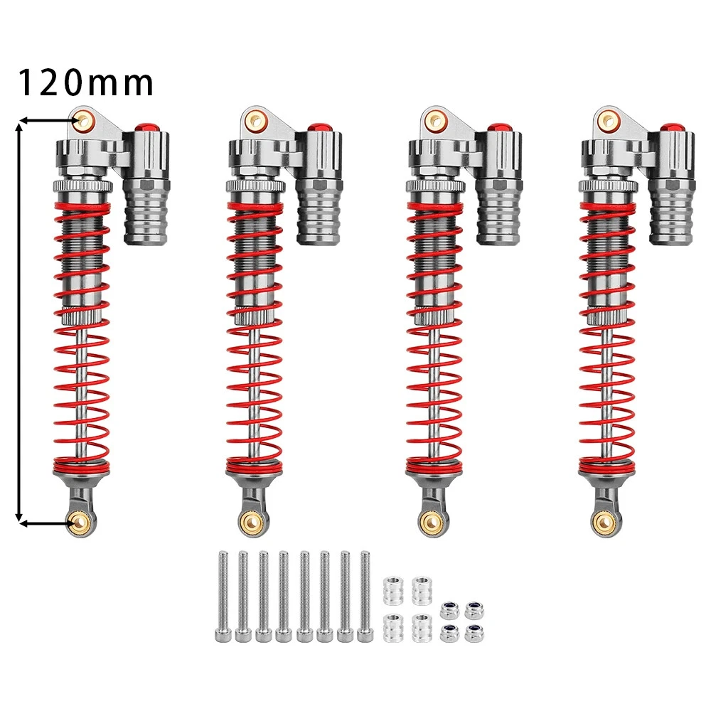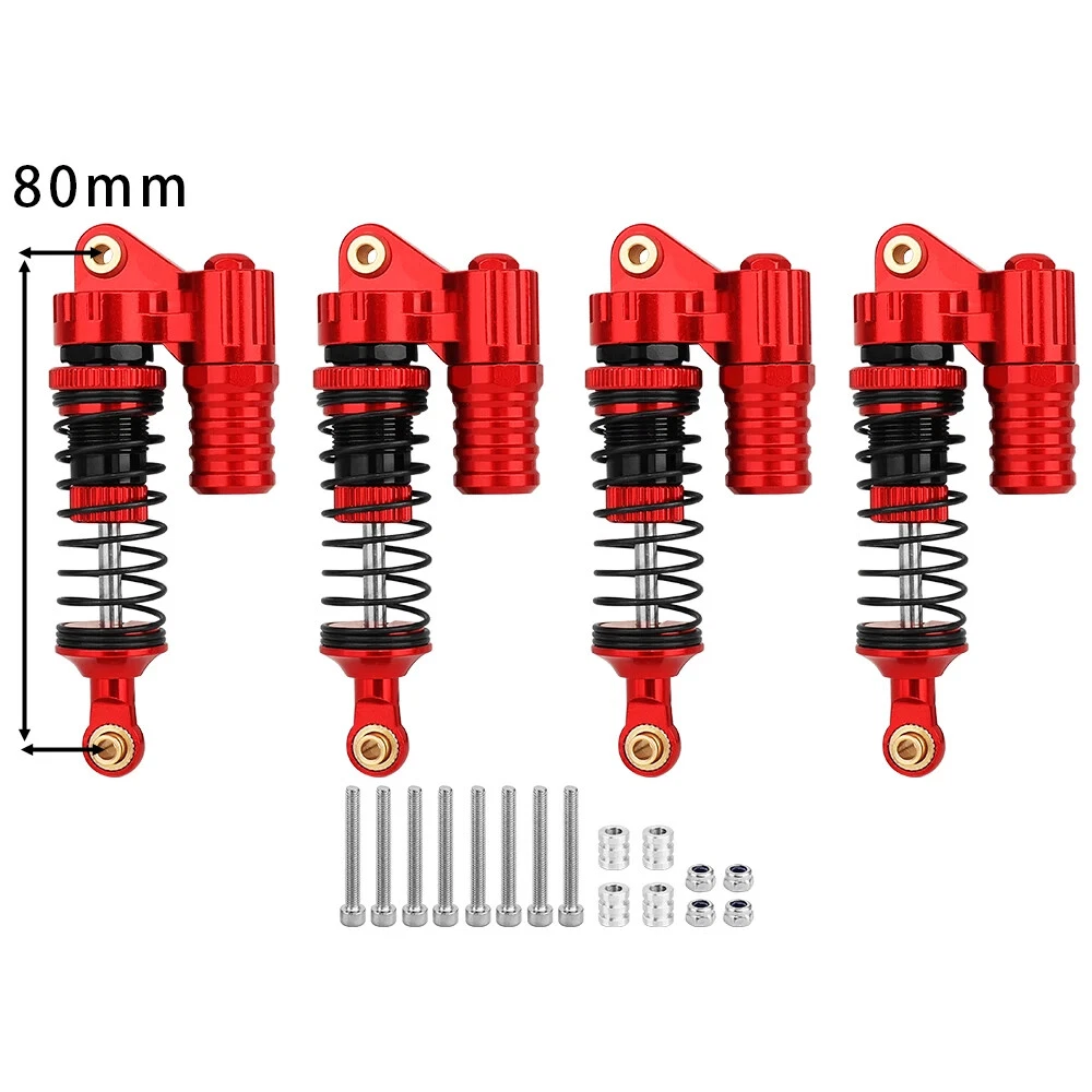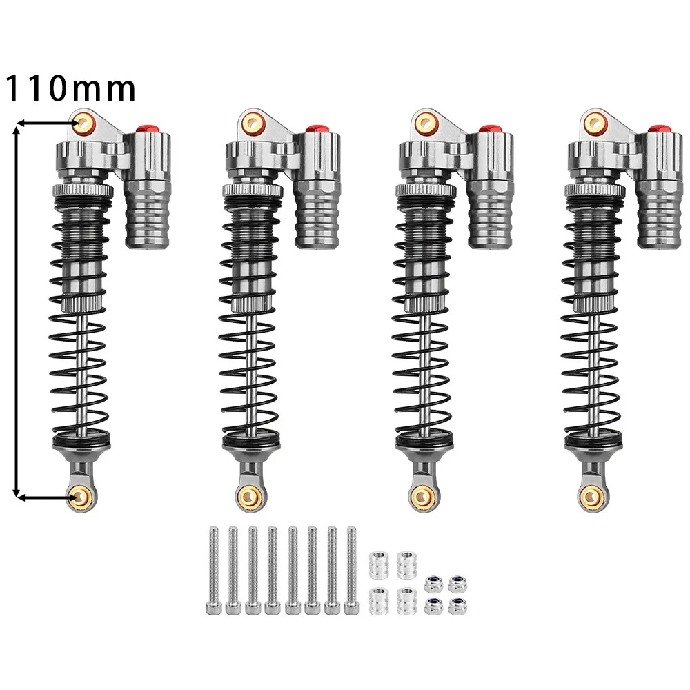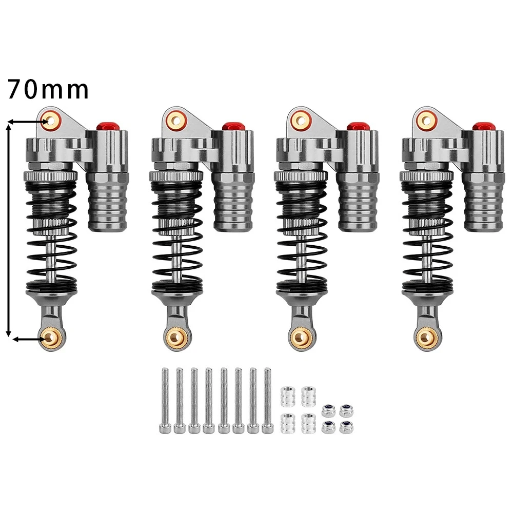 Note: Need to choose the length (hole to hole of rod end) and quantity when place a order Features: CNC machined aluminum shock body Easy load shock seal assembly Come with spare springs, screws and washers Smooth and excellent damping effect Suit for 1/10 RC Car Crawler, such as SCX10 90046 TRX4 Specifications: Material: Aluminum and Plastic Quantity: 4PCS/lot Color: Black/ Titanium /Titanium Red/ Red Shock Body Diameter: 12mm Head Ball Length:7.5mm Ball Hole: 3mm Hole to Hole Length : 70 mm/ 80 mm/ 90 mm/ 100 mm/ 110 mm/ 120 mm After Compression : 58 mm/ 60 mm/ 65 mm/ 71 mm/ 75 mm/ 80 mm Net Weight : 132g/134g/141g/150g/155g(4pcs per set)