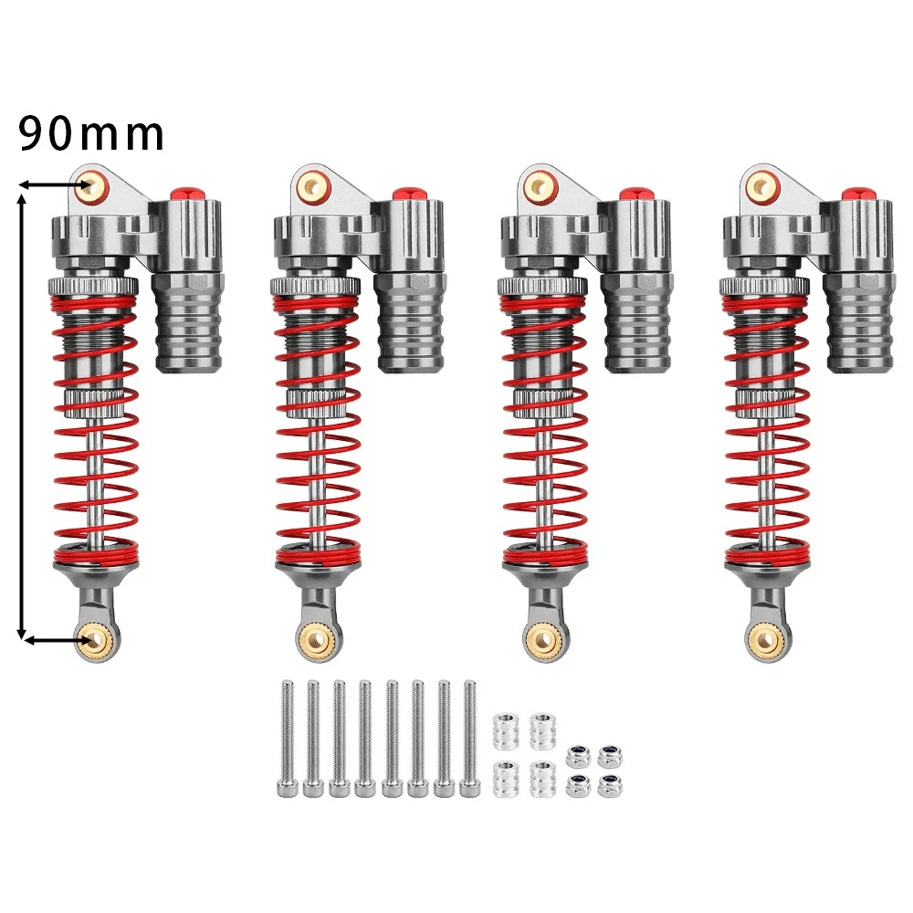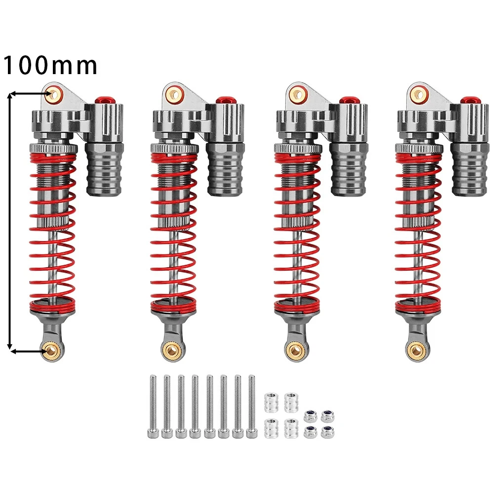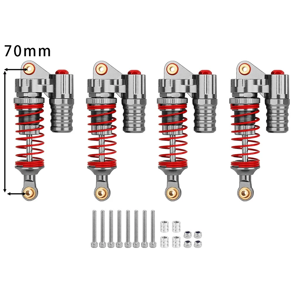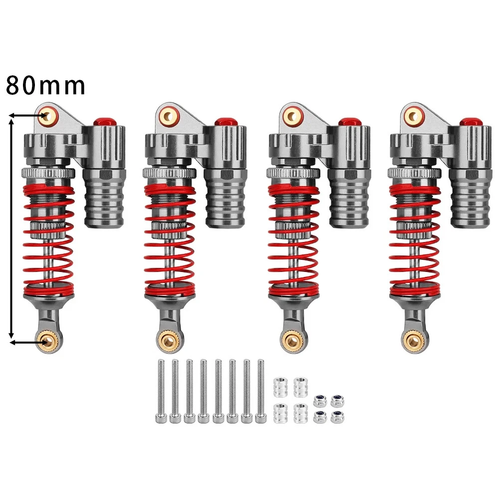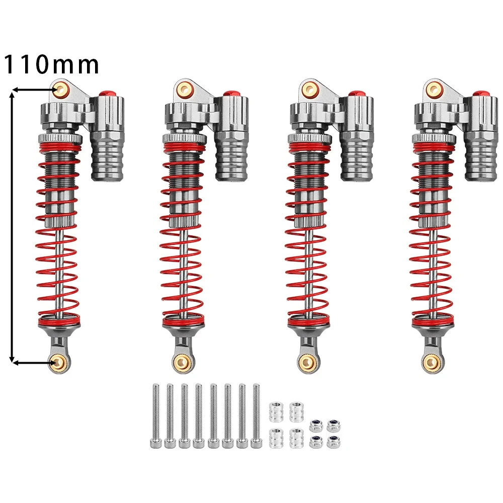 Note: Need to choose the length (hole to hole of rod end) and quantity when place a order Features: CNC machined aluminum shock body Easy load shock seal assembly Come with spare springs, screws and washers Smooth and excellent damping effect Suit for 1/10 RC Car Crawler, such as SCX10 90046 TRX4 Specifications: Material: Aluminum and Plastic Quantity: 4PCS/lot Color: Black/ Titanium /Titanium Red/ Red Shock Body Diameter: 12mm Head Ball Length:7.5mm Ball Hole: 3mm Hole to Hole Length : 70 mm/ 80 mm/ 90 mm/ 100 mm/ 110 mm/ 120 mm After Compression : 58 mm/ 60 mm/ 65 mm/ 71 mm/ 75 mm/ 80 mm Net Weight : 132g/134g/141g/150g/155g(4pcs per set)