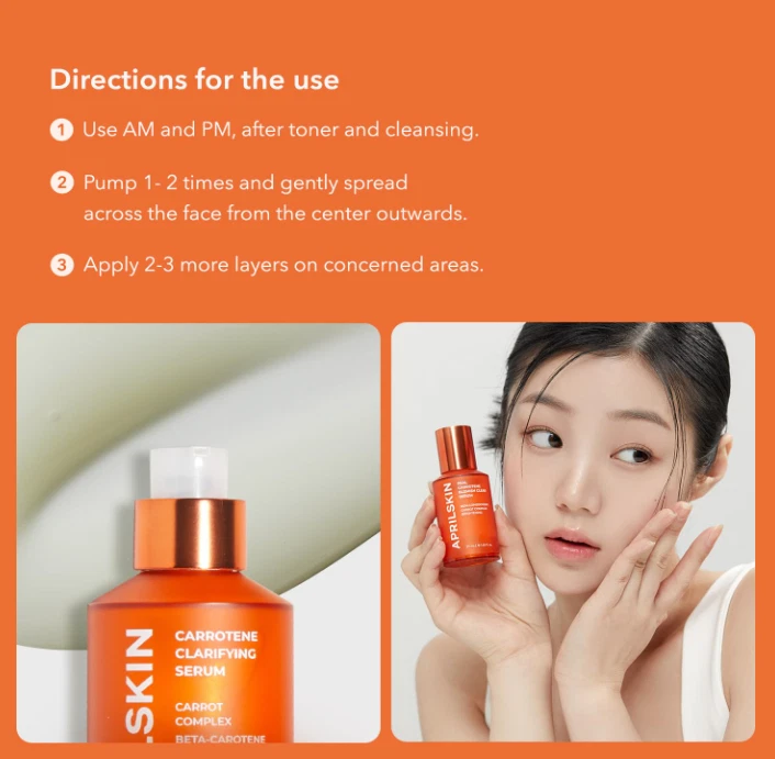 This listing is for Four (4) 0.33 fl oz. tubes of Aprilskin Carrotene Clarifying Serum. Carrot Complex 10,001PPM with Centella Asiatica Non-comedogenic serum powered by pro-vitamin A, Beta-carotene, fights off bumps and various skin troubles. Infused with a potent blend of carrot complex 10,001PPM, this serum encapsulates the concentrated soothing energy of carrots in one bottle. Beta-carotene, a precursor to Vitamin A, helps control excessive sebum production while improving hydration levels and texture. Care for your acne-prone and sensitive skin with soothing energy straight from nature. Remember, no picking or poking! Let the Carrotene serum handle it for you! • Suitable for all skin types: Free from artificial fragrance, color, parabens, sulfates, gluten, or alcohol. Vegan Certified and dermatologist-tested, making it perfect for acne-prone and sensitive skin. • Intensified Sebum Care: Beta-carotene, a natural ingredient proven to regulate sebum production, ensuring effective sebum control. • Non-comedogenic: Dermatologist-tested and certified suitable for acne-prone skin, with a lightweight texture that doesn't clog pores. Beta-carotene Rich in antioxidant properties, beta carotene helps to strengthen the skin barrier by protecting the skin from free radicals. It also helps to calm redness, so you can leave the house with a glowing skin! Niacinamide Controls abnormal behavior of pores, smoothes skin texture, and raises the overall hydration level of your skin. Niacinamide also helps fade hyperpigmentation and refines overall skin tone. Centella Asiatica Extract Helps alleviate skin redness and strengthen the skin barrier INGRENDIENTS Water, Butylene Glycol, Glycerin, 1,2-Hexanediol, Niacinamide, Cetyl Ethylhexanoate, Daucus Carota Sativa (Carrot) Seed Oil, Cetearyl Olivate, Propanediol, Carbomer, Sorbitan Olivate, Tromethamine, Houttuynia Cordata Extract, Ethylhexylglycerin, Adenosine, Hydrolyzed Extensin, Tricholoma Matsutake Extract, Disodium EDTA, Hydrolyzed Cicer Seed Extract, Rhododendron Chrysanthum Leaf Extract, Citrus Aurantium Bergamia (Bergamot) Fruit Oil, Sodiume Hyluronate, Hyaluronic Acid, Hydrolyzed Hyaluronic Acid, Castanea Crenata (Chestnut) Shell Extract, Lavandula Angustifolia (Lavender) Flower Extract, Eucalyptus Globulus Leaf Oil, Pogostemon Cablin Oil, Caprylic/Capric Triglyceride, Melaleuca Alternifolia (Tea Tree) Leaf Oil, Daucus Carota Sativa (Carrot) Root Water, Hydrogenated Lecithin, Polyglyceryl-10, Oleate, Centella Asiatica Extract, Beta-Carotene (CI 75130)