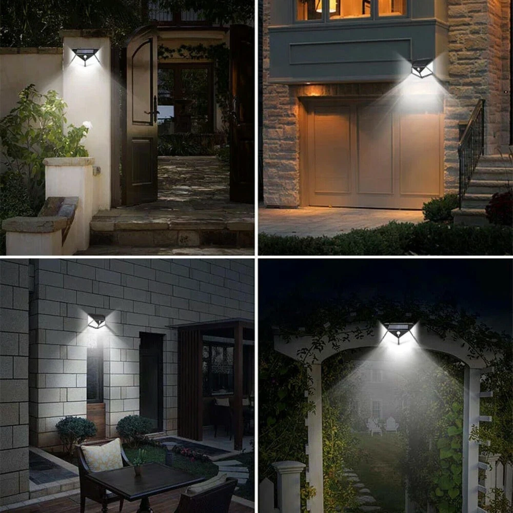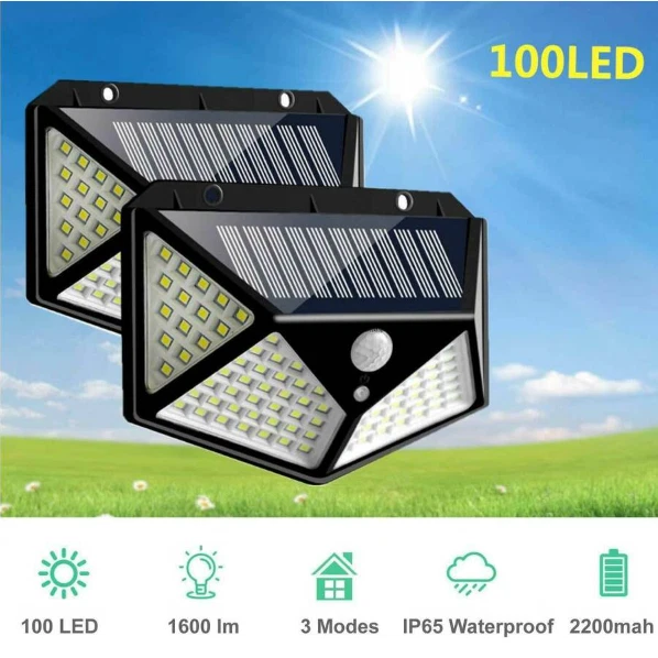 Solar Power 100 LED Light PIR Motion Sensor Outdoor Security Lamp Wall Garden 100 LED PIR Motion Sensor Wall Security Light Solar Power Waterproof Outdoor Garden Patio Path Light - 1 Pack 【 Eco-friendly Product 】 100 LED solar wall light added indicator is a product that designed to be energy saving and environmental protecting. It has long durability and long-life span. More than that, it has low fault repair rate and high radiation stability which makes it an awesome product. 【 Easy to Install 】 100 LED solar wall light is very simple to install, no wiring is needed. Just find a spot and use the 2 Screws to fix the wall light to the outdoor well sun-lit location. 【 Easy to use 】 100 LED solar waterproof four-sided human body induction wall light switch front setting is easier to operate. It has 3 setting which you can achieve by pushing the button in the middle. It has intelligent light-sensing sensor and wide range lighting angle. Description and Features 3 Modes Available - Mode 1. Medium Bright: When the night falls, the solar light will maintain 1/2 brightness. - Mode 2. Dim Bright + Full Bright : Slight brightness when no motion is detected. When motion is activated, it lights up in full brightness and turns back to slight brightness when motion is no longer detected. - Mode 3. No Bright + Full Bright : No brightness when no motion is detected. When motion is activated, it lights up in full brightness and turns back to no brightness when motion is no longer detected. - Can be widely used for garden, patio yard, deck garage, pathway porch in most kinds of weather. Weather Resistance - Our units are made of high-impact ABS which can withstand snow, rain and other extreme weather conditions. IP65 waterproof and heatproof, solar powered lights, suitable for most kinds of weathers. 270 ° Wide Angle -The solar wall lights by using exclusive 4-Side Built-in LEDs Wide-angle Lighting Design, the illumination range can be improved up to 270°. So, the coverage area has been upgraded almost three times than before. Sufficient Use Time - It can be used more than 10 hours after charging, which is more convenient. Packing list: 4* Solar Light 8 * Screw 1 * English manual Detail Images