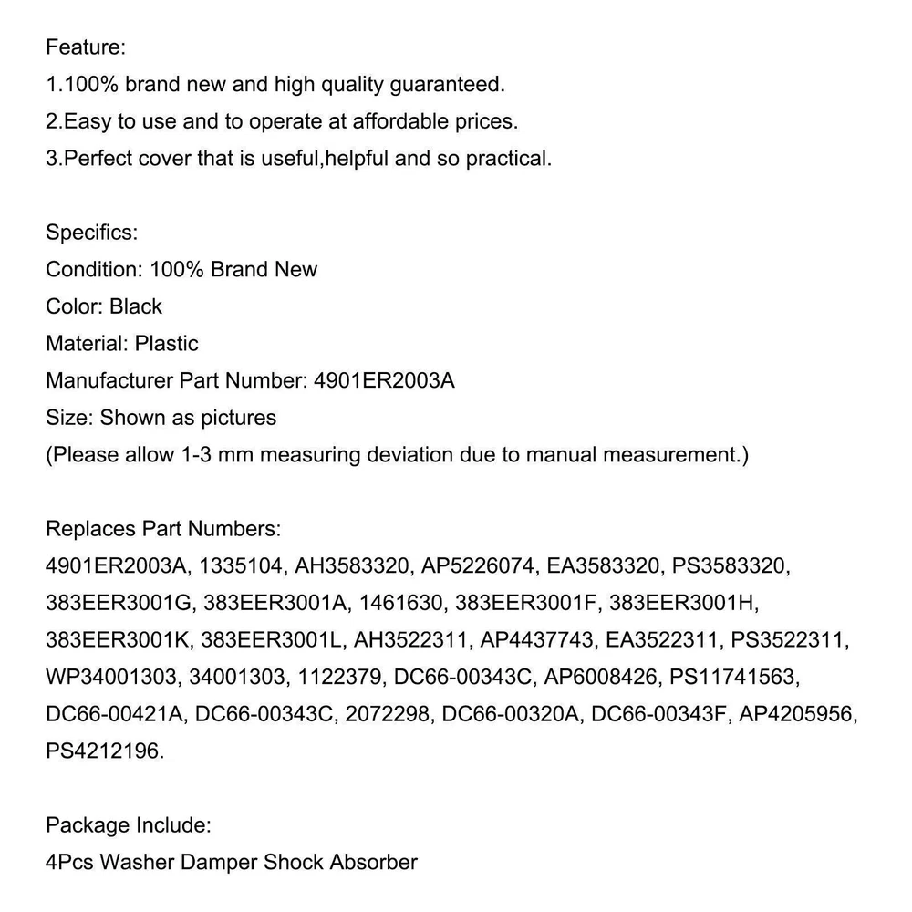 A Fantastic Shop Send us a message Our Store Seller Profile Feedbacks Save this seller Contact 4X Washer Damper Shock Absorber Replacement For LG Washing 4901ER2003A YU Feature: 1.100% brand new and high quality guaranteed. 2.Easy to use and to operate at affordable prices. 3.Perfect cover that is useful,helpful and so practical. Specifics: Condition: 100% Brand New Color: Black Material: Plastic Manufacturer Part Number: 4901ER2003A Size: Shown as pictures (Please allow 1-3 mm measuring deviation due to manual measurement.) Replaces Part Numbers: 4901ER2003A, 1335104, AH3583320, AP5226074, EA3583320, PS3583320, 383EER3001G, 383EER3001A, 1461630, 383EER3001F, 383EER3001H, 383EER3001K, 383EER3001L, AH3522311, AP4437743, EA3522311, PS3522311, WP34001303, 34001303, 1122379, DC66-00343C, AP6008426, PS11741563, DC66-00421A, DC66-00343C, 2072298, DC66-00320A, DC66-00343F, AP4205956, PS4212196. Package Include: 4Pcs Washer Damper Shock Absorber About US About Our Items We strive to describe all items accurately and thoroughly, with the utmost care and attention to detail. However, to ensure a mutually satisfactory transaction, we kindly ask for your assistance in thoroughly reviewing the item description and photos, and addressing any questions before placing a bid. Customer Satisfaction We stand behind our commitment with exceptional service, a 100% money-back guarantee, and a dedication to customer satisfaction. I am readily available to address any inquiries or concerns you may have, both before and after your purchase. Our aim is to ensure your shopping experience is enjoyable and that you're delighted with your purchase. Feedback Your feedback is crucial to our business's success. If you're satisfied with your purchase and the service you received, we would greatly appreciate your positive feedback, along with an overall Detailed Selling Rating (DSR) of 5. Please take a moment to leave us positive feedback. Our eBay account is set up to automatically reciprocate positive feedback once yours is received. If you're considering leaving neutral/negative feedback or opening an eBay/PayPal case, we encourage you to reach out to us immediately. We're committed to resolving any issues to the best of our ability. Shipping Parcel will be shipped using Standard shipping method. For security purposes, items will be shipped exclusively to the confirmed address on Paypal. Please ensure your Shipping address is up to date before proceeding with payment. Estimated delivery time within the United States ranges from 3 to 10 business days, depending on your location. Returns We accept returns within 60 days from the date the buyer receives the item. If the item is found to be defective upon receipt, the customer has up to 30 days from the date of receipt to request an exchange for a new item or a refund. For returns due to a change of mind, we accept items in their original selling condition. However, if the package has been opened due to a mistaken order, it does not qualify for our return policy. Please note that the buyer is responsible for covering the cost of return postage. If you encounter any issues, please reach out to us via eBay message, and we'll respond within 24 hours.