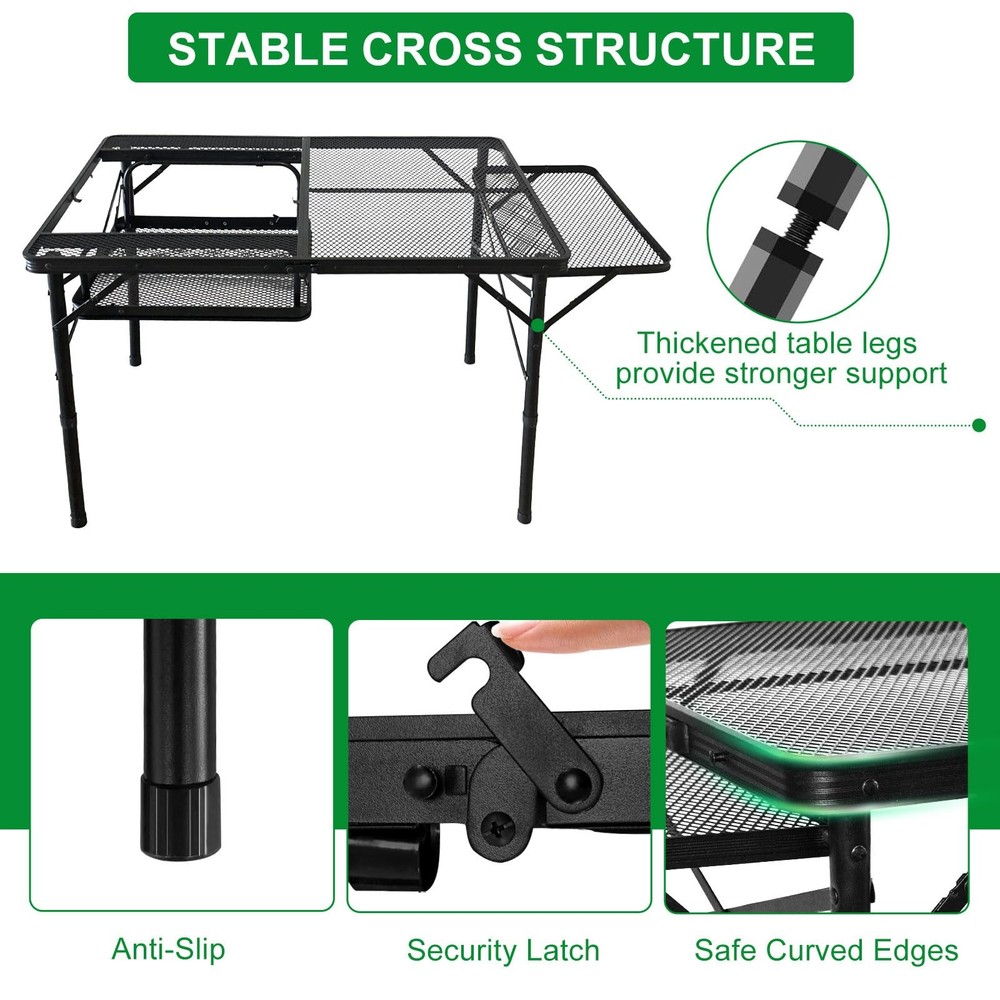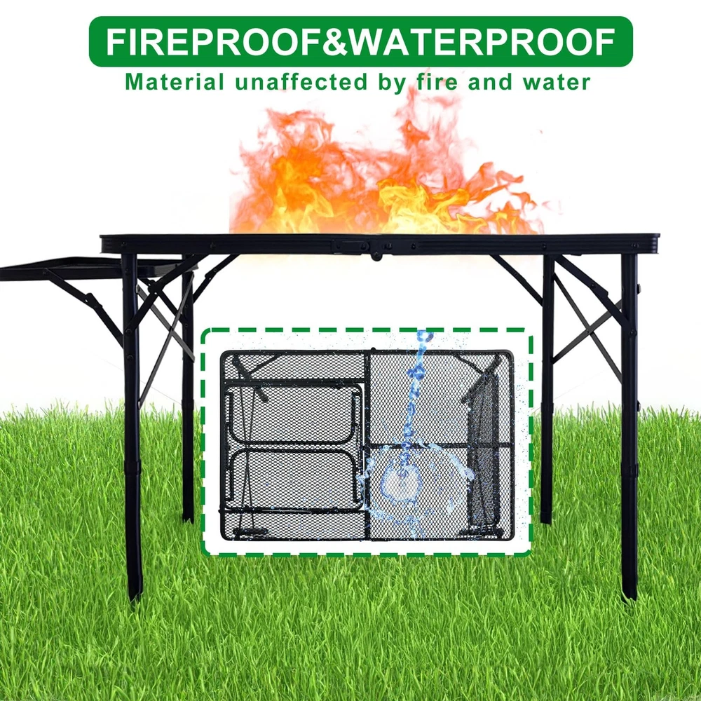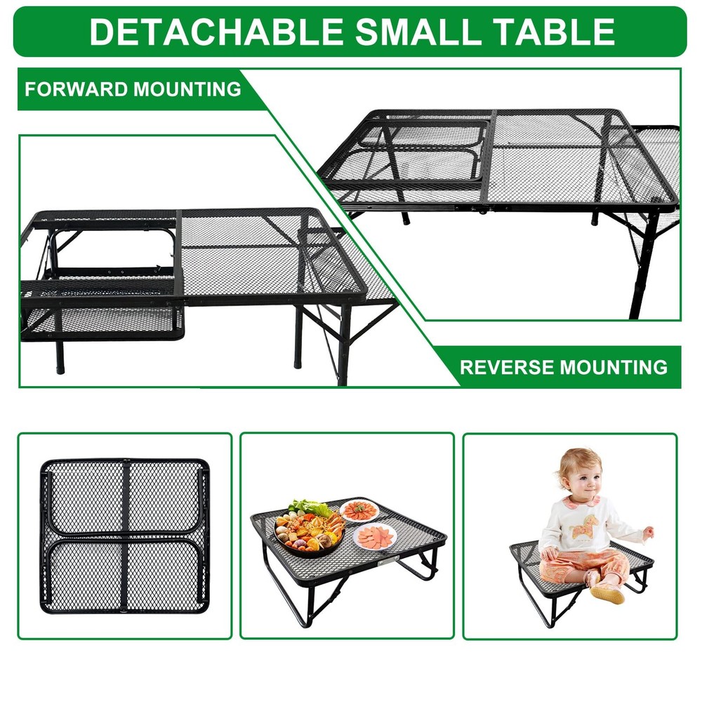 This is an outdoor camping table that can be disassembled into two tables. The camping table is equipped with four external table legs that can be freely adjusted in height, and is also equipped with a grill, and it is high temperature resistant and waterproof. 【More Stable Design】 folding camping table adopts a more stable triangular structure, which can prevent the table from shaking more effectively than the rectangular structure.It comes with thicker external legs for better support and stability. 【Detachable Small Table】folding table Can be disassembled into two folding tables. You can use one large table outside and a smaller table at home, providing more options. The small table has a load-bearing bar, but it is recommended that adults do not sit on it. 【Table + BBQ Grill】This outdoor camping table is equipped with a foldable grill. You can also bring it with your family to have a delicious barbecue in the cold winter. The grill can be folded inside the table for easy carrying. 【Adjustable Height & Easy Installation】 This outdoor grill table has external legs and is adjustable in height from 16" to 26". So you can choose to stand or sit while cooking your meals. 【Waterproof & High Temperature Resistant】Our table is not only waterproof but also fireproof, so you can use it in rainy environments or under high-temperature grills without worry. And it is easy to clean, just wipe it after use.