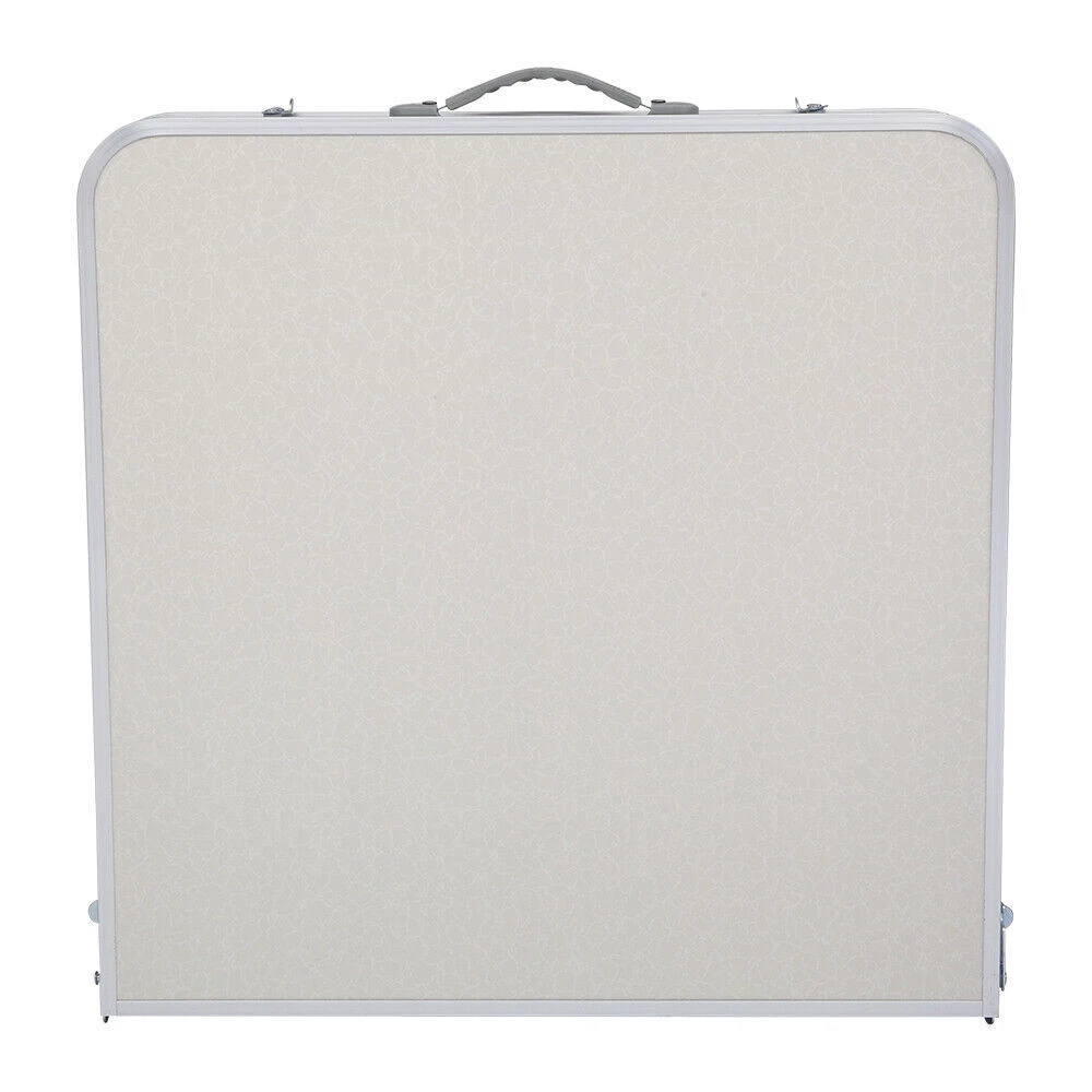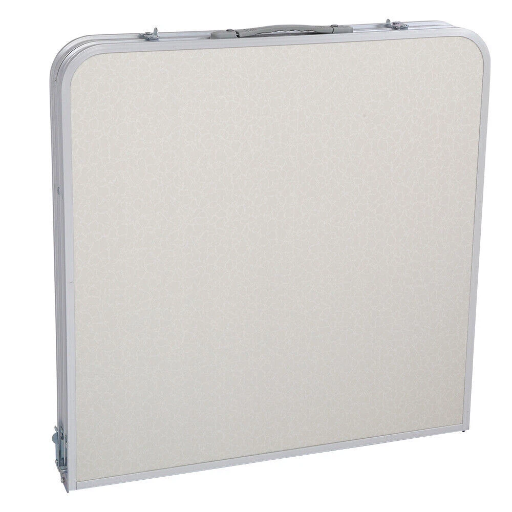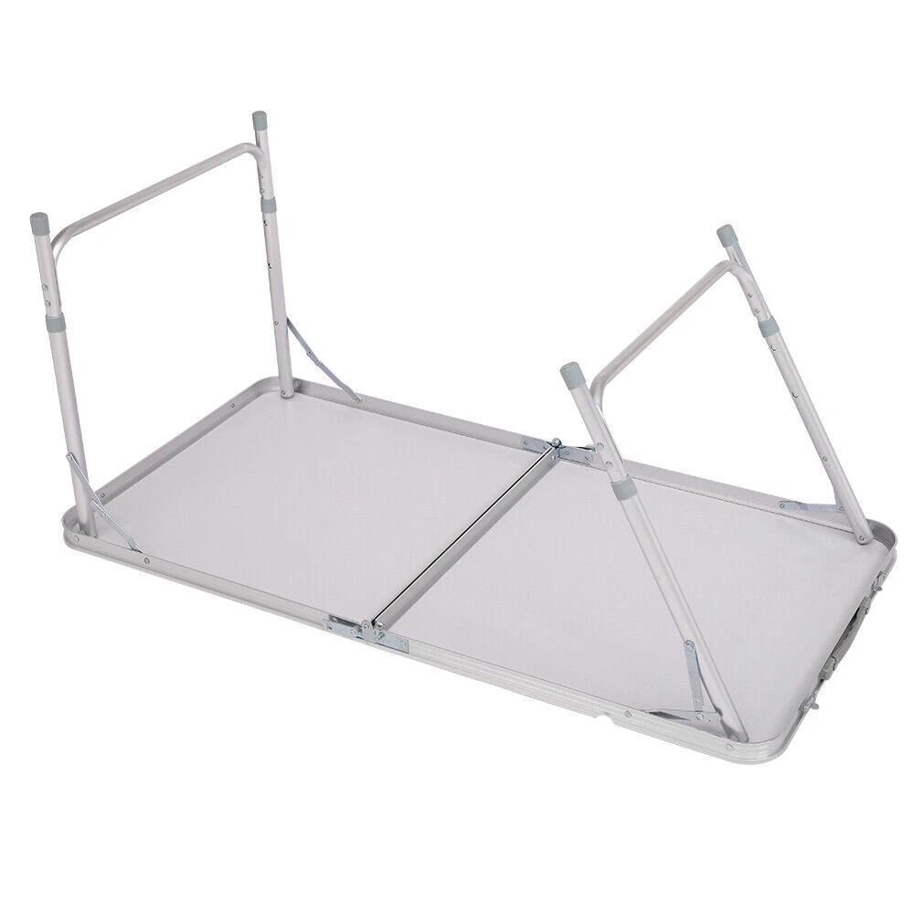 Introductions: This is our 120 x 60 x 70 4Ft Portable Multipurpose Folding Table, which is ideal for family reunions, picnics, camping trips, buffets or barbecues.This table is great for entertaining and can be used as a serving table, game table, or outdoor dinningtable. This table is great for entertaining and can be used as a serving table, game table, or outdoor dinning table. Features: 1. New and high quality 2. Legs can be locked into a fixed position for stability 3. Durable nylon adjustable glides protect floor surfaces 4. Portable design, fold and set for use quickly & easily 5. Height adjustable three block (55cm, 62cm, 70cm) 6. Easy to clean top 7. Folding interior can accommodate four folding chairs, reasonable design, easy to carry out Specifications: 1. Color: White 2. Material: Aluminum & Wooden Board 3. Overall Dimensions: (47.24 x 23.62 x 21.65-27.56)" / (120 x 60 x 55-70)cm(L x W x H) 4. Folded Size: (23.62 x 23.62 x 2.76)" / (60 x 60 x 7)cm(L x W x H) 5. Weight: 10.41 lbs / 4.72 kg 6. Type: Folding Table Package Includes: 1 x Folding Table(No Umbrella Hole) Note:This price does not include stool