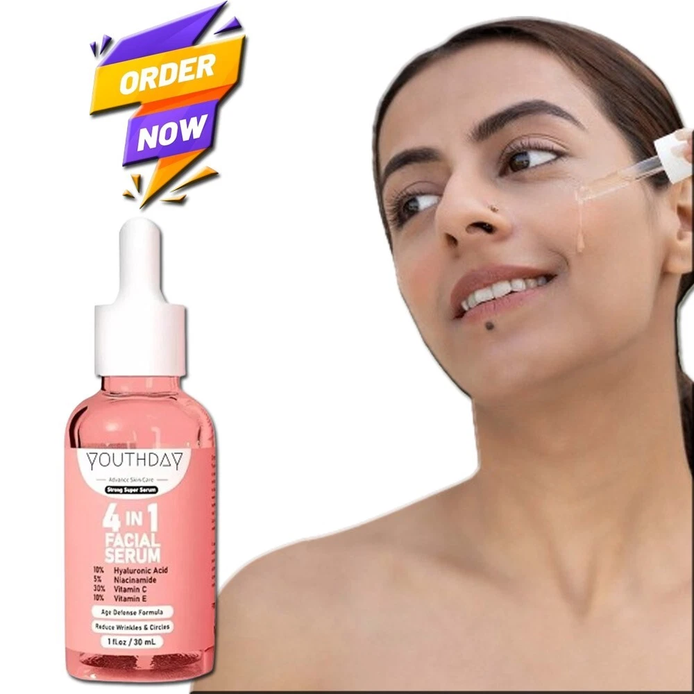 UVA Protection: 1-Star Body Area: Face Scent: Herbal gtin13: NOT APPLY Department: Women Brand: Youthday Volume: 1 fl oz Ingredients: 5% Niacinamide, 30% Vitamin C, 10% Vitamin E, 10% Hyaluronic Acid MPN: NOT APPLY UPC: NOT APPLY Active Ingredients: Hyaluronic Acid, Vitamin E, Vitamin C, Niacinamide Product Line: 4-in-1 Face Serum 30ml Main Purpose: Acne, Age Spots, Age-Defying, Blemishes, Cellulite Treatment, Contour, Dark Circles, Dark Spots, Dimpled Skin, Discoloration, Early Signs of Aging, Eczema, Fatigue, Firming, Freckles, Hydration, Impurities, Lifting, Lightening, Melasma/Hyperpigmentation, Nourishing, Oil Control, Psoriasis Skin Type: All Skin Types Formulation: Serum Features: Alcohol-Free, All Natural Ingredients, Ammonia-Free, Animal Cruelty-Free, Contains Hyaluronic Acid, Mineral Oil Free, Non-Comedogenic, Paraben-Free, Perfume-Free Size: Regular Country/Region of Manufacture: India Set Includes: Brightener Type: Brightener Period After Opening (PAO): 24M Expiration Date: 2025 Sun Protection Factor (SPF): SPF 2
