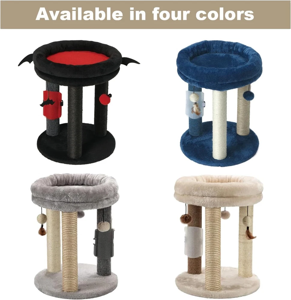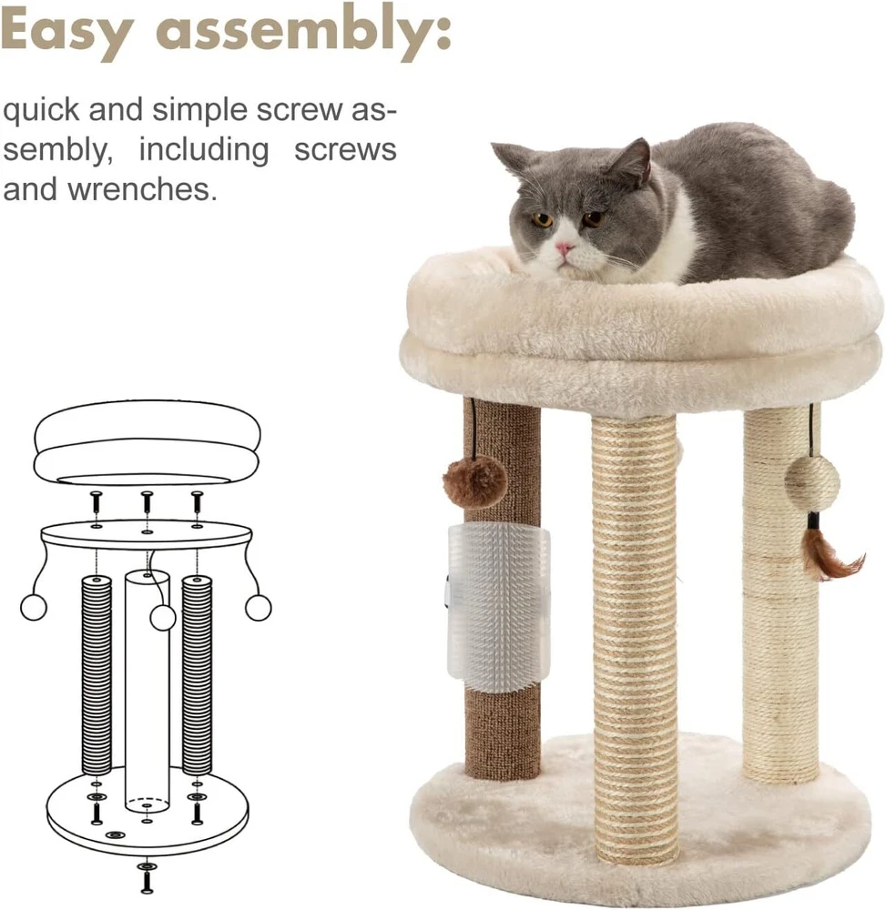 4 in 1 cat tree:Scratching post Cat bed Hanging ball toy Beauty massage brush multiple functions.Meet the cat's daily play, claw grinding, grooming, rest and other activities.A place to play for a long time, addressing multiple needs.Ideal for families with 1-3 cats. Protect the furniture:Sisal, jute, and carpet three materials, three scratch posts for cats to satisfy their natural instincts to claw.Helps keep your cat from damaging carpets, furniture, curtains, and more. Toys and cat Tower beds:Three Hanging balls.Attract cats to slap.Get them used to the toy faster.Massage brush lets them self comb.Collect excess hair and keep it hygienic.A nest-like cat nest is a great addition.Meet your cat's need for a long sleep. Stability and dimension:20.5 inches high.Base is 16 inches in diameter.The large base keeps the column stable.Column is 2.6 inches in diameter.A triangular structure formed by three pillars.Very solid. Easy assembly: We provide a complete set of installation tools and instructions that will let you assemble in minutes. If you have any questions, please contact us and we will give you a satisfactory answer within 24 hours.