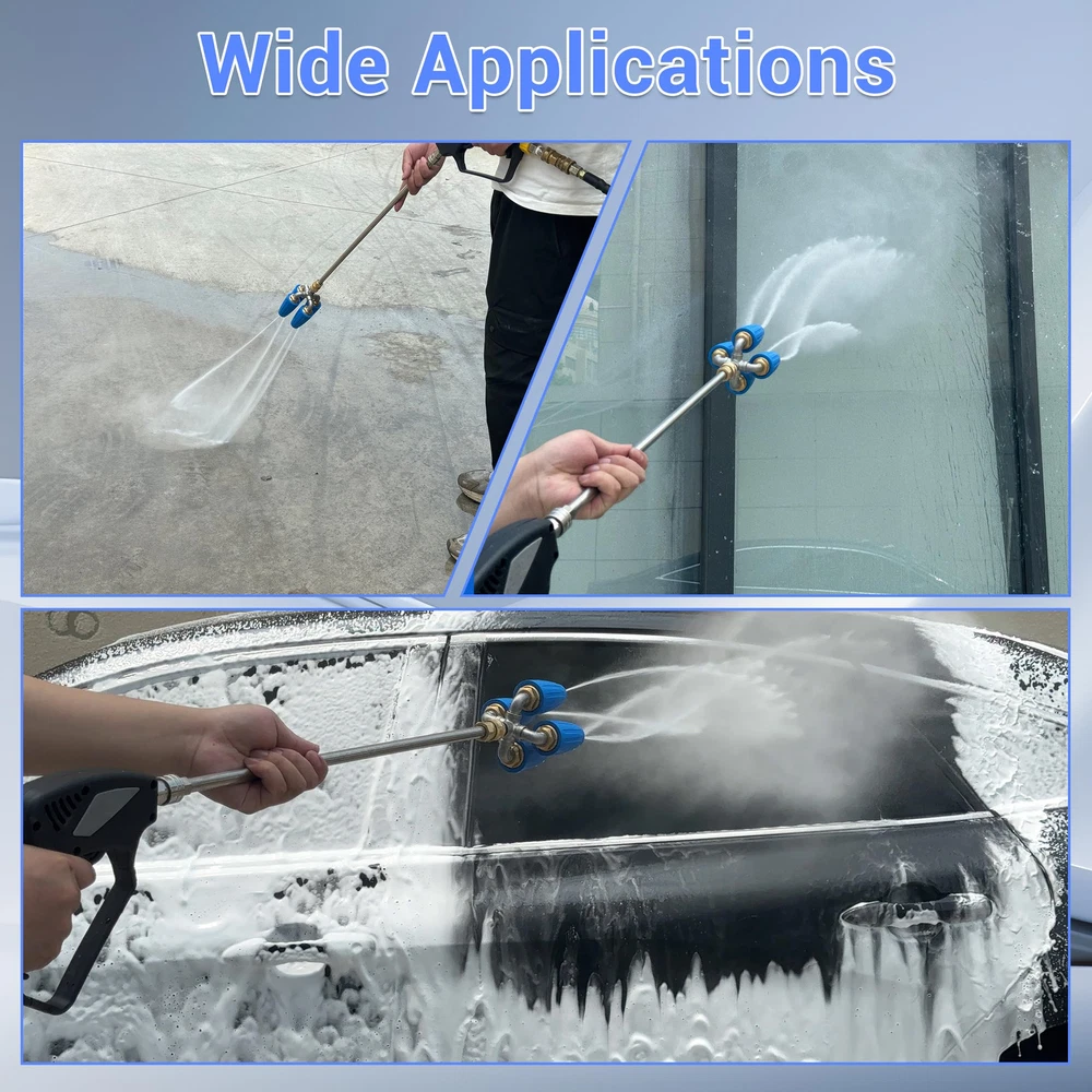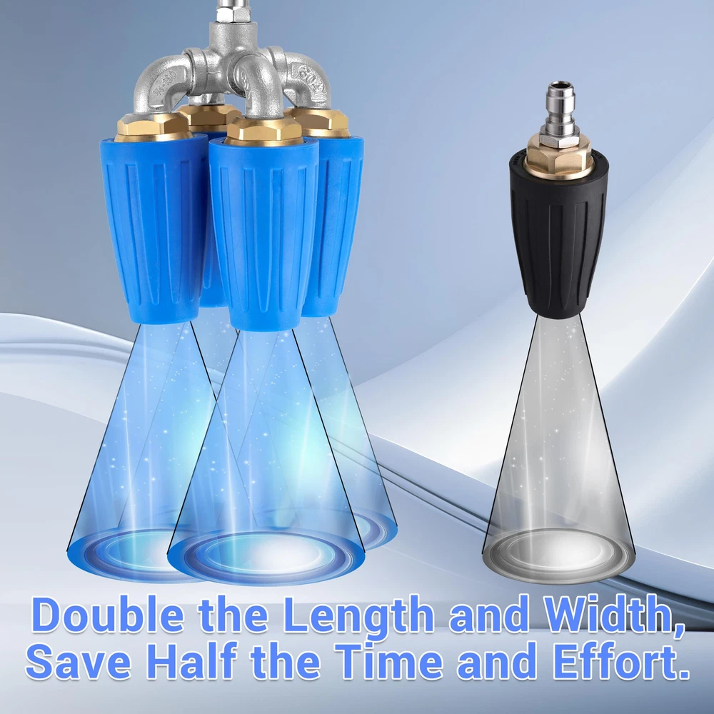【Innovative Upgrade】Quadruple pressure washer turbo nozzle adds a row of dual turbo nozzle on the basis of the dual nozzle, and the spray range is four times that of the single rotating pressure washer nozzle, greatly increasing the spray range and water flow. With a powerful flow of water, 4-in-1 power washer turbo nozzle can quickly and effectively remove stubborn stains on a variety of surfaces, making it the ideal and reliable choice for your cleaning job. 【Wide Application】4-in-1 pressure washer turbo tip is very versatile, it is suitable for a variety of cleaning scenarios, can well meet your needs for fast and efficient cleaning. Pressure washing turbo nozzle can help you easily clean stubborn dirt on various surfaces, and you can use it to clean heavily polluted places such as cars, floors, driveways, walls, decks, etc. turbo nozzle pressure washer 4000 psi will be the best choice for home and commercial cleaning. 【Excellent Quality】Pressure washer rotating nozzle is made of 304 stainless steel, heavy duty solid brass and high quality plastic, which is not easy to rust, non-leakage, corrosion and drop resistance, and has a long service life. Each nozzle orifice size is 2.0, max working pressure is 4000 PSI, max working temperature is 140 ℉/60 ℃ and the gallons per minute is 8.0-12.0. You can rest assured to choose this turbine nozzle, Quadruple rotating turbo nozzle will be a good helper for your cleaning work. 【Easy Connection】Quadruple turbo tip for pressure washer uses a 1/4" quick connection, which can be easily and quickly connected to or disconnected from your pressure washer gun and wand. Turbo pressure washer nozzle is suitable for most pressure washer guns and wands, and provides a strong and steady flow of water to help you clean quickly and effectively. 【Product Quality】is a professional supplier of pressure washer products. We offer a diverse selection of reliable pressure washers designed to meet various needs. Our products are crafted with attention to performance and durability, ensuring they effectively handle your cleaning tasks.