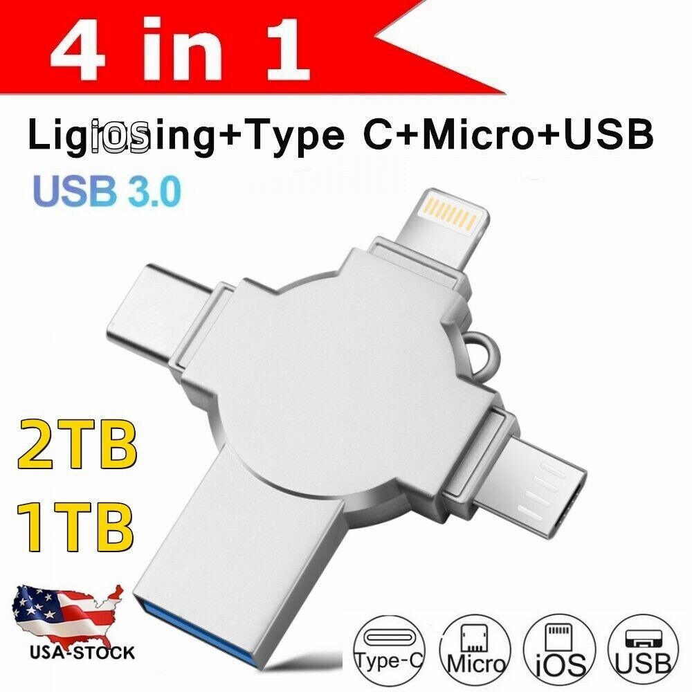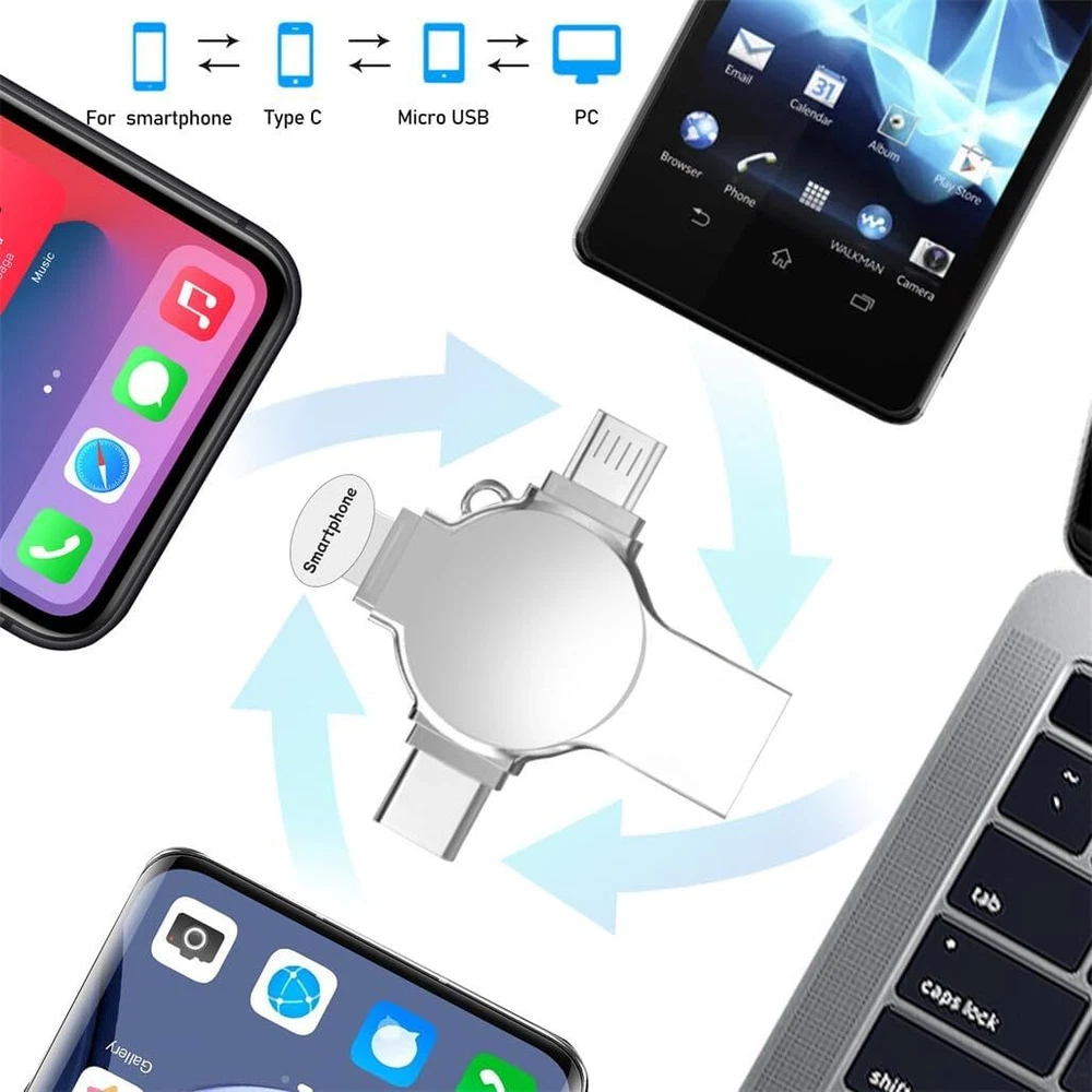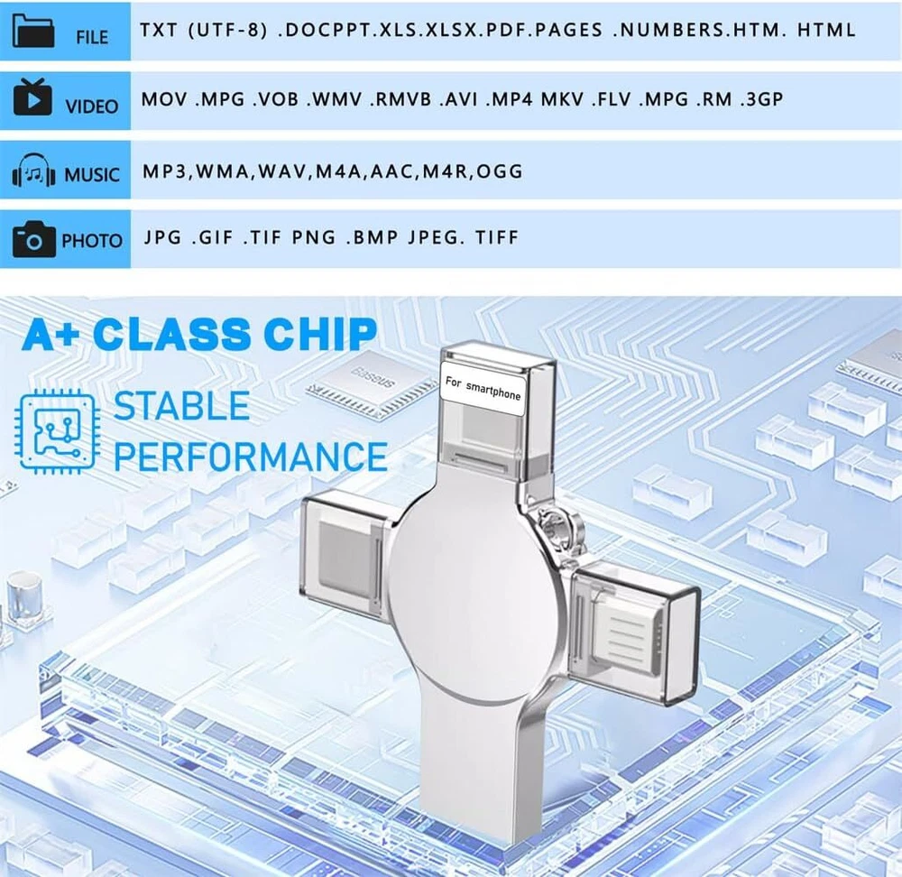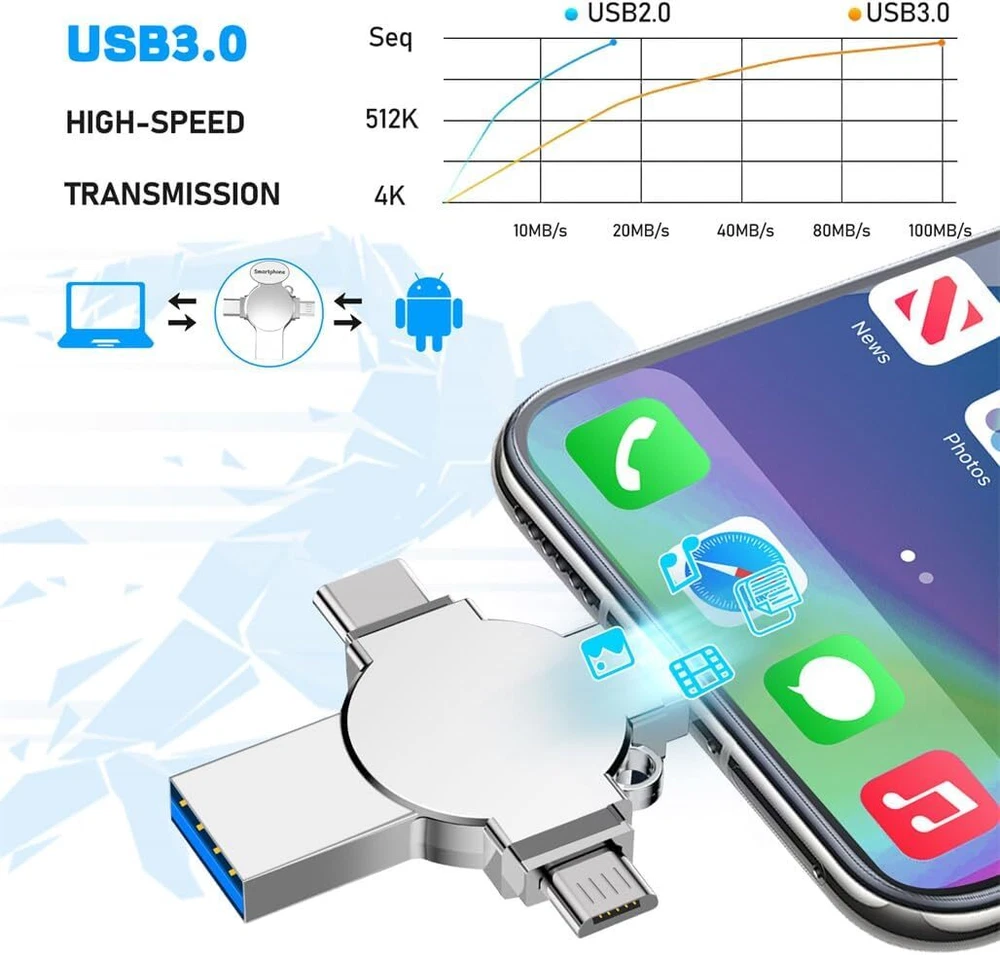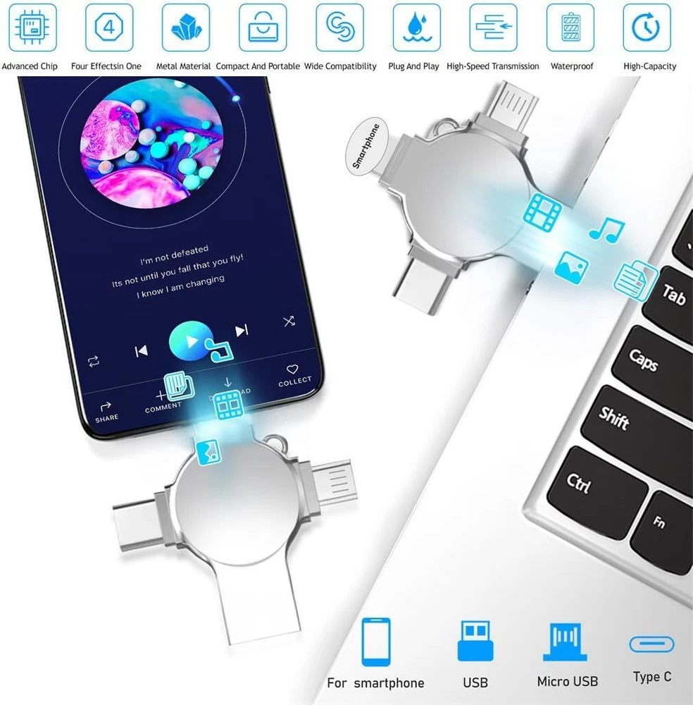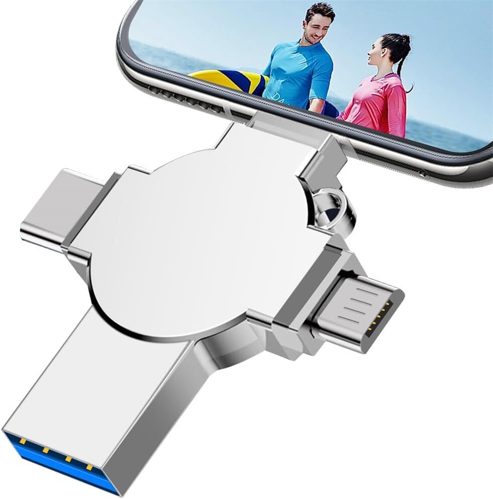 About this item 【4-in-1 Multi-Function Interface】The flash drive has four interfaces (smartphone USB + micro USB + type C + computer USB), which is more convenient for data transfer between different devices, thus getting rid of the trouble of data cables and allowing you to switch easily storage. 【Security Protection of Personal Privacy】The 4 in 1 USB flash drive can fully protect privacy and support some or all file encryption. The encrypted files will not be displayed on the computer. When sharing files, photos and videos with colleagues and friends, there is no need to worry about personal privacy leakage, providing you with comfort and security use experience. 【One-Click Easy Backup】With this flash drive, you can easily back up files, photos, videos and phonebooks on your phone with one click through the APP, eliminating the trouble of pasting and copying, and you can also use the USB port to store your own data backup on the computer as a dual Insurance. (Android phones need to turn on the OTG function, no need to download APP.) 【Stable & High-Speed Transfers】The USB 3.0 memory stick with premium chip guarantees fast and stable data transfer, allowing you to transfer photos, videos and files within seconds. The transfer speed of this USB is faster than ordinary 2.0 version, which has higher performance than ordinary traditional USB storage flash drives, save time and get more work done. 【Portable Streaming Media】There is a metal hole on the USB stick, you can connect it to your backpack. The storage space allows you to watch movies/play music directly on the flash drive, and you can also share photos and videos taken during the trip to Facebook, Twitter and other social media to share beautiful moments