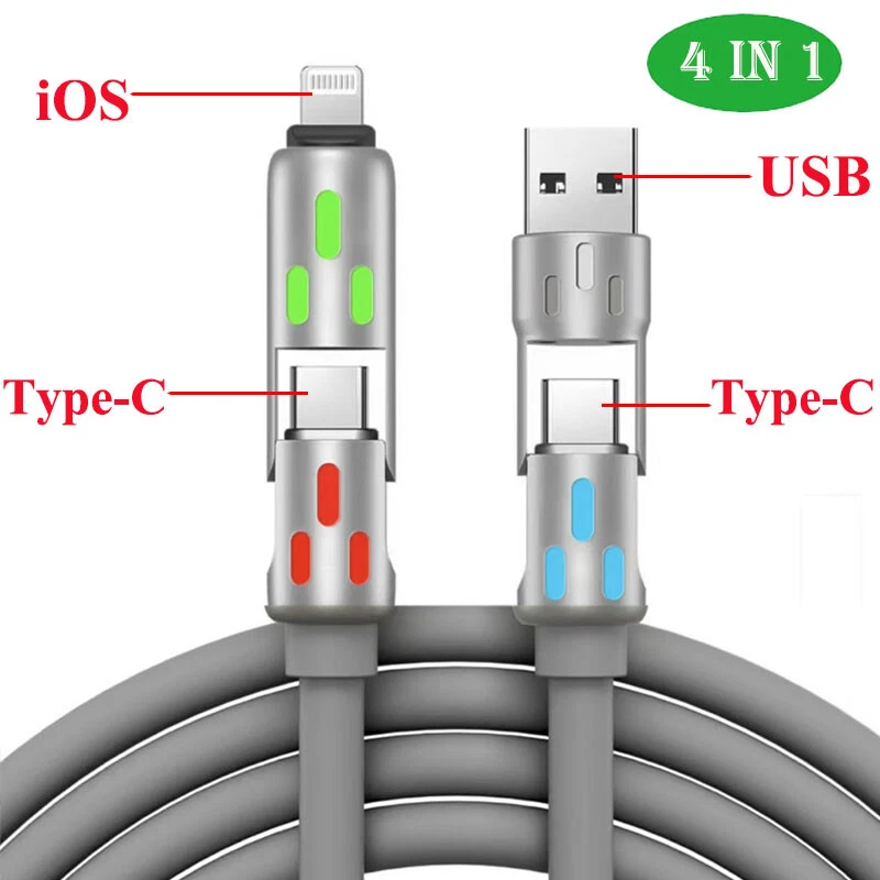 Description: Colorful breathing light fast charging cable 240W fast charging fully Universal with everything High power to low power 240/140100/60/30W device data cables are fully compatible Four modes, four options Four interfaces can be combined at will, multi-protocol full device support can be switched between mobile phones, tablets and other devices 240W fast charging PD full series compatible Support iPhone7-iPhone15 Samsung and other mobile phones compatible Colorful atmosphere lights make charging at night more convenient With soft colorful atmosphere lights, you can find your phone clearly when charging at night Zinc alloy material anti-oxidation process Free plug and unplug,as good as new, full of texture Free bending and long-term use without breaking After 20000+ bending test, wear-resistant and non-breaking, with longer service life Bold gold-plated copper wire charges faster and more stably The conduction area is increased, the resistance is reduced, and the charging and transmission speed is more stable and faster Product name: 4-in-1 liquid silicone data cable Interface: Type-C/USB-A/8pin Function: charging + data transmission Material: zinc alloy + liquid silicone Transmission speed: 480Mbp/s Current: 2.4A/5A Length: 1.2m Color: pearl nickel shell + purple line Applicable models: For Apple/Android/Type-C interface devices include: 1pcs 1.2 4in1 240w liquid silicone data cable