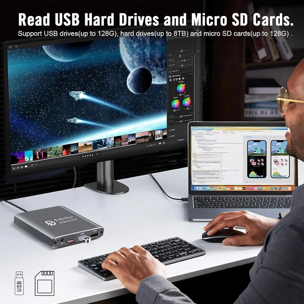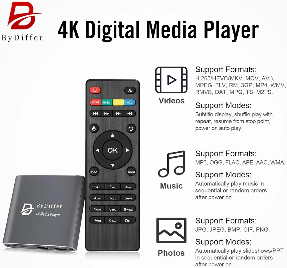 【4K HD Media Player】The digital media player 4K enables any TV(old or new) to play videos, music and photo slideshows/PPT from USB drives or micro SD cards. Enjoying 4K video quality via HDMI output by connecting to TV/monitor/projector and up to 7.1 stereo surround sound via AV/Optical output by connecting to speakers/amplifiers. 【Powerful H.265 Decoding】USB video player supports H.265/HEVC decoding technology up to 4K@30Hz resolution and 200mbps. Compared with H.264 decoding and 1080P resolution, ByDiffer hdmi 4K media player for TV has ultra high definition images, smooth playback with less buffering and less bandwidth occupation. 【Dual USB Ports】Read micro SD cards/USB flash drives(up to 128G)and USB hard drives (up to 8TB). Dual USB2.0 ports can connect two devices, but only read one of them at one time. You can also connect a USB keyboard/mouse/U disk/printer via the USB2.0 port. The mp4 player supports FAT32, exFAT and NTFS file systems. 【Multiple Playback Modes】Videos and photos can be played in sequential orders, and music can be played in random orders. TV player supports automatic playback, the ability to resume video playback from the last stop point and shuffle playback with repeat. Suitable for digital signage applications, home theaters and office work. 【Portable Media Players】Compact and travel design due to the palm size, the pocket USB media player is easy to carry. The gray hdmi media player is made of zinc alloy with fast heat dissipation, better protection, exquisite and superior appearance.