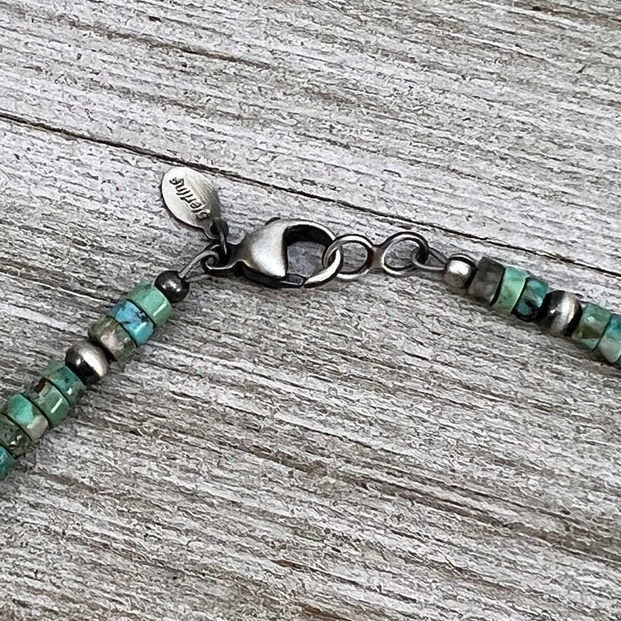 4mm Kingman turquoise with 4mm to 8mm sterling silver beads, Southwest Pearls. The silver beads have been darkened (oxidized) and then polished by hand, leaving the edges dark. This item is made to order. Production time is 1-3 business days. Timeline is dependent upon current volume of orders. Most orders ship in one day. If you have a specific deadline, please contact me before purchasing so your expectations can be met. Everything in the shop is real turquoise and sterling silver. Nothing is plated. You are purchasing one necklace necklaces are measured from end to end choose your length in the drop down box lobster clasp The beads are strung on a strong and flexible, nylon coated, 49 strand stainless steel, professional beading cable Powered by ExportYourStore.com