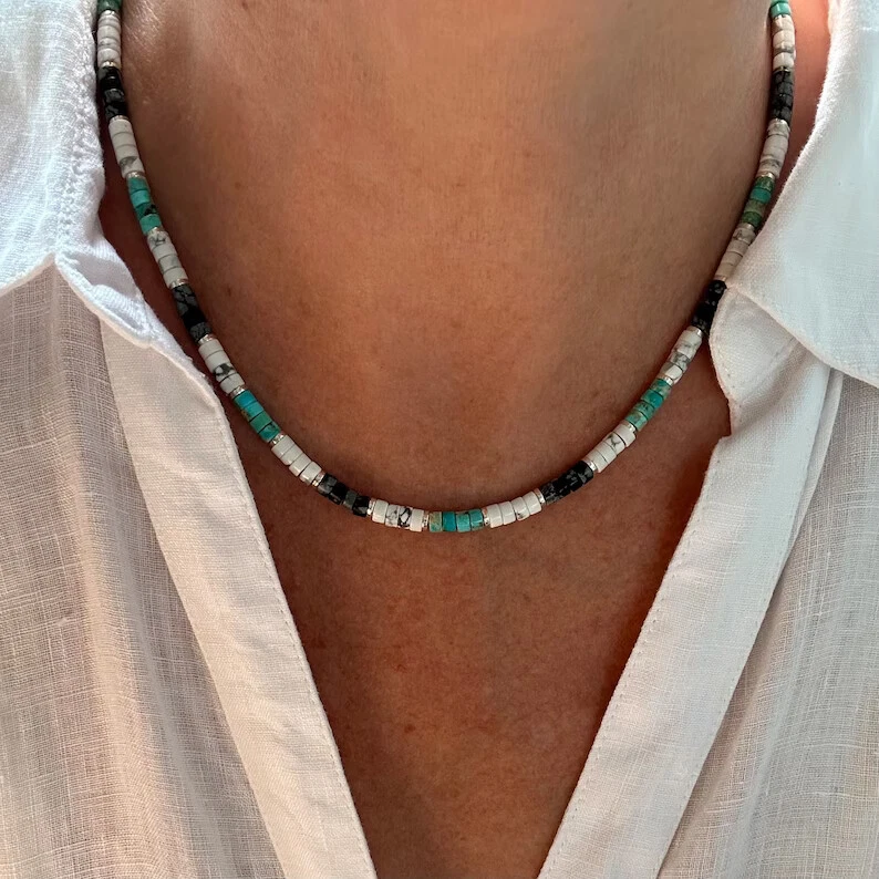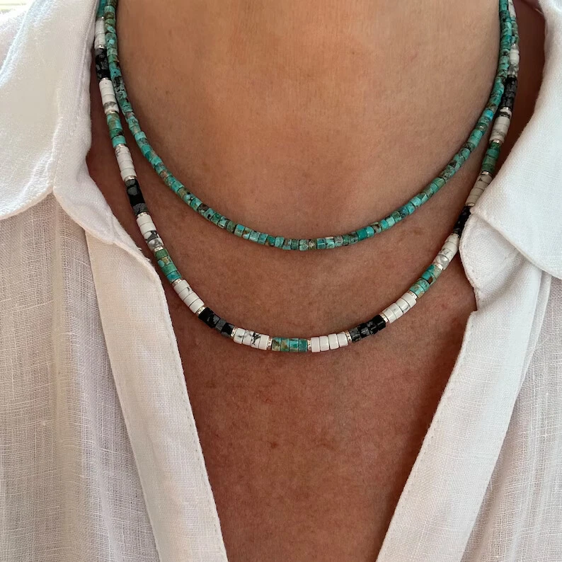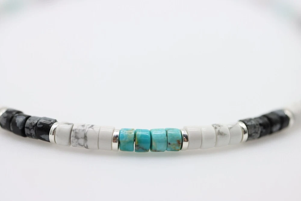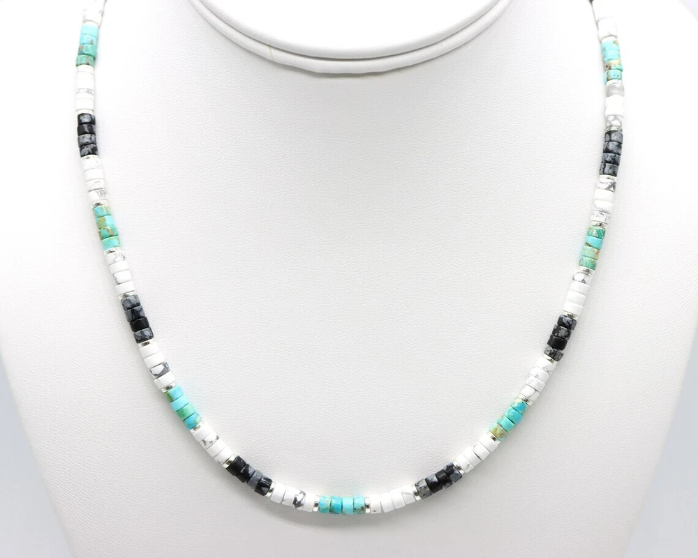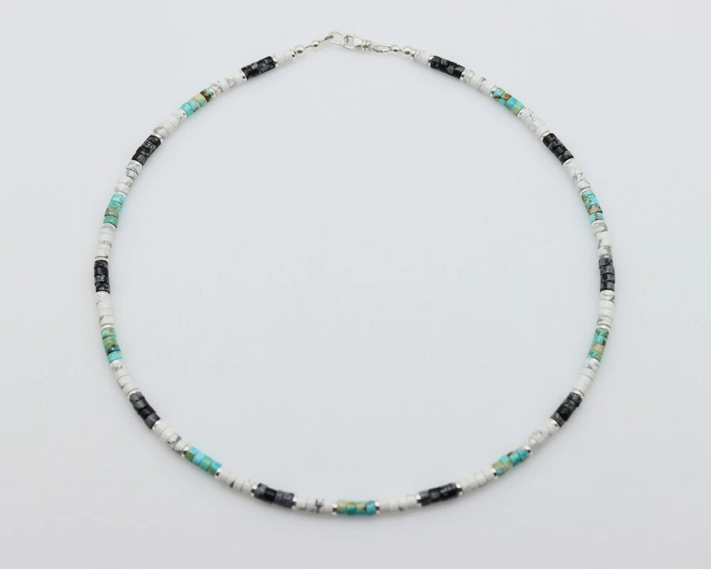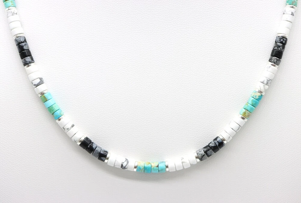 This Native American inspired beaded heishi necklace is made with natural white buffalo turquoise from Nevada, blue green turquoise from the Kingman Turquoise Mine in Kingman Arizona and black obsidian with gray highlights, and sterling silver spacer beads. The beads are uniform in size, making for a clean flowing pattern of semi precious gemstones. Modeled in both 18" and 20". The AAA grade white buffalo turquoise beads are beautiful shades of gray and white polished to a fine quality semi gloss luster that compliments that of the green turquoise and black obsidian. White Buffalo Turquoise This rare white turquoise is actually white in color while still being turquoise. It is the most spiritual of all the turquoise colors. While containing all of the colors on the spectrum, it represents enlightenment, knowledge, and transformation. As a Healing Stone, the color alone is not specific to any one chakra. Rather, it covers all of them. Blue Arizona turquoise was originally discovered by prehistoric Native Americans over 1500 years ago. The superior properties of Arizona turquoise sets the standard for quality worldwide, as all turquoise is measured against that of the southwestern USA. Arizona turquoise is known for it's pure clean colors that range from bluish green to sky blue. The many variants of green and blue turquoise are known for the finest matrix patterns of pure turquoise with often little to no markings, webbing, or matrix, making it very valuable and sought after. Arizona turquoise is mined from the many rugged copper rich mountain turquoise mines of the Arizona American Southwest. Turquoise captures the magic and mystery of the ancient Southwest. Here is a interesting fact about the color of Arizona Turquoise. The base mineral giving turquoise its beautiful blue hue is copper. It is iron that gives turquoise its green coloring. Greenish blue turquoise is most often found in the upper turquoise formations, where blue turquoise is more often found deeper within the formations. Turquoise is known to be the purification stone of peace and serenity, a gentle guiding light that inspires self-care and self-confidence. Obsidian is a volcanic mineral that forms in Volcanos. The black and gray obsidian is native to the southwestern United States. It comes from the rapid cooling of felsic lava. Obsidian is naturally black in color and has a glassy texture and a vitreous luster. There are several shades of Obsidian including rainbow, snowflake, gold, and mahogany. Obsidian is hard and was commonly used for tools. The meaning of Obsidian is safety and grounding. Dark and dreamy, the volcanic glass rock of Obsidian is a sword against negative energy and a powerful anchor for keeping you grounded in this good life. - 100% natural color, not dyed, treated or color enhanced. - Photos taken outside in natural lighting and in a light box. - No filters or color enhancements are added to the photos. The necklace is strung with premium strong 49 micro woven stainless steel beading wire with nylon coating. I use only the finest brightly polished sterling silver and gold filled findings. A large clasp that is easy to hold and open completes this necklace. I offer this in lengths; choker 14" - 28". Please select your size and finish from the drop down menu. A 2" necklace extender is included, so you can adjust the necklace and wear it at different lengths. Please message me if you would like the necklace without the extender. * Unisex styling, suitable for a man or woman and would make a perfect gift! * This necklace is completely handmade and constructed in my studio. * All pieces purchased come ready for gift-giving *Shipping on this item is within 3 days of receiving payment. *Standard Shipping to U.S. Addresses: Orders are shipped via USPS 1st class mail and per USPS guidelines, domestic delivery times range between 2-9 days, but in most cases 2-4 business days to the contiguous 48 states. *Standard Shipping to International Addresses: Orders are shipped via USPS 1st class international mail and per USPS guidelines, delivery times range between 10-21 business days. 4mm White Buffalo, Blue Arizona Turquoise, & Black Obsidian Heishi Bead Necklace, Unique Modern Boho Bead Gemstone Hippie Tribal Choker Thank you for visiting!