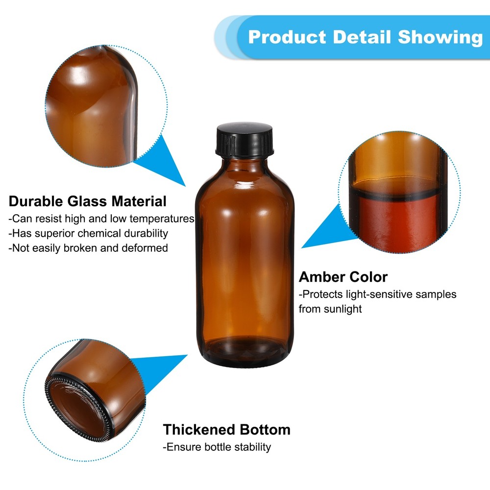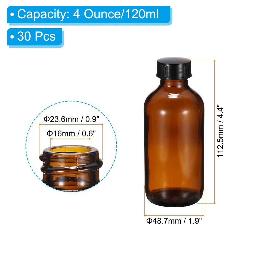 Document The round bottle is widely used in laboratories, homes, and traveling for storing or dispensing liquid such as beard oil or hair oil, essential oils, cosmetics, shampoo, conditioner, body & hand cream, lotion, or sample distribution. SpecificationCapacity: 4 Ounce/120mlOverall Size(inch): 112.5 x 48.7mm/4.4 x 1.9 Inch(H*OD)Mouth Inner Diameter: 16mm/0.6 InchMouth Outside Diameter: 23.6mm/0.9 InchColor: Amber(Bottle Body); Black(Bottle Cap)Material: Glass(Bottle Body); Plastic(Bottle Cap)Packing List: 30Pcs x Sample BottlesAdvantage1. The sample bottles are made of durable glass material that can resist high and low temperatures, has superior chemical durability, is not easily broken and deformed, and can be used for a long time. The thickened bottom of the bottle ensures bottle stability.2.Amber color protects light-sensitive samples from sunlight, extending their shelf life.3. Screw cap's tight seal reduces the risk of liquid evaporation and spills, preventing leakage of your liquid during use.InstructionTwist off the cap, pour the liquid into the bottle, and close the cap.Note: Please check the size before purchasing. Use w care to avoid breakage. 4oz(120ml) Glass Dispensing Bottle w Black Poly Cone Cap, 30Pcs, Amber The round bottle is widely used in laboratories, homes, and traveling for storing or dispensing liquid such as beard oil or hair oil, essential oils, cosmetics, shampoo, conditioner, body & hand cream, lotion, or sample distribution. Specification Capacity: 4 Ounce/120ml Overall Size(inch): 112.5 x 48.7mm/4.4 x 1.9 Inch(H*OD) Mouth Inner Diameter: 16mm/0.6 Inch Mouth Outside Diameter: 23.6mm/0.9 Inch Color: Amber(Bottle Body); Black(Bottle Cap) Material: Glass(Bottle Body); Plastic(Bottle Cap) Packing List: 30Pcs x Sample Bottles Advantage 1. The sample bottles are made of durable glass material that can resist high and low temperatures, has superior chemical durability, is not easily broken and deformed, and can be used for a long time. The thickened bottom of the bottle ensures bottle stability. 2.Amber color protects light-sensitive samples from sunlight, extending their shelf life. 3. Screw cap's tight seal reduces the risk of liquid evaporation and spills, preventing leakage of your liquid during use. Instruction Twist off the cap, pour the liquid into the bottle, and close the cap. Note: Please check the size before purchasing. Use w care to avoid breakage. Hot Item Payment 1.We accept eBay payment . 2.Payment must be received within 7 business days of auction closing. Shipping 1.We ship to your eBay or Paypal address. Please make sure your eBay and Paypal address is correct before you pay. 2.Items will be shipped within 1-3 business day when we received payment. 3.Delivery time depends on destination and other factors. Description Policy 4oz(120ml) Glass Dispensing Bottle w Black Poly Cone Cap, 30Pcs, Amber The round bottle is widely used in laboratories, homes, and traveling for storing or dispensing liquid such as beard oil or hair oil, essential oils, cosmetics, shampoo, conditioner, body & hand cream, lotion, or sample distribution. Specification Capacity: 4 Ounce/120ml Overall Size(inch): 112.5 x 48.7mm/4.4 x 1.9 Inch(H*OD) Mouth Inner Diameter: 16mm/0.6 Inch Mouth Outside Diameter: 23.6mm/0.9 Inch Color: Amber(Bottle Body); Black(Bottle Cap) Material: Glass(Bottle Body); Plastic(Bottle Cap) Packing List: 30Pcs x Sample Bottles Advantage 1. The sample bottles are made of durable glass material that can resist high and low temperatures, has superior chemical durability, is not easily broken and deformed, and can be used for a long time. The thickened bottom of the bottle ensures bottle stability. 2.Amber color protects light-sensitive samples from sunlight, extending their shelf life. 3. Screw cap's tight seal reduces the risk of liquid evaporation and spills, preventing leakage of your liquid during use. Instruction Twist off the cap, pour the liquid into the bottle, and close the cap. Note: Please check the size before purchasing. Use w care to avoid breakage. Hot Item Payment 1.We accept eBay payment . 2.Payment must be received within 7 business days of auction closing. Shipping 1.We ship to your eBay or Paypal address. Please make sure your eBay and Paypal address is correct before you pay. 2.Items will be shipped within 1-3 business day when we received payment. 3.Delivery time depends on destination and other factors.