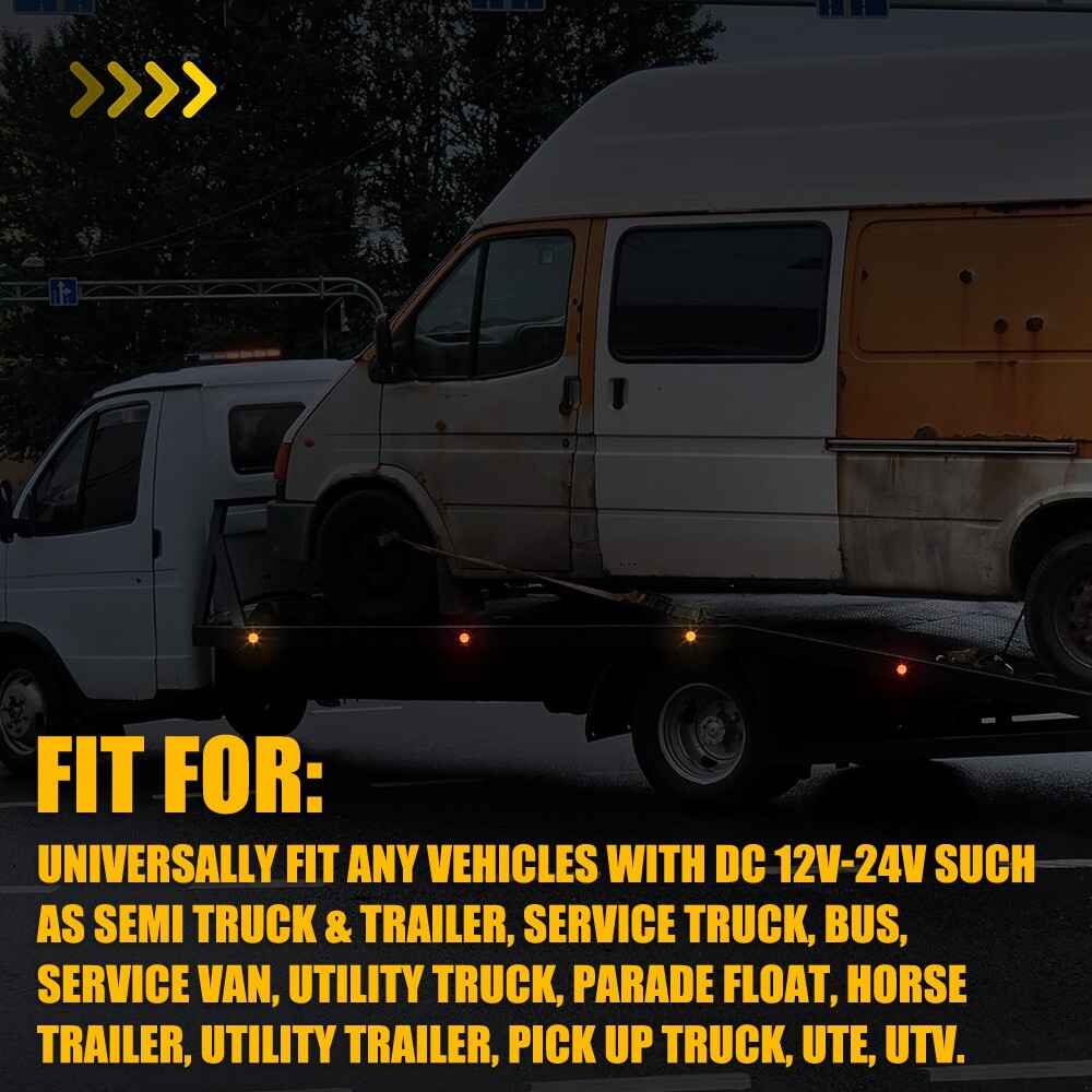 Fit for: Universally fit any vehicles with DC 12V-24V Such as Semi Truck & Trailer, Service Truck, Bus, Service Van, Utility Truck, Parade Float, Horse Trailer, Utility Trailer, Pick Up Truck, UTE, UTV. Specifications: Product Material: ABS+PC Lens Color: Amber Light Color: Amber Wiring Mode: White wire: Negative Black wire: Positive Voltage: 12-24V DC Connector Type: Pigtail Mounting Type: Flush-Mount Waterproof Grade: IP67 Lifespan: 50,000h+ Features: *High Brightness Each LED tail light is bright enough and energy-saving. *Superior Quality 4pc 2.5'' DOT Round Amber LED Trailer Side Marker Lights with Grommet for Truck Fit for: Universally fit any vehicles with DC 12V-24V Such as Semi Truck & Trailer, Service Truck, Bus, Service Van, Utility Truck, Parade Float, Horse Trailer, Utility Trailer, Pick Up Truck, UTE, UTV. Specifications: Product Material: ABS+PC Lens Color: Amber Light Color: Amber Wiring Mode: White wire: Negative Black wire: Positive Voltage: 12-24V DC Connector Type: Pigtail Mounting Type: Flush-Mount Waterproof Grade: IP67 Lifespan: 50,000h+ Features: *High Brightness Each LED tail light is bright enough and energy-saving. *Superior Quality Made of high-quality material to ensure its low energy consumption, good waterproof and shock resistance. *Waterproof The tail light has an IP67 waterproof rate, which works even under extreme conditions such as rain and snow. *Wide Application This pair of LED tail lights can be used in any vehicle with DC 12V-24V, such as Semi Truck & Trailer, Service Truck, Bus, Service Van, Utility Truck, Parade Float, Horse Trailer, Utility Trailer, Pick Up Truck, UTE, UTV. *Warm Notice Please check the detailed information of the product carefully before purchasing. Packaging Include: 4 x 2.5" Round 13 LED Clearance Side Marker Light 4 x 2.5" Round Black Grommet 4 x 2-Pin 90° Plugs connector Item Specifics Brand AUXITO Light Color Amber Voltage 12 V Wattage 1 W Features DOT-Certified SAE-Certified Sealed Assembly Lens Color Amber Lighting Technology LED Material ABS PC Type Tail Light Assembly Universal Fitment Yes Manufacturer Warranty 1 Year Payment Returns DESCRIPTION PAYMENT SHIPPING RETURN POLICY CONTACT US Shop Category Store Home LED Headlight ◈ H4 ◈ H13 LED Reverse Light ◈ T15/921/W16W LED Side Marker Light Car Parts & Accessories Tail Light assemblies Other Hot Item Picture New List Item AUXITO H11 H9 Super Bright White LED Headlight Bulbs Conversion Kit High Beam Y9 USD 45.99 AUXITO H11 LED Headlight Low High Beam 600% Super Bright 6500K White Bulbs 2Set USD 66.99 H15 LED Headlight High Beam DRL Bulbs For Mercedes-Benz Sprinter 2500 2019-2020 USD 38.99 AUXITO H11 H8 LED Headlight Kit High Low Beam Bulb Super Bright 30000lm Canbus USD 35.99 AUXITO 9005 High Beam LED Headlights White Bulbs 100W Fanless Kit 300% Brighter USD 29.99 Help & Info Payment Policy Shipping Policy Return Policy FAQ About Us 4pc 2.5'' DOT Round Amber LED Trailer Side Marker Lights with Grommet for Truck Fit for: Universally fit any vehicles with DC 12V-24V Such as Semi Truck & Trailer, Service Truck, Bus, Service Van, Utility Truck, Parade Float, Horse Trailer, Utility Trailer, Pick Up Truck, UTE, UTV. Specifications: Product Material: ABS+PC Lens Color: Amber Light Color: Amber Wiring Mode: White wire: Negative Black wire: Positive Voltage: 12-24V DC Connector Type: Pigtail Mounting Type: Flush-Mount Waterproof Grade: IP67 Lifespan: 50,000h+ Features: *High Brightness Each LED tail light is bright enough and energy-saving. *Superior Quality Made of high-quality material to ensure its low energy consumption, good waterproof and shock resistance. *Waterproof The tail light has an IP67 waterproof rate, which works even under extreme conditions such as rain and snow. *Wide Application This pair of LED tail lights can be used in any vehicle with DC 12V-24V, such as Semi Truck & Trailer, Service Truck, Bus, Service Van, Utility Truck, Parade Float, Horse Trailer, Utility Trailer, Pick Up Truck, UTE, UTV. *Warm Notice Please check the detailed information of the product carefully before purchasing. Packaging Include: 4 x 2.5" Round 13 LED Clearance Side Marker Light 4 x 2.5" Round Black Grommet 4 x 2-Pin 90° Plugs connector Payment Returns All rights reserved. On Feb 11, 2025 at 19:27:37 PST, seller added the following information: