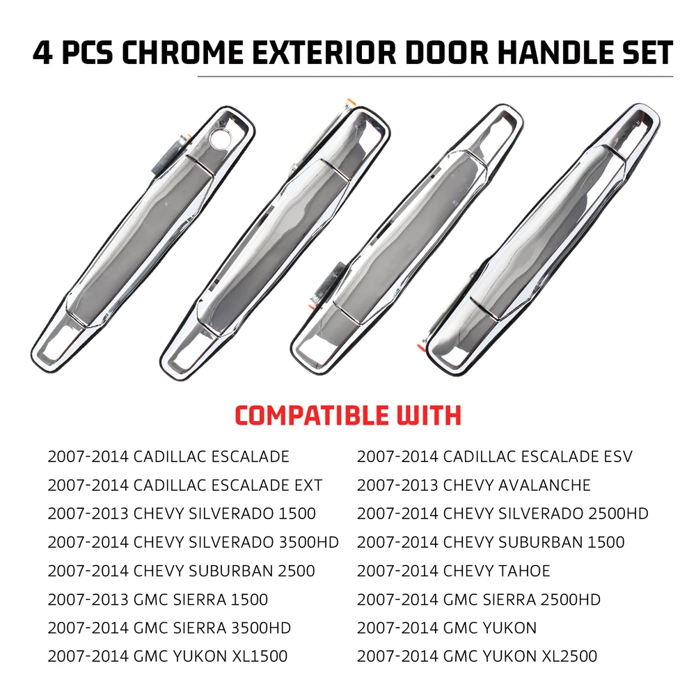 Description: 100% Brand New Color:Silver 100% Chrome plated Durable construction Direct replacements Built to strict quality control standards Replace Part Number: 15915660, 22738726, 25960522, 15915150, 22738722, 25960526, 80547, 80105, 80546, 80545, 22738721, 25960525 Direct Fit without Alterations or Modifications Professional installation in highly recommended (No instruction included) Packages includes: Breezesew Best choice of motor parts 4pc Exterior Door Handles Set Chrome for 07-14 Tahoe Silverado Yukon Escalade US Description: 100% Brand New Color:Silver 100% Chrome plated Durable construction Direct replacements Built to strict quality control standards Replace Part Number: 15915660, 22738726, 25960522, 15915150, 22738722, 25960526, 80547, 80105, 80546, 80545, 22738721, 25960525 Direct Fit without Alterations or Modifications Professional installation in highly recommended (No instruction included) Packages includes: 1x Exterior Front, Left Side door handle 1x Exterior Front, Right Side door handle 1x Exterior Rear, Left Side door handle 1x Exterior Rear, Right Side door handle Compatible with: 2007-2013 Chevrolet Avalanche 2007-2014 Cadillac Escalade 2007-2014 Cadillac Escalade ESV 2007-2013 Cadillac Escalade EXT 2007-2013 GMC Sierra 1500 2007-2014 GMC Sierra 2500 HD 2007-2014 GMC Sierra 3500 HD 2007-2013 Chevrolet Silverado 1500 2007-2014 Chevrolet Silverado 2500 HD 2008-2013 Chevrolet Silverado 3500 2007-2014 Chevrolet Silverado 3500 HD 2007-2014 Chevrolet Suburban 1500 2007-2013 Chevrolet Suburban 2500 2007-2014 Chevrolet Tahoe 2007-2014 GMC Yukon 2007-2014 GMC Yukon XL 1500 2007-2013 GMC Yukon XL 2500 Note: For 2007 Silverado / Sierra models, the Classic Style has a crease down the center of the door skin where on the new body styles, the door skin is smooth. This part is for the new body style truck. Installation Steps: Step 1 Remove the door inner panel, do not damage your car interior decoration, search for panel labels or screws. Step 2 Next, carefully remove any water diversion cardboard covering the handle area. Step 3 Remove any linkages from your existing door handles, make sure to note all connections, and check the owner’s manual when disassembling and reconnecting. Step 4 Open the door handle and remove it from the door. Step 5 Replace your new handle and install it where the handle is. Reconnect your linkage, replace other non-compliant parts and replace the door panel. Warm tips: 1. Please kindly confirm the fitment before ordering to make sure this item is perfectly fit. 2. It is easy to install, but professional installation is always recommended. 3. Any questions please send us eBay message. Item Specifics Brand Modigt Type Door Handle Color Silver Placement on Vehicle Front, Rear, Left, Right Side Features 1 Anti-Stain, Durable, Easy Installation, Key Lock Finish Chrome Material Chrome Features 2 Matching Appearance, Remote Lock, Scratch-Resistant Manufacturer Part Number 22738721, 22738722, 22738725, 22738726 OEM Replacement 80547,80105,80546,80545,25960525, 25960526 Superseded Part Number 80545,15915150,25960526,80546,20828258, 25960525 Fitment Type Direct Replacement Attachment Type Bolt-On Interchange Part Number 15915660P,22738726P,25960522P,15915150P,22738722P,25960526P Items Included 4X Exterior Door Handle Front/Rear Left/Right OE Spec or Performance/Custom OE Spec Manufacturer Warranty 2 Years Other Part Number 15915659,22738725,25960521,20828258,22738721,25960525 Fit for for 07-13 Chevy GMC Avalanche Silverado Sierra Number of Pieces 4 Payment 1. It will be much appreciated that you finish your payment asap or it will make UPI (unpaid item case) on your account leading to be suspended or restricted by eBay when those UPI cases carry over to certain amount. 2. Any problems please contact us for more details. Shipping 1. All items will be shipped to buyer's ebay address. 2. All items will be shipped within 24-48 working hours upon receipt of payment, and multiple items will be combined shipping. 3. In most cases, delivery takes around 3-5 business days, it's highly depended on the efficiency of the shpping carrier. If your item doesn't arrive on time, please contact us immediately for further assistance. Please note there is no local pickup service available. Returns If you are not 100% satisfied with your purchase, you can return the product and get a full refund or exchange the product for another one. Please Note: Please write us a message before your return, otherwise we will not accept the package. Any product you return must be in the same condition you received it and in the original packaging. Contact Us 1. We care about our valued buyers, if you have any questions, our Customer Service staff will be very glad to help you. We try our best to reply your ebay message as soon as possible, please kindly allow 24 hours for us to response. 2. Our goal is to make sure you are a happy buyer and pleasant shopping with us. Please contact us before leaving any 1 or 2 star ratings, negative feedback or open any dispute. We understand the concerns and frustrations you might have, and will do our endeavor to resolve the issues. Breezesew Best choice of motor parts 4pc Exterior Door Handles Set Chrome for 07-14 Tahoe Silverado Yukon Escalade US Description: 100% Brand New Color:Silver 100% Chrome plated Durable construction Direct replacements Built to strict quality control standards Replace Part Number: 15915660, 22738726, 25960522, 15915150, 22738722, 25960526, 80547, 80105, 80546, 80545, 22738721, 25960525 Direct Fit without Alterations or Modifications Professional installation in highly recommended (No instruction included) Packages includes: 1x Exterior Front, Left Side door handle 1x Exterior Front, Right Side door handle 1x Exterior Rear, Left Side door handle 1x Exterior Rear, Right Side door handle Compatible with: 2007-2013 Chevrolet Avalanche 2007-2014 Cadillac Escalade 2007-2014 Cadillac Escalade ESV 2007-2013 Cadillac Escalade EXT 2007-2
