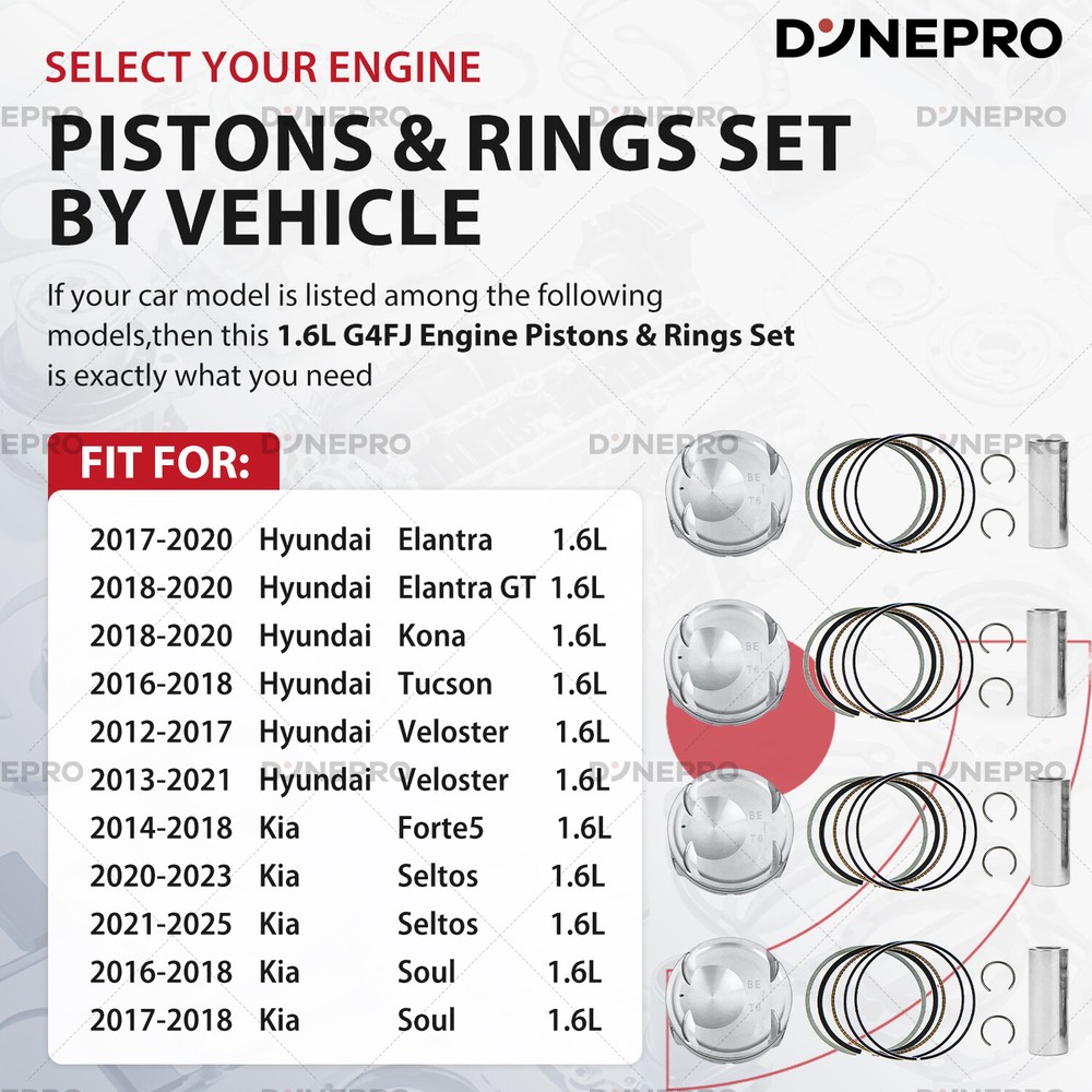 Engine Parts Installation Guide About Us Contact Us Feedback Description: 1) All parts are hand inspected off the line before packaging and once again by our team before shipment. 2) According to the original factory specifications. 3) Perfect match for the original car. 4) Easy installation. 5) Stable characteristics, high reliability. 6) Aftermarket Products with Premium Quality. Features: ·Fast shipping and good operation ·Total new and high quality ·Direct Replacement Replace Part Number: 23041 2BAA0, 23040-2BAA0,23410-2BCA0, 23410 2BCA0, 23041-2BAC0, 230412BAC0, 230402BAA0, 234132E000, 234122B200 Fitment For: 2017-2019 KIA SOUL 1.6T 2014-2018 KIA FORTE 5 1.6T 2014-2017 KIA FORTE KOUP 1.6T 2017-2020 HYUNDAI ELANTRA 1.6T 2018-2020 HYUNDAI ELANTRA GT 1.6T Compatiable With: For G4FJ 1.6L Engine Only!!! Hyundai Accent Verna (RB/RC) (2011–2017) Hyundai Elantra (AD) (2017–2020) Hyundai i30 (GD) (2015–2016) Hyundai i30 (PD) (2016–present) Hyundai Kona (OS) (2017–2020, detuned) Hyundai Lafesta (2018–2022) Hyundai Mistra (CF) (2017–2020) Hyundai Sonata (LF) (2014–2019, detuned) Hyundai Tucson (TL) (2015-2020, detuned) Hyundai Veloster (FS) (2012–2018) Hyundai Veloster (JS) (2018–2020) Kia Cee'd (JD) (2012–2018) Kia Ceed (CD) (2018–present) Kia Forte/K3 (2012–present) Kia K4 (2014–2021) Kia KX3 (KC) (2015–2019) Kia Optima/K5 (JF) (2015–2019) Kia Seltos (SP2) (2019–2022 detuned) Kia Soul (SK3) (2019–present) Kia Sportage (QL) (2015–2021) Package Included(STD SIZE): 1 Set x Pistons & Rings Kit (as picture shown) Learn More Learn More Learn More PAYMENT We accept eBay managed payments for all orders. If you have any questions, please contact us. SHIPPING Ordering this kit requires additional information: the vehicle engine model as well as the VIN (17 digits), and also requires you to verify a match to your vehicle using the vehicle application data on Ebay. Be sure to provide this information when placing your order or via a separate message. Product will be shipped within 1-3 business days after full payment is received and verified. Delivery Time is about 3-7 business days to most of countries. We ship the package to your shipping address in eBay instead of the one in PayPal. Please tell us your shipping address if it is different from the one in eBay. RETURNS We offer eBay's best return policy. If you utilized Ebay's fitment and the parts you received do not fit your vehicle, we will pay to have them returned. Should you desire to return this kit for any other reason, Includes kits that are incorrect because you did not provide the VIN in the order notes, you will be responsible for return shipping. These kits are heavier and cost more to ship, so we ask that you provide vehicle information and verify suitability before ordering.Unfortunately, we cannot accept returns from international customers at this time. ★★★★★ So far the engine overhaul kit has performed well. I love the performance with this kit installed. On my 2004 F150. Installation was easy. Everything is perfect. Considering this kit is cheap, it doesn't get any better than this. ----James ★★★★★ This was a great price. lt was made in the USA. After 10,000 miles it is running great. ----Liam ★★★★★ As of the time of this review this is well worth the money and it fits as it should. ----Noah ★★★★★ This set was installed perfect fit. lt has been installed on a truck that has been used very much every day. Working perfect and so much cheaper than the auto stores. ----Ethan ★★★★★ Seemed to be a perfect replacement part and it works. ----Oliver ★★★★★ Everything fit how it was supposed to and have been driving it for a week with no problems. ----Benjamin ★★★★★ The seller was very nice and provided me with professional advice on the installation, which was a breeze and is still going strong after 10,000 miles. ----Michael