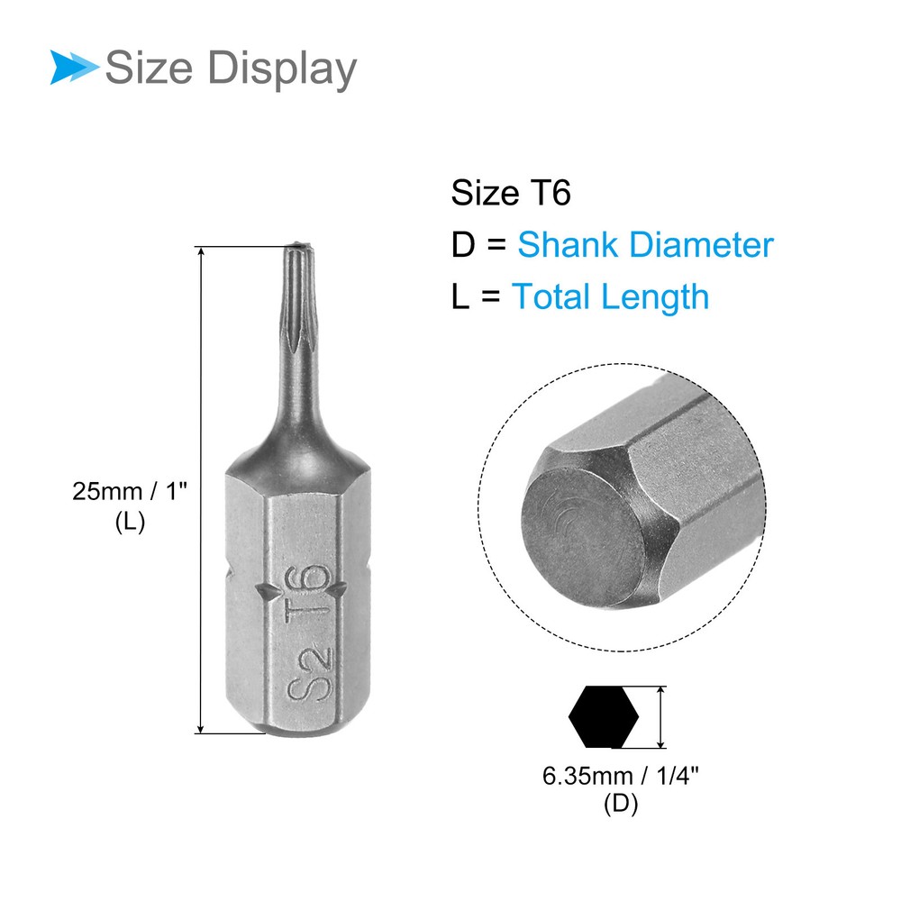 Document Attributes:* Shank Size: 1/4"* Total Length: 25mm / 1"* Bit Type: T6 * Material: S2 SteelWhat Is Included:* 4 Piece x Torx Screwdriver BitApplications & Features:--- Those bits fit for electric screwdrivers, hand screwdrivers, electric drills, air drills, air batches and 1/4" screwdriver sets.--- The torx screwdriver bits are made of S2 steel, which ensures high hardness, durability and wear resistance.--- These screwdriver bits are magnetic, which can firmly absorb the screw to prevent it from falling off.--- The star head bits are easy to install on the screwdriver handle with double ear on the sides of the bit shank.Useful Tips:--- Please apply appropriate force. Excessive force may cause the bit to slip, while insufficient force may not effectively tighten or remove the screw. 4pcs Torx Screwdriver Bits 1/4" Hex Shank 25mm Long T6 Magnetic Screwdrivers Bit Attributes: * Shank Size: 1/4" * Total Length: 25mm / 1" * Bit Type: T6 * Material: S2 Steel What Is Included: * 4 Piece x Torx Screwdriver Bit Applications & Features: --- Those bits fit for electric screwdrivers, hand screwdrivers, electric drills, air drills, air batches and 1/4" screwdriver sets. --- The torx screwdriver bits are made of S2 steel, which ensures high hardness, durability and wear resistance. --- These screwdriver bits are magnetic, which can firmly absorb the screw to prevent it from falling off. --- The star head bits are easy to install on the screwdriver handle with double ear on the sides of the bit shank. Useful Tips: --- Please apply appropriate force. Excessive force may cause the bit to slip, while insufficient force may not effectively tighten or remove the screw. Hot Item Payment 1.We accept eBay payment . 2.Payment must be received within 7 business days of auction closing. Shipping 1.We ship to your eBay or Paypal address. Please make sure your eBay and Paypal address is correct before you pay. 2.Items will be shipped within 1-3 business day when we received payment. 3.Delivery time depends on destination and other factors. Description Policy 4pcs Torx Screwdriver Bits 1/4" Hex Shank 25mm Long T6 Magnetic Screwdrivers Bit Attributes: * Shank Size: 1/4" * Total Length: 25mm / 1" * Bit Type: T6 * Material: S2 Steel What Is Included: * 4 Piece x Torx Screwdriver Bit Applications & Features: --- Those bits fit for electric screwdrivers, hand screwdrivers, electric drills, air drills, air batches and 1/4" screwdriver sets. --- The torx screwdriver bits are made of S2 steel, which ensures high hardness, durability and wear resistance. --- These screwdriver bits are magnetic, which can firmly absorb the screw to prevent it from falling off. --- The star head bits are easy to install on the screwdriver handle with double ear on the sides of the bit shank. Useful Tips: --- Please apply appropriate force. Excessive force may cause the bit to slip, while insufficient force may not effectively tighten or remove the screw. Hot Item Payment 1.We accept eBay payment . 2.Payment must be received within 7 business days of auction closing. Shipping 1.We ship to your eBay or Paypal address. Please make sure your eBay and Paypal address is correct before you pay. 2.Items will be shipped within 1-3 business day when we received payment. 3.Delivery time depends on destination and other factors.