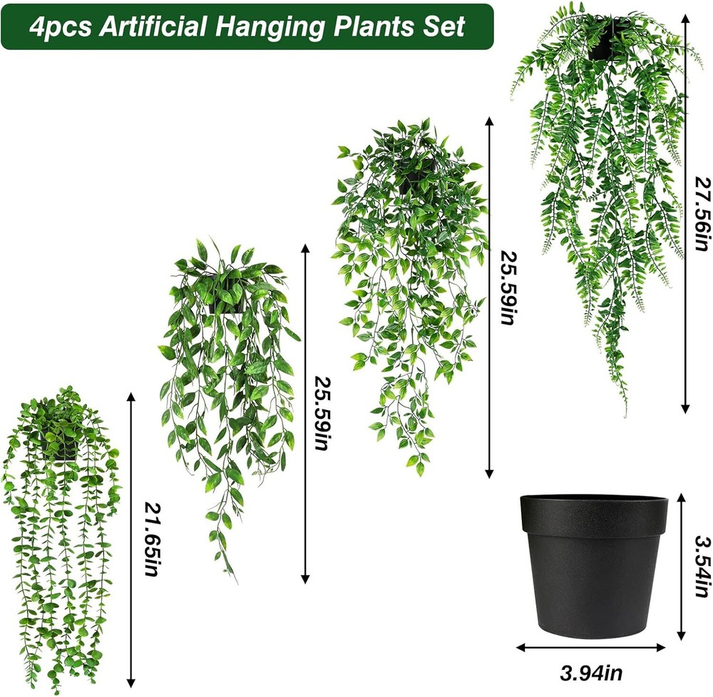 4pcs Artificial Hanging Plants Fake Hanging Plants Potted Greenery Faux Persian Package Contains: 4 Pack potted fake hanging plants, which are eucalyptus vine, snow peas vine, mandala vine, and Persian Fern. The length of the eucalyptus ivy is about 21.65”, and the length of the other three potted plants is about 25.59inches. Lifelike Appearance: The vines and leaves are clearly created for a vivid texture and appearance. The shrubs are lush and green, which sustain the feeling of spring and nature. Harmonized Set: These four fake potted plants are carefully selected. They look harmonized while put together. You could also place them separately. Easy to Care: Compared with real plants, these fake hanging plants do not need to trim or water. They will not fade and would keep fresh-looking all of the year. It is perfect for people who are busy and have no time to take care of real plants. Shipping We offer FREE shipping on all orders! We ship within Three business days of payment, usually sooner. We use a selection of shipping services such as UPS, FedEx, USPS etc. We only ship to the lower 48 states, no APO/FPO addresses or PO Boxes allowed. Local pickups and combined shipping options are not provided at this time. Return You can return a product for up to 30 days from the date you purchased it. Any product you return must be in the same condition you received it and in the original packaging. Please keep the receipt. Customer satisfaction is very important to us. If you have any problem with your order, please contact us and we will do our best to make you satisfied. Contact Us If you have any queries, please contact us via ebay. We usually respond within 24 hours on weekdays. Please visit our eBay store to check out other items for sale! Thank you for shopping at our store.